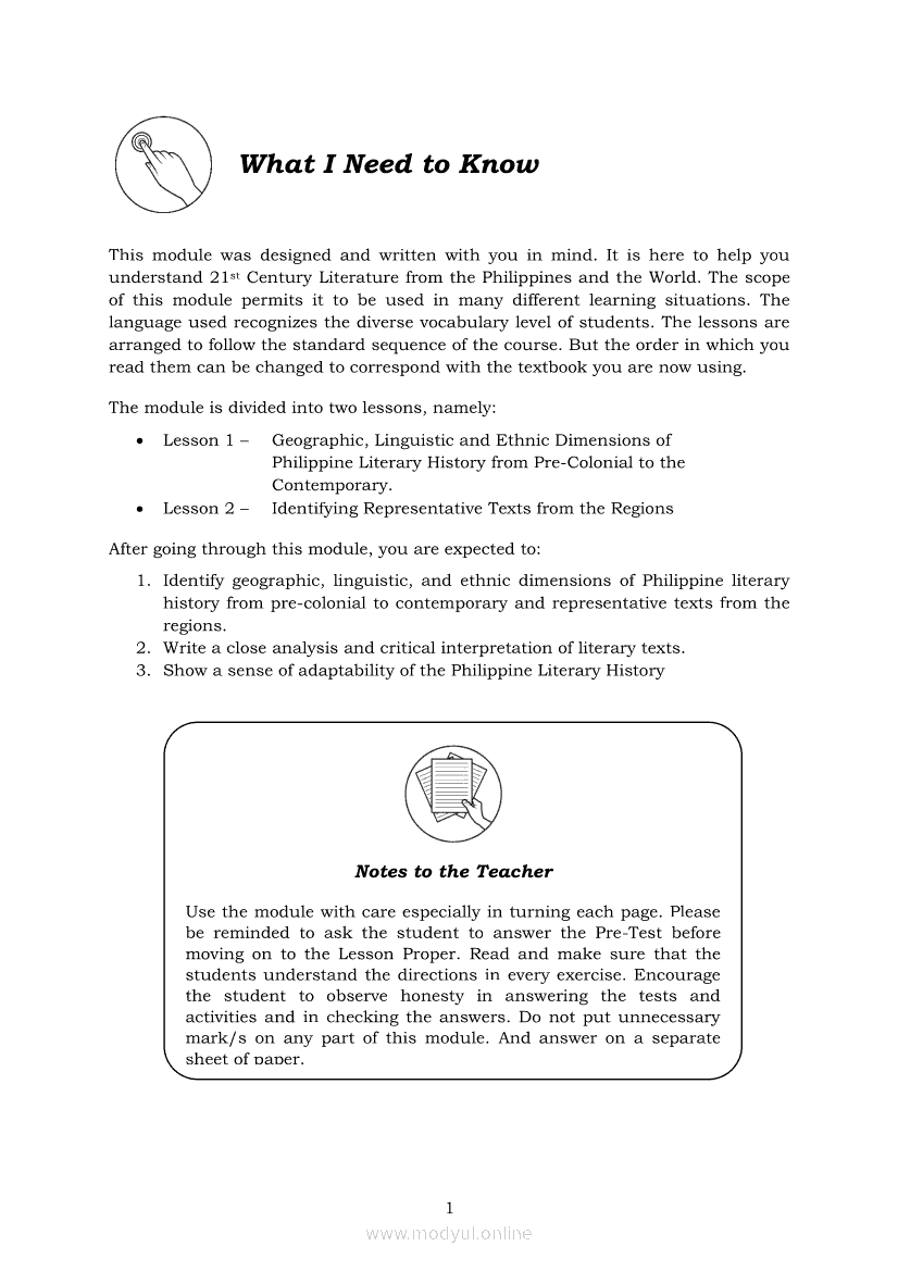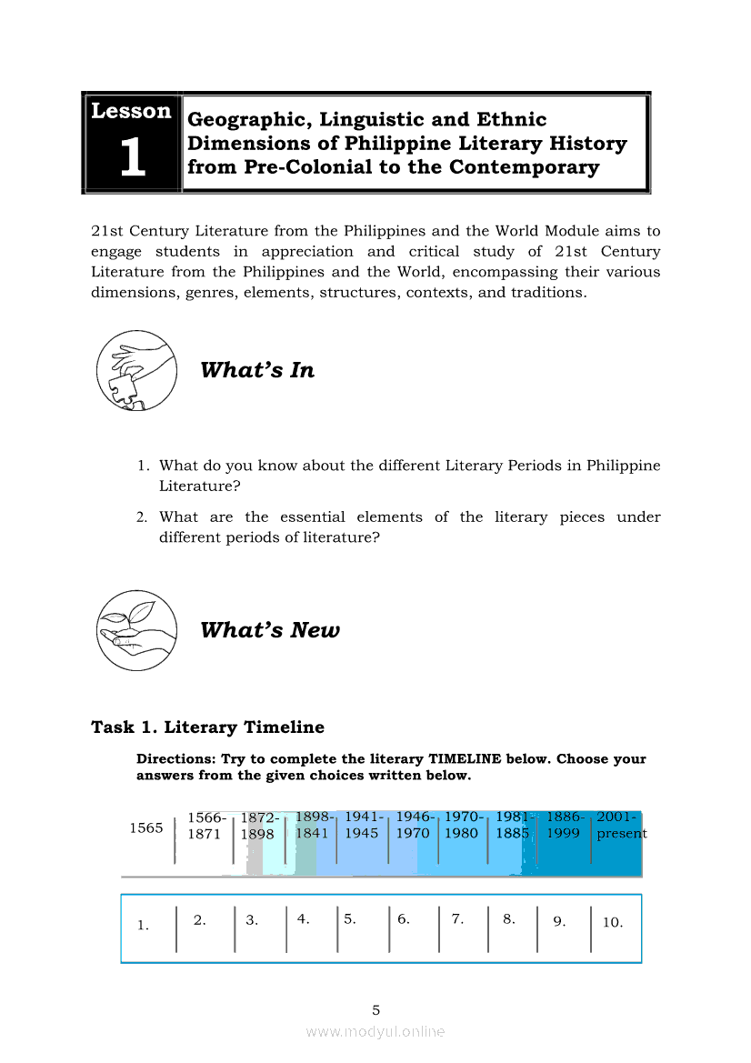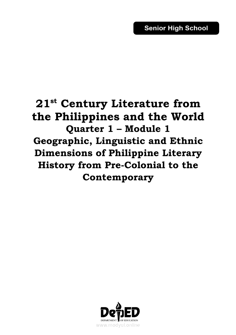 21st Century Literature from the Philippines and the World Module 1: Geographic, Linguistic and Ethnic Dimensions of Philippine Literary History from Pre-Colonial to the ContemporaryApr 22, 2021 SHSGrab your copy of Collegio Advance - ULTIMATE Updated College Entrance Exam Reviewer and pass with flying colors 🎉. 21st Century Literature from the Philippines and the WorldRelated21st Century Literature from the Philippines and the World Module 5: Elements of a Short Story21st Century Literature from the Philippines and the World Quarter 2 – Module 8: Creative Literary Adaptations21st Century Literature from the Philippines and the World Quarter 2 – Module 9: Flash Fiction: The Plot21st Century Literature from the Philippines and the World Module 2: Conventional and 21st Century Genres21st Century Literature from the Philippines and the World Module 3: Context and Text’s Meaning