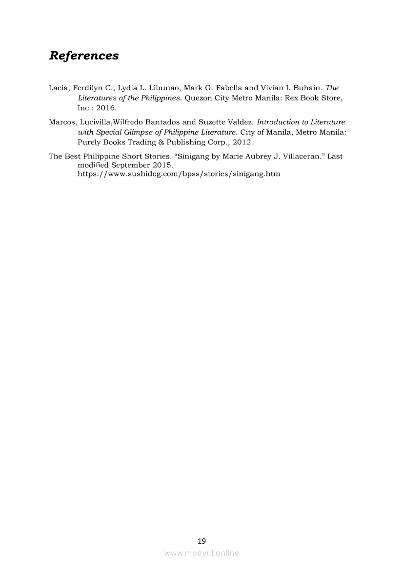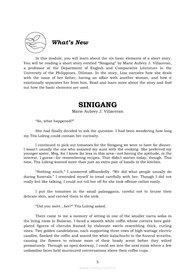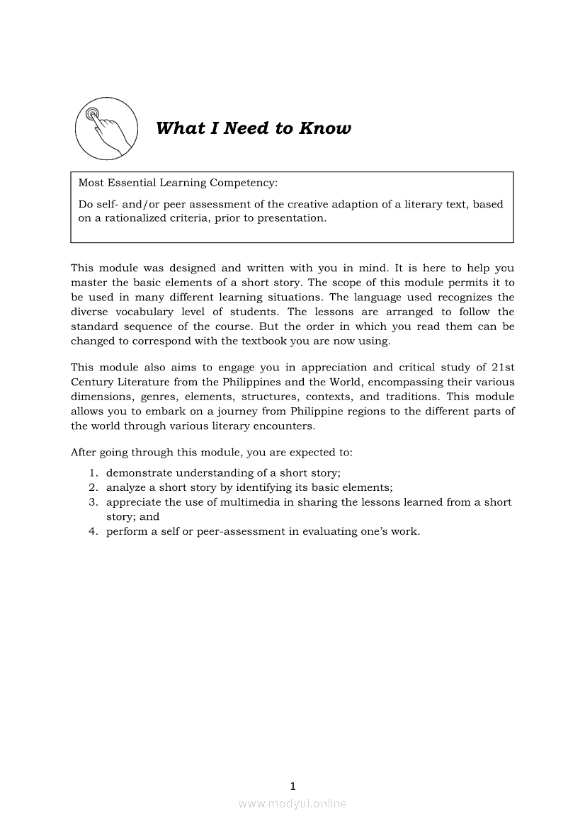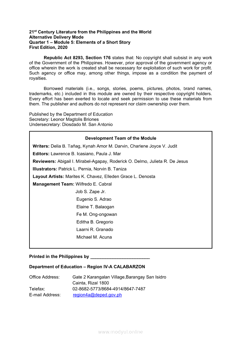 21st Century Literature from the Philippines and the World Module 5: Elements of a Short StoryApr 22, 2021 SHSGrab your copy of Collegio Advance - ULTIMATE Updated College Entrance Exam Reviewer and pass with flying colors 🎉. 21st Century Literature from the Philippines and the WorldRelated21st Century Literature from the Philippines and the World Module 3: Context and Text’s Meaning21st Century Literature from the Philippines and the World Quarter 2 – Module 9: Flash Fiction: The Plot21st Century Literature from the Philippines and the World Module 1: Geographic, Linguistic and Ethnic Dimensions of Philippine Literary History from Pre-Colonial to the Contemporary21st Century Literature from the Philippines and the World Module 4: Creative Representation of a Literary Text21st Century Literature from the Philippines and the World Quarter 2 – Module 6: Writing a Close Analysis and Critical Interpretation of Literary Texts Applying a Reading Approach