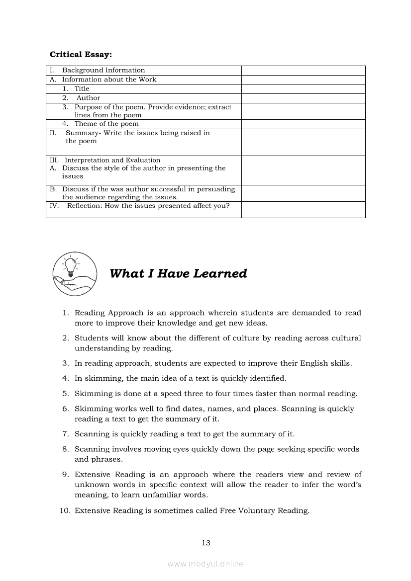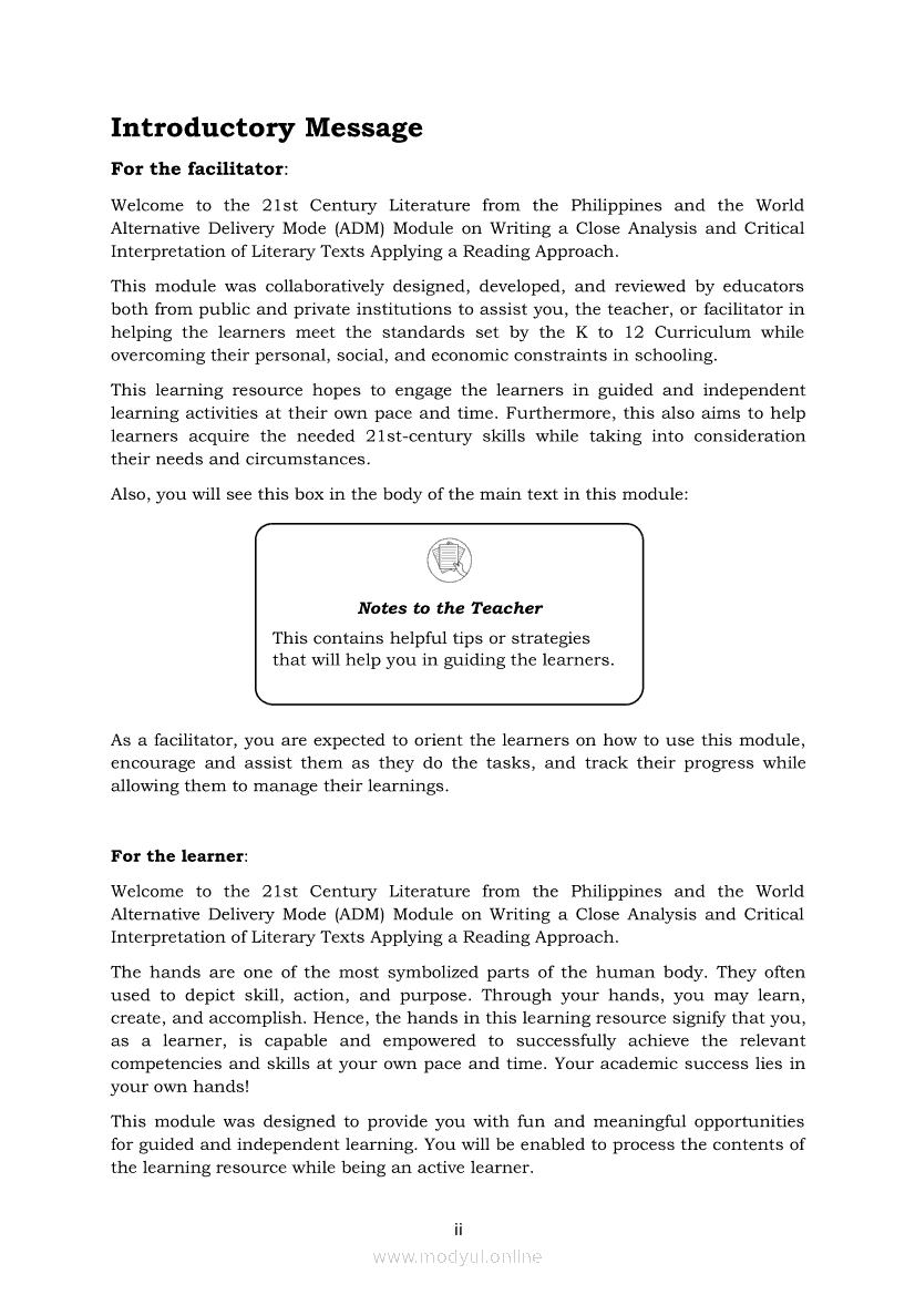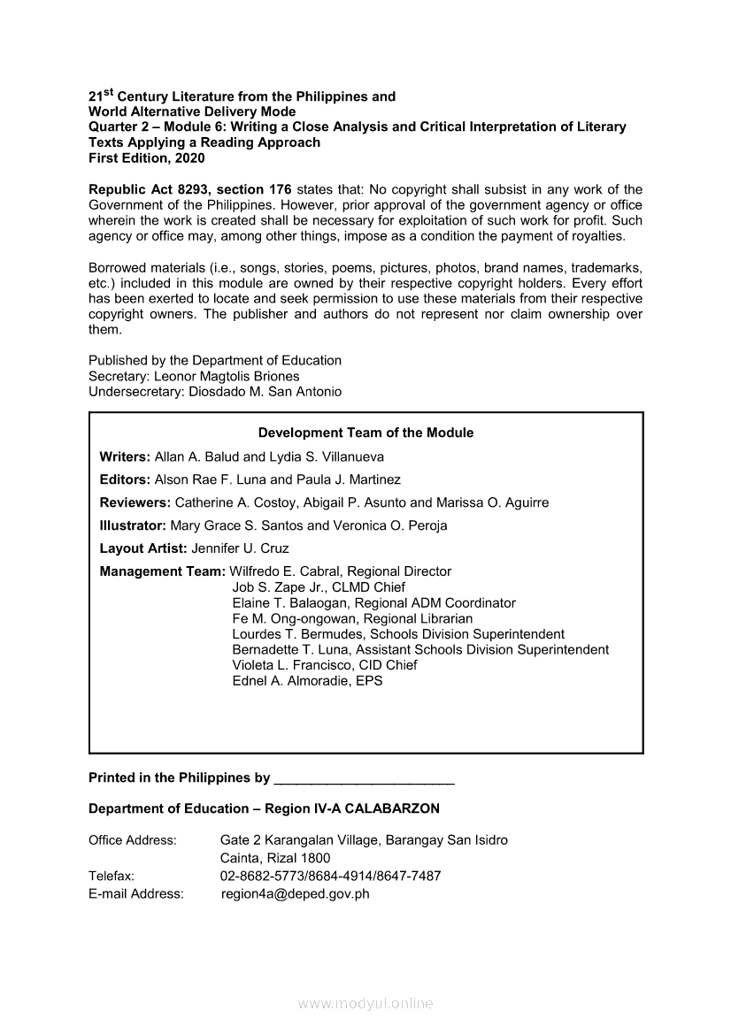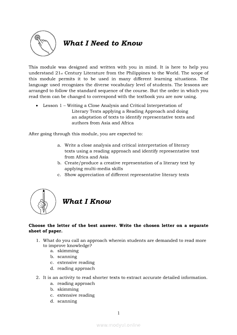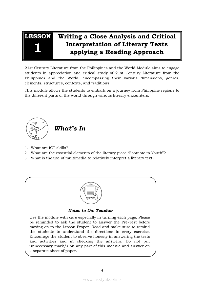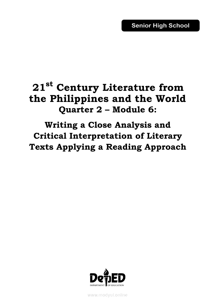 21st Century Literature from the Philippines and the World Quarter 2 β Module 6: Writing a Close Analysis and Critical Interpretation of Literary Texts Applying a Reading ApproachApr 22, 2021 SHSGrab your copy of Collegio Advance - ULTIMATE Updated College Entrance Exam Reviewer and pass with flying colors π. 21st Century Literature from the Philippines and the WorldRelated21st Century Literature from the Philippines and the World Module 3: Context and Textβs Meaning21st Century Literature from the Philippines and the World Quarter 2 β Module 7: Differentiating 21st Century Literary Genres21st Century Literature from the Philippines and the World Module 1: Geographic, Linguistic and Ethnic Dimensions of Philippine Literary History from Pre-Colonial to the Contemporary21st Century Literature from the Philippines and the World Module 4: Creative Representation of a Literary Text21st Century Literature from the Philippines and the World Module 2: Conventional and 21st Century Genres