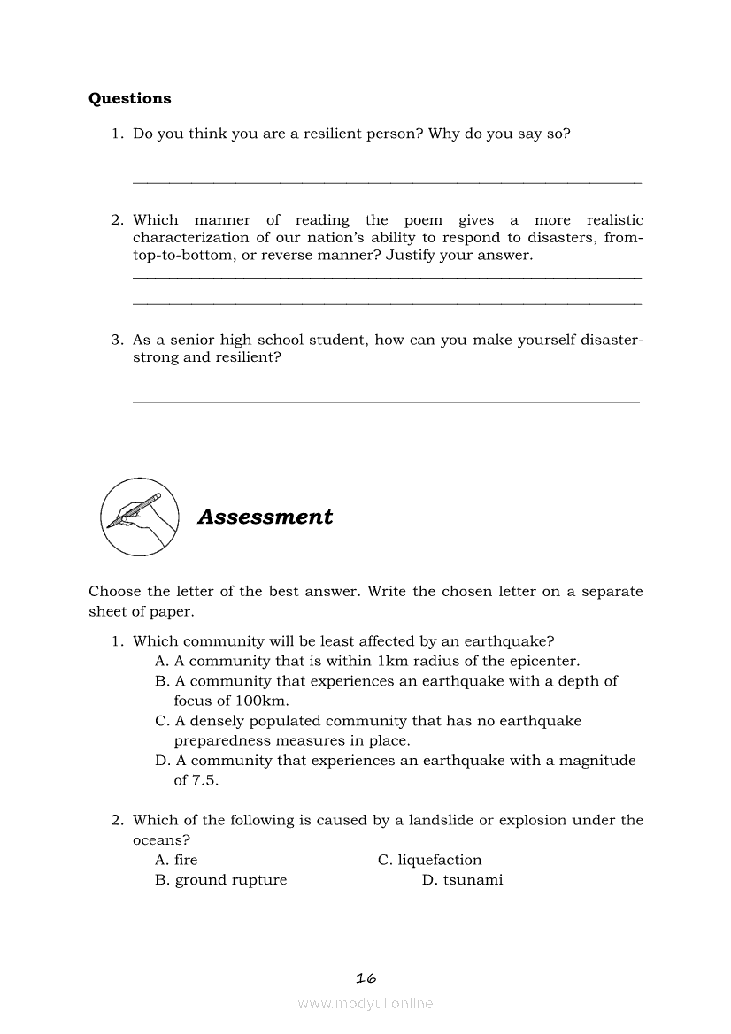 Disaster Readiness and Risk Reduction Module 14: Interpret Earthquake Hazard MapApr 22, 2021 SHSGrab your copy of Collegio Advance - ULTIMATE Updated College Entrance Exam Reviewer and pass with flying colors 🎉. Disaster Readiness and Risk ReductionRelatedDisaster Readiness and Risk Reduction Quarter 2 – Module 2: Causes of Other Related Geological HazardsDisaster Readiness and Risk Reduction Quarter 2 – Module 8: Monitoring tools for Hydrometeorological HazardsDisaster Readiness and Risk ReductionQuarter 2 – Module 19: Policies of DRRM - The Philippine DRRM Law RA 10121 and Its Implementing Rules and RegulationsDisaster Readiness and Risk Reduction Quarter 2 – Module 9 The Elements of Fire TriangleDisaster Readiness and Risk Reduction Module 4: Disasters from Different Perspectives