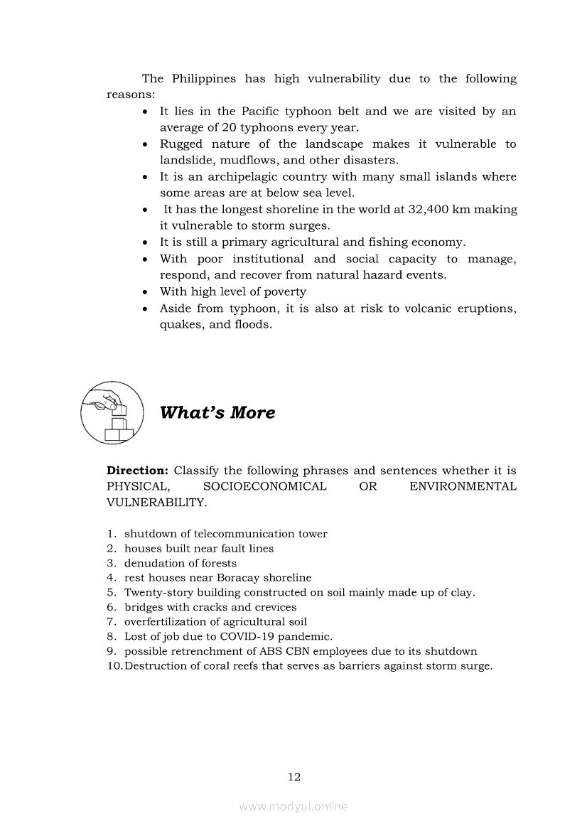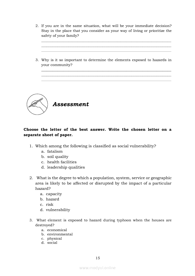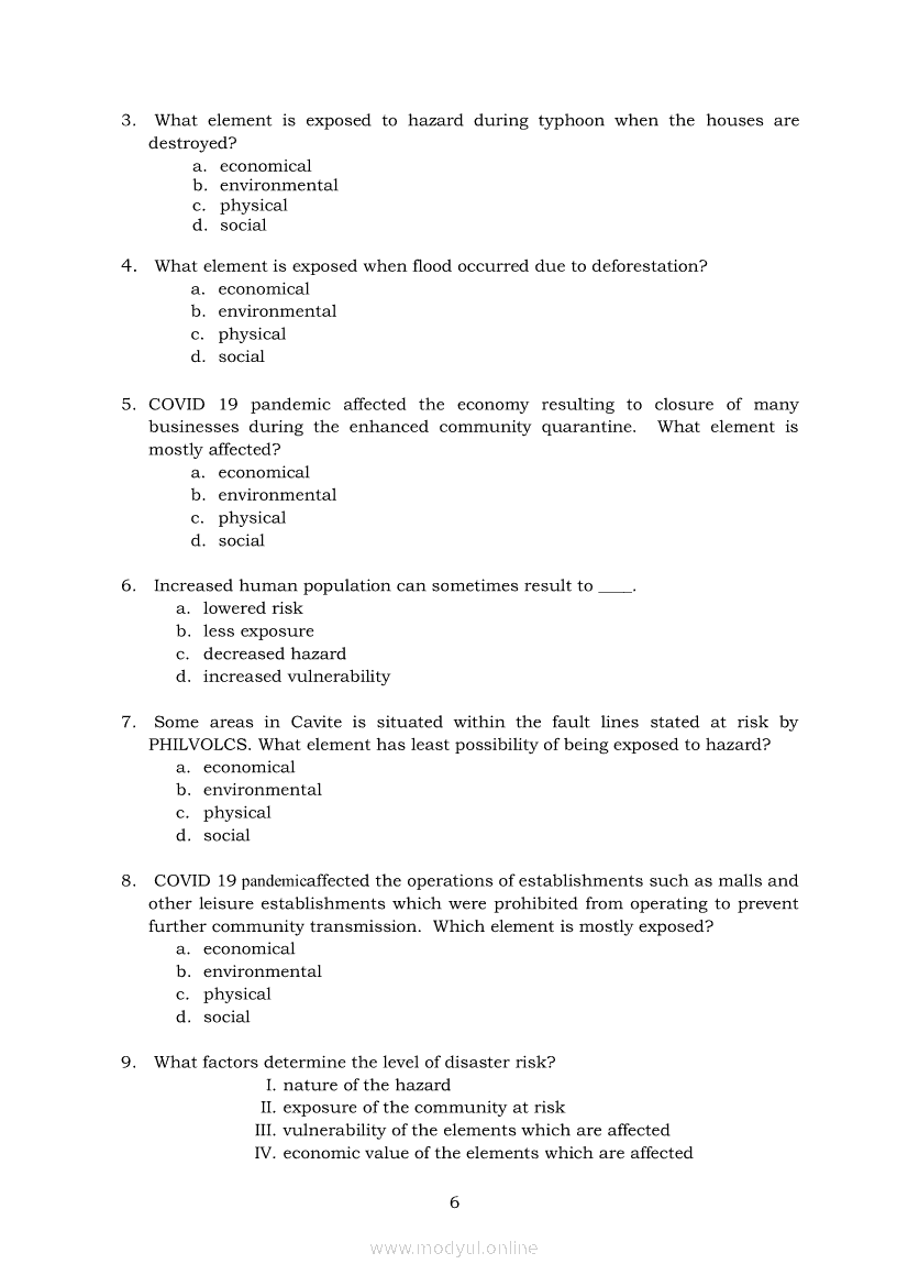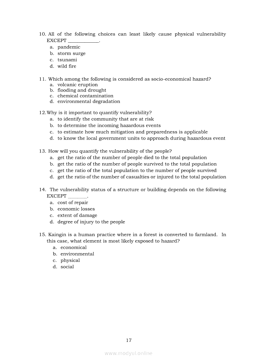 Disaster Readiness and Risk Reduction Module 7: Vulnerabilities of Different Elements Exposed to HazardsApr 22, 2021 SHSGrab your copy of Collegio Advance - ULTIMATE Updated College Entrance Exam Reviewer and pass with flying colors 🎉. Disaster Readiness and Risk ReductionRelatedDisaster Readiness and Risk Reduction Module 1: Basic Concept of Disaster and Disaster RiskDisaster Readiness and Risk Reduction Module 4: Disasters from Different PerspectivesDisaster Readiness and Risk ReductionQuarter 2 – Module 19: Policies of DRRM - The Philippine DRRM Law RA 10121 and Its Implementing Rules and RegulationsDisaster Readiness and Risk Reduction Quarter 2 – Module 18: Survival Kits and MaterialsDisaster Readiness and Risk Reduction Quarter 2 – Module 12: Response Procedure During a Fire Incident