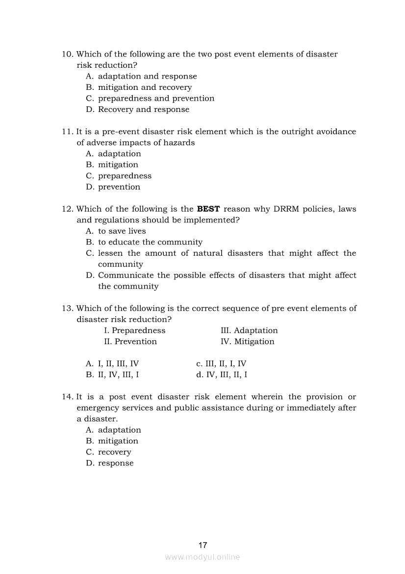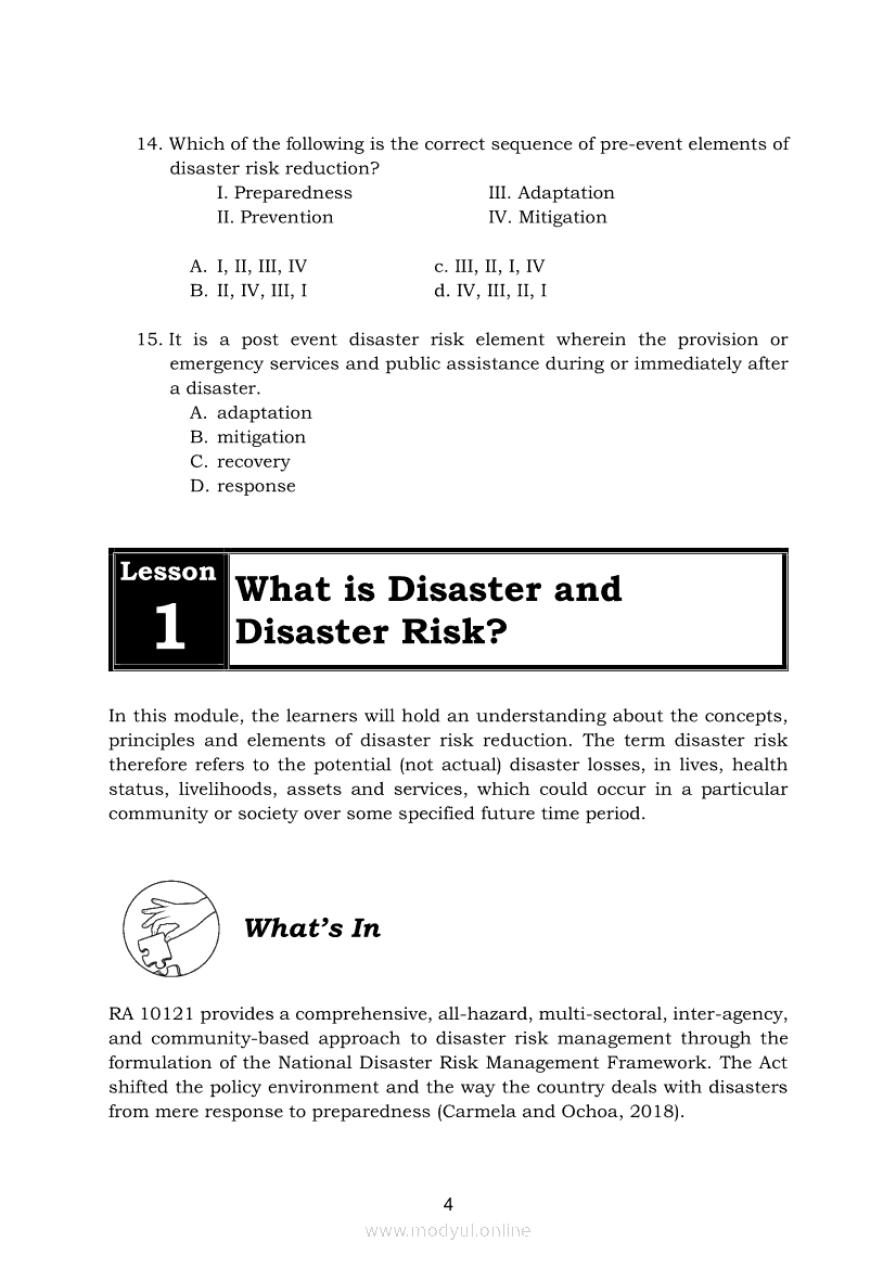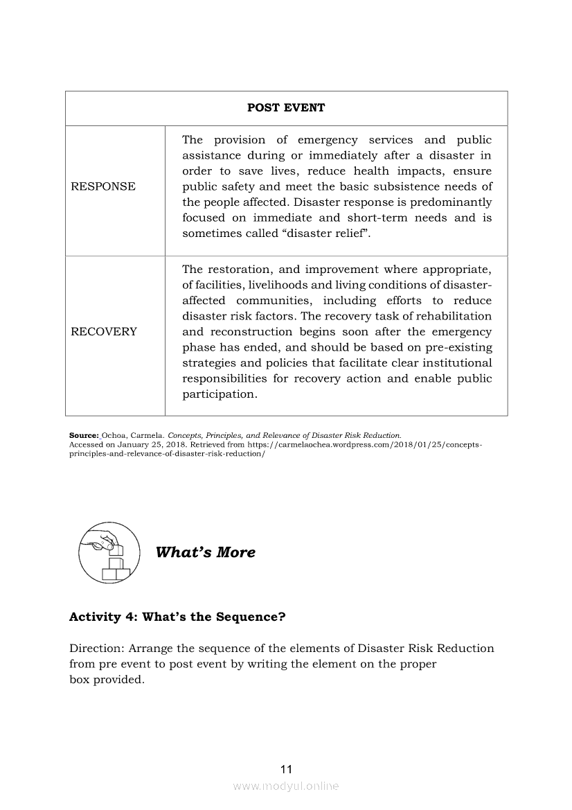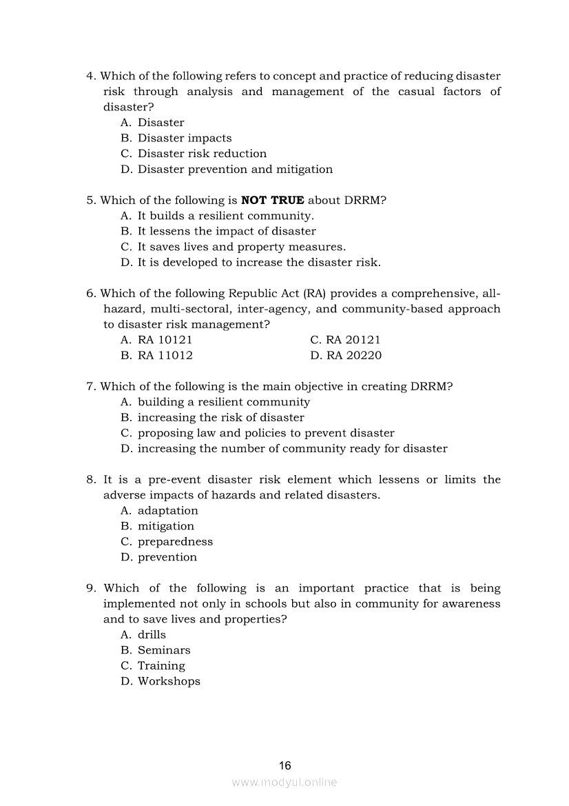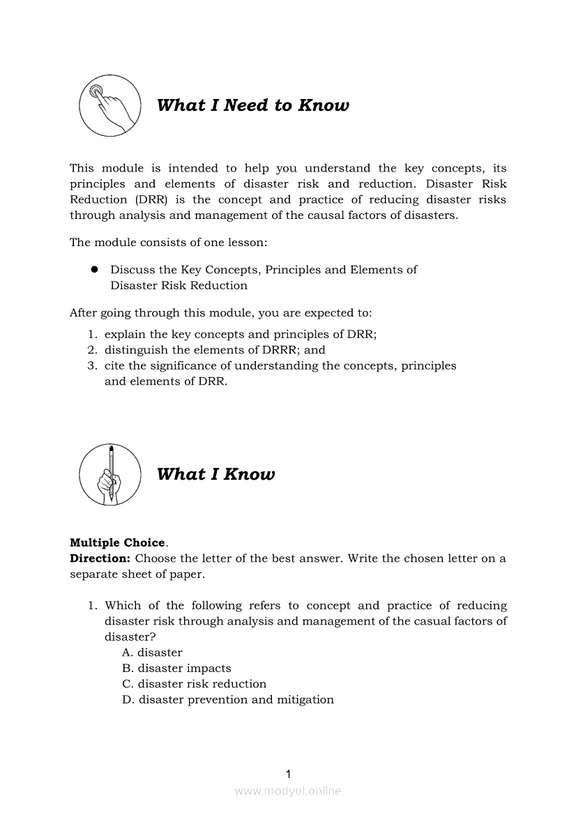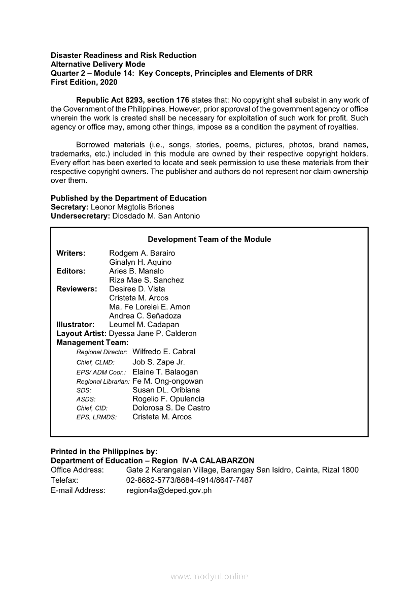 Disaster Readiness and Risk Reduction Quarter 2 – Module 14: Key Concepts, Principles and Elements of DRRApr 22, 2021 SHSGrab your copy of Collegio Advance - ULTIMATE Updated College Entrance Exam Reviewer and pass with flying colors 🎉. Disaster Readiness and Risk ReductionRelatedDisaster Readiness and Risk Reduction Disaster Readiness and Risk Reduction Module (PIVOT)Disaster Readiness and Risk Reduction Module 8: Effects of Hazard, Exposure and Vulnerability to Disaster RisksDisaster Readiness and Risk Reduction Quarter 2 – Module 3: Signs of Other Related Geological HazardsDisaster Readiness and Risk Reduction Quarter 2 – Module 12: Response Procedure During a Fire IncidentDisaster Readiness and Risk Reduction Quarter 2 – Module 17: Community Preparedness Plan