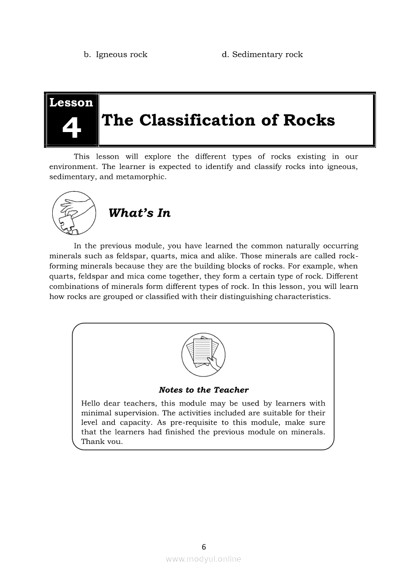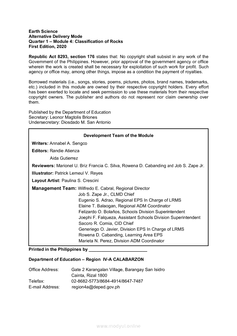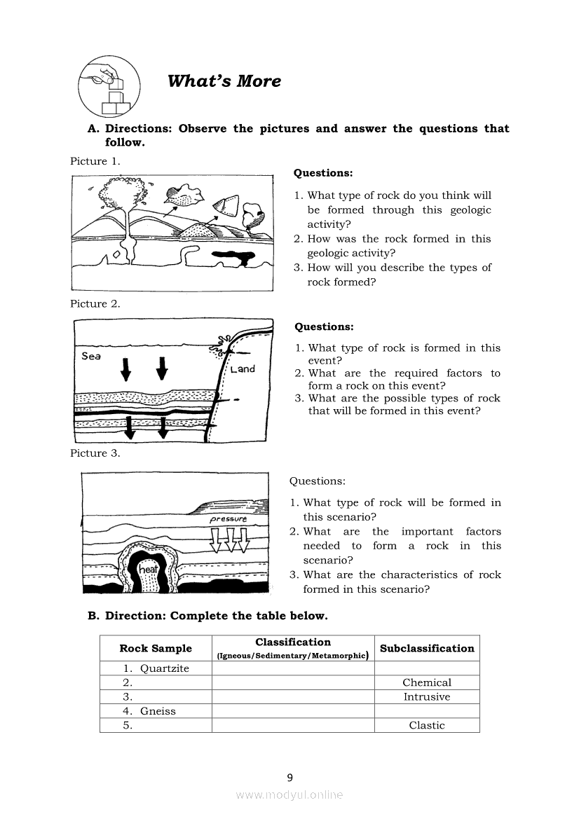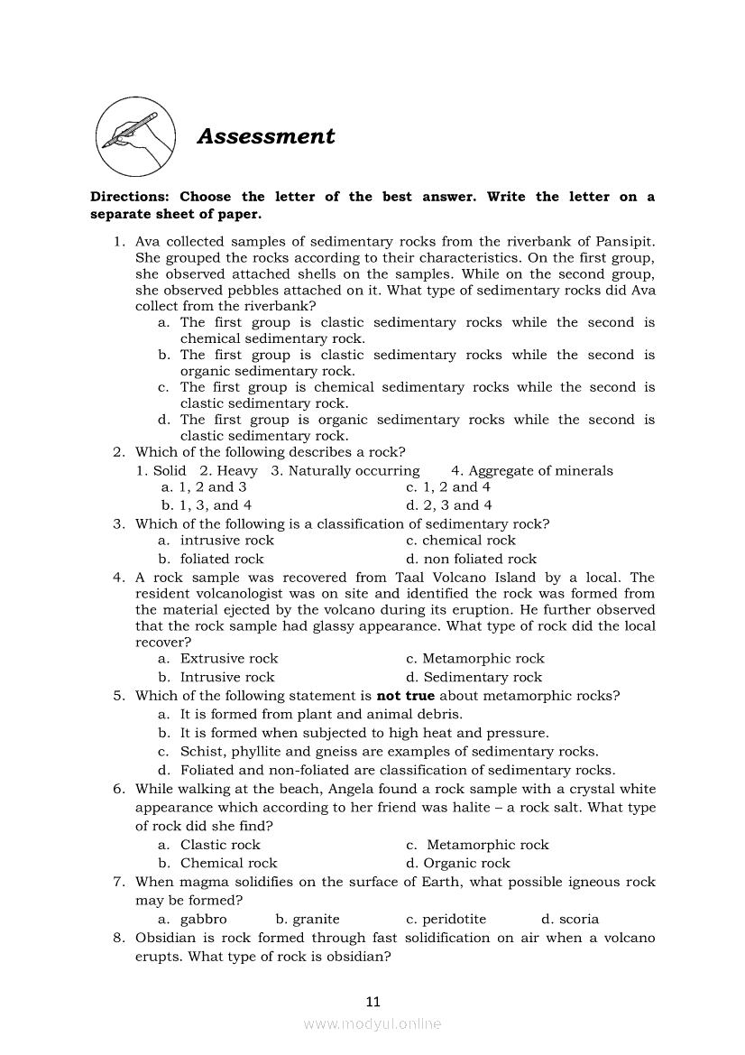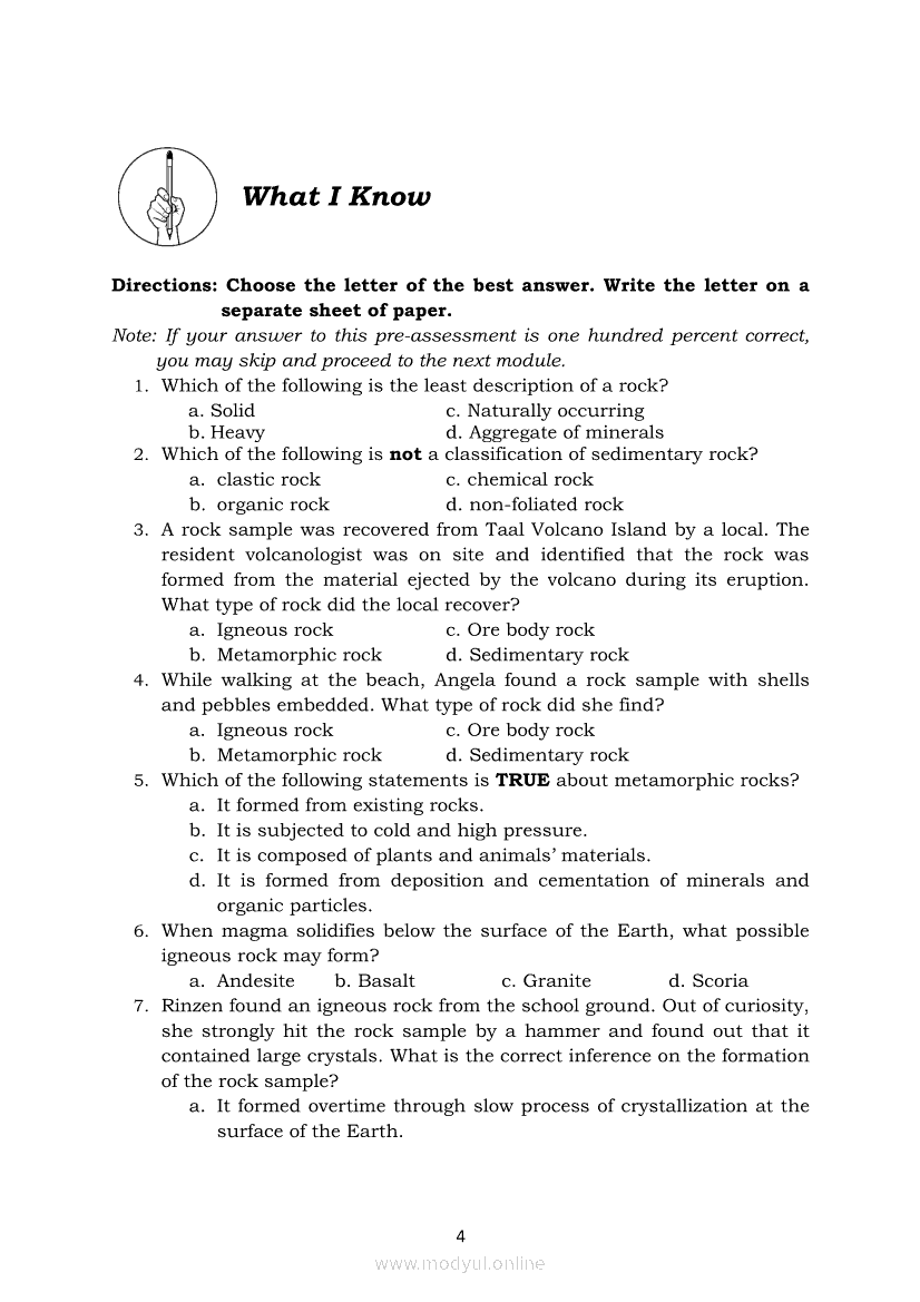 Earth Science Module 4: Classification of RocksApr 22, 2021 SHSGrab your copy of Collegio Advance - ULTIMATE Updated College Entrance Exam Reviewer and pass with flying colors 🎉. Earth ScienceRelatedEarth Science Quarter 2 – Module 12: Describe How Index Fossils (also known as guide fossils) are used to define and identify subdivisions of the Geologic Time ScaleEarth Science (PIVOT Module)Earth Science Quarter 2 – Module 9: How Layers of Rocks (Stratified Rocks) are FormedEarth Science Quarter 2 – Module 3: Endogenic Processes: Plutonism and VolcanismEarth Science Quarter 2 – Module 4: Metamorphism