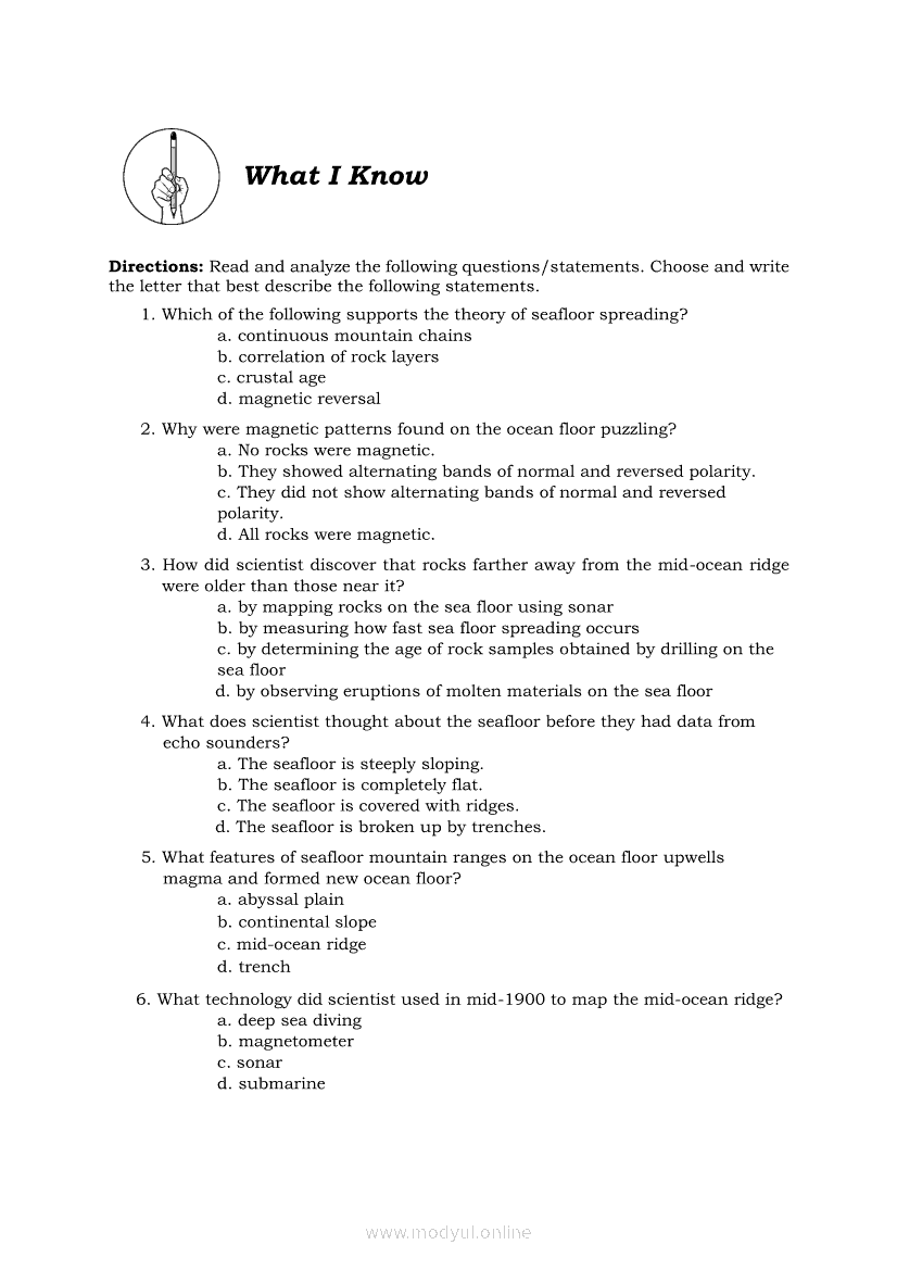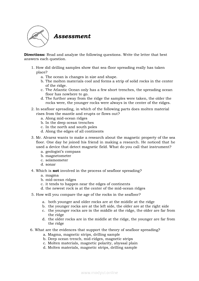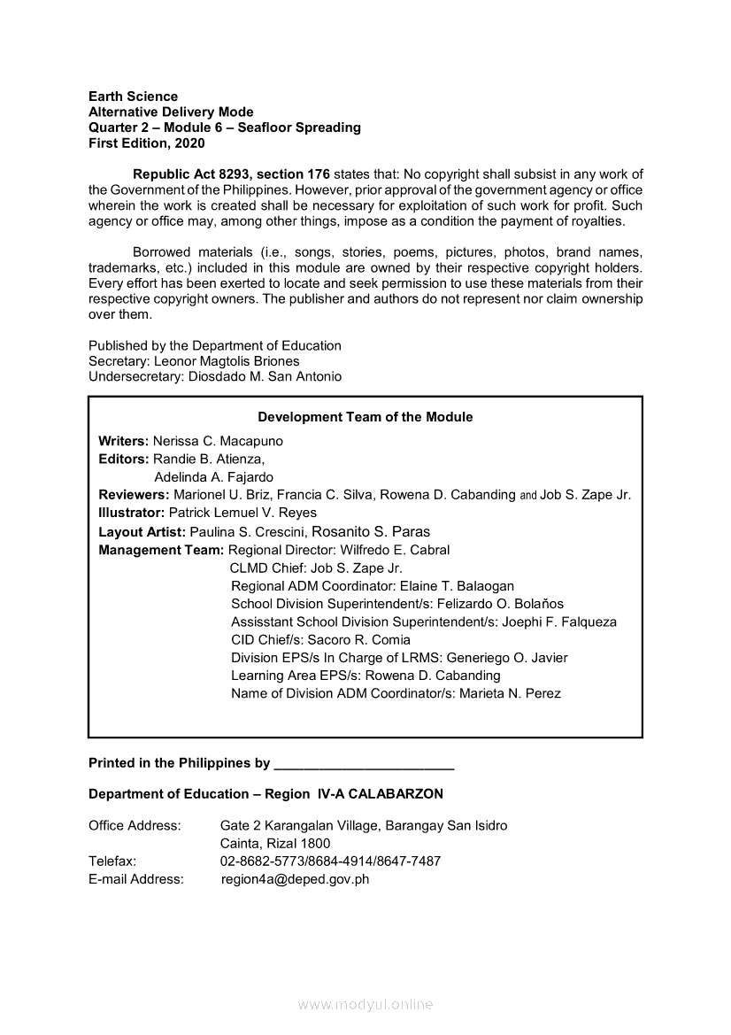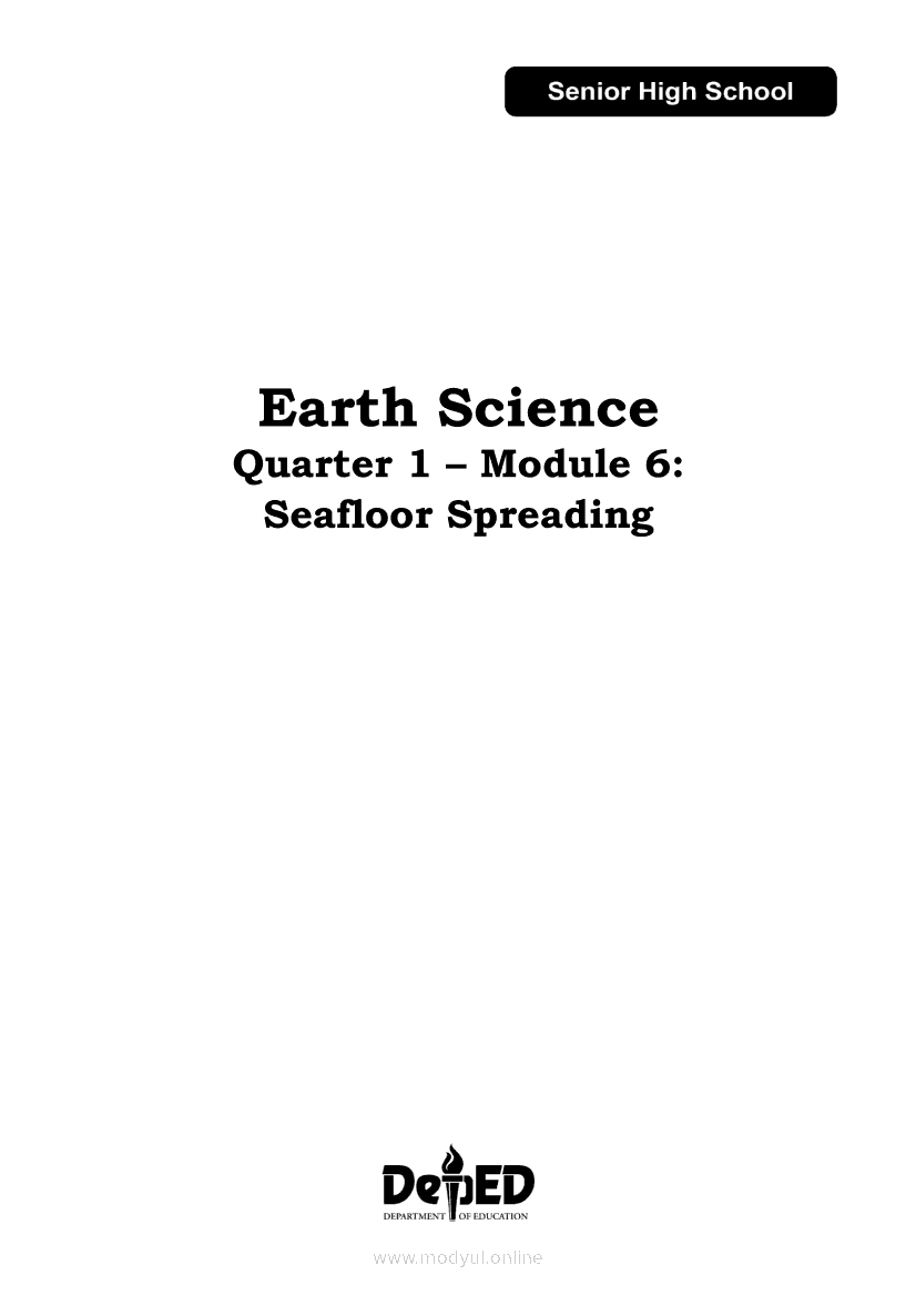 Earth Science Quarter 2 – Module 6: Seafloor SpreadingApr 22, 2021 SHSGrab your copy of Collegio Advance - ULTIMATE Updated College Entrance Exam Reviewer and pass with flying colors 🎉. Earth ScienceRelatedEarth Science Quarter 2 – Module 8: Movement of PlatesEarth Science Quarter 2 – Module 3: Endogenic Processes: Plutonism and VolcanismEarth Science Quarter 2 – Module 2: Earth’s Internal Heat SourcesEarth Science Quarter 2 –Module 5 Rock Behaviors Under StressEarth Science Quarter 2 – Module 1: Weathering