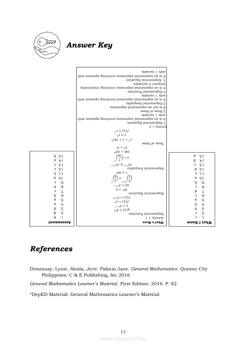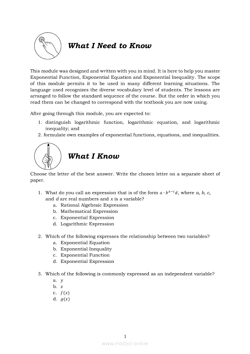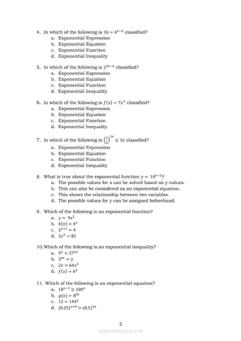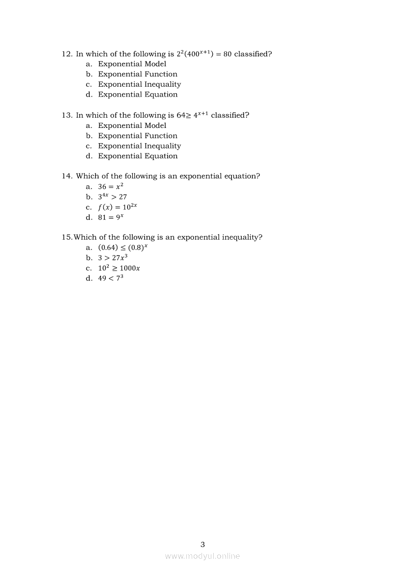 General Mathematics Module 18: Solving Exponential Equations and InequalitiesApr 22, 2021 SHSGrab your copy of Collegio Advance - ULTIMATE Updated College Entrance Exam Reviewer and pass with flying colors 🎉. General MathematicsRelatedGeneral Mathematics Module 2: Evaluating FunctionsGeneral Mathematics Module 28: Solving Real-Life Problems Involving Logarithmic Functions, Equations and InequalitiesGeneral Mathematics Quarter 2 – Module 3: Solving Problems Involving Simple and Compound InterestGeneral Mathematics Quarter 2 – Module 9: Different Markets for Stocks and BondsGeneral Mathematics Quarter 2 – Module 19: Validity of Categorical Syllogisms
