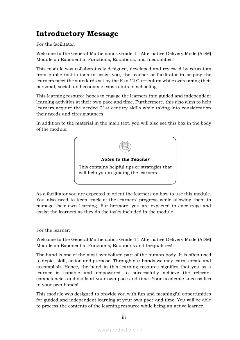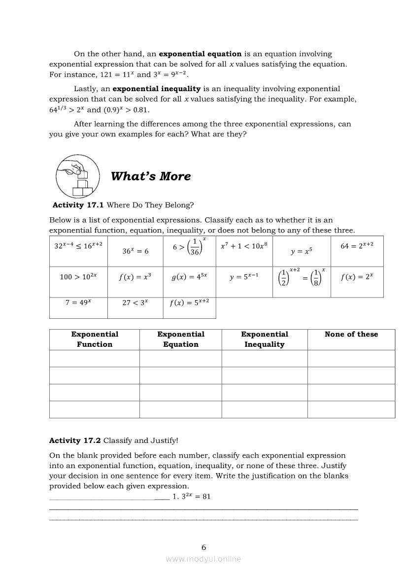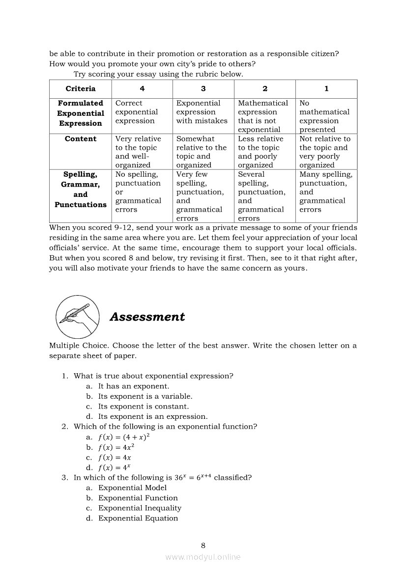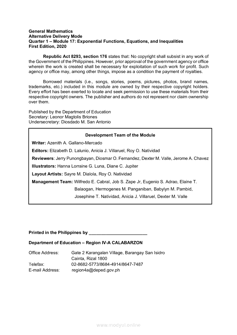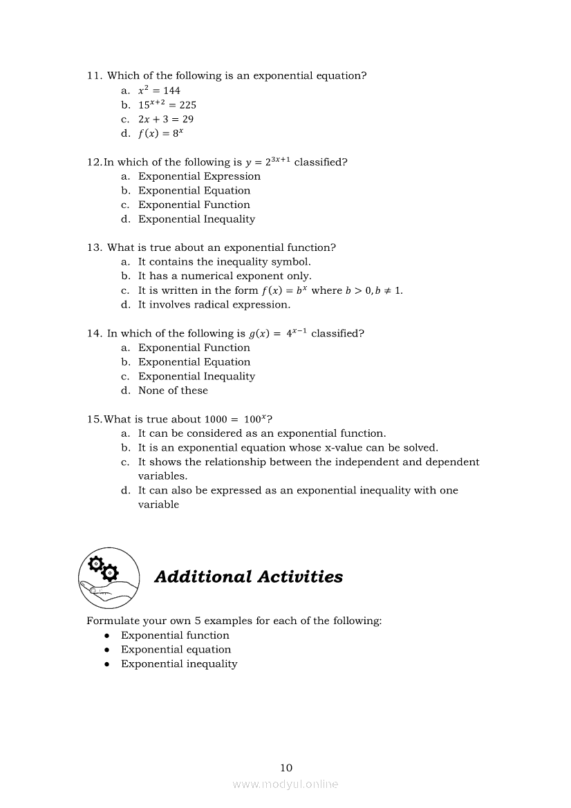 General Mathematics Module 18: Solving Exponential Equations and InequalitiesApr 22, 2021 SHSGrab your copy of Collegio Advance - ULTIMATE Updated College Entrance Exam Reviewer and pass with flying colors 🎉. General MathematicsRelatedGeneral Mathematics Module 2: Evaluating FunctionsGeneral Mathematics Module 28: Solving Real-Life Problems Involving Logarithmic Functions, Equations and InequalitiesGeneral Mathematics Quarter 2 – Module 3: Solving Problems Involving Simple and Compound InterestGeneral Mathematics Quarter 2 – Module 9: Different Markets for Stocks and BondsGeneral Mathematics Quarter 2 – Module 19: Validity of Categorical Syllogisms