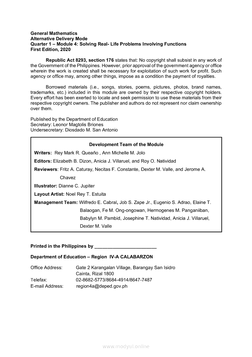 General Mathematics Module 4: Solving Real- Life Problems Involving FunctionsApr 22, 2021 SHSGrab your copy of Collegio Advance - ULTIMATE Updated College Entrance Exam Reviewer and pass with flying colors 🎉. General MathematicsRelatedGeneral Mathematics Quarter 2 – Module 6: Fair Market Value of a Cash FlowGeneral Mathematics Module 10: Solving Real-Life Problems Involving Rational Functions, Equations, and InequalitiesGeneral Mathematics Module 26: Domain and Range of Logarithmic FunctionsGeneral Mathematics Module 20: Domain and Range of Exponential FunctionsGeneral Mathematics Module 11: One-to-One Functions
