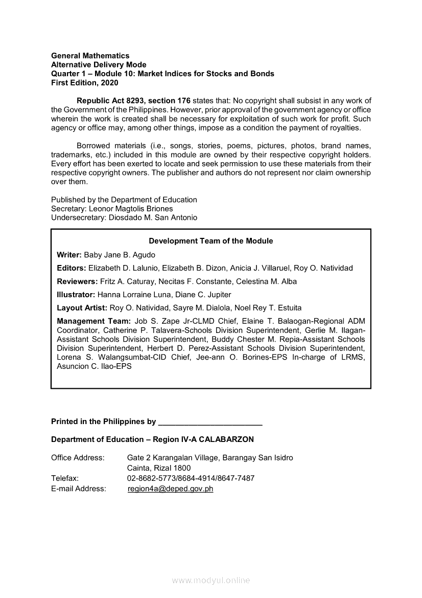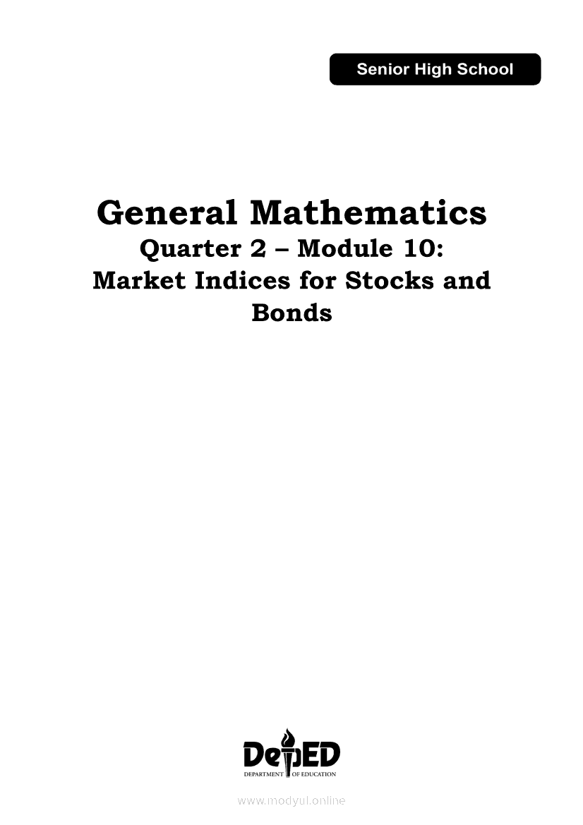 General Mathematics Quarter 2 – Module 10: Market Indices for Stocks and BondsApr 22, 2021 SHSGrab your copy of Collegio Advance - ULTIMATE Updated College Entrance Exam Reviewer and pass with flying colors 🎉. General MathematicsRelatedGeneral Mathematics Quarter 2 – Module 4: Simple and General AnnuitiesGeneral Mathematics Module 1: FunctionsGeneral Mathematics Module 2: Evaluating FunctionsGeneral Mathematics Module 4: Solving Real- Life Problems Involving FunctionsGeneral Mathematics Quarter 2 – Module 9: Different Markets for Stocks and Bonds