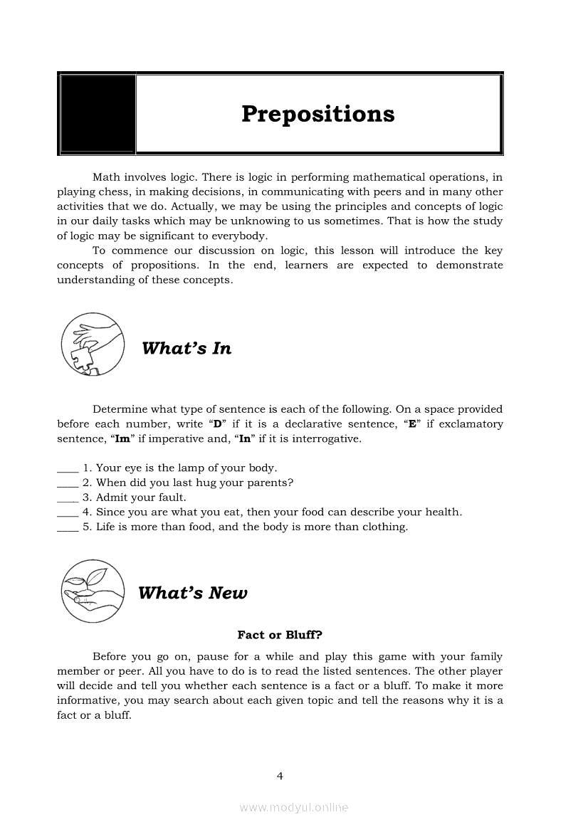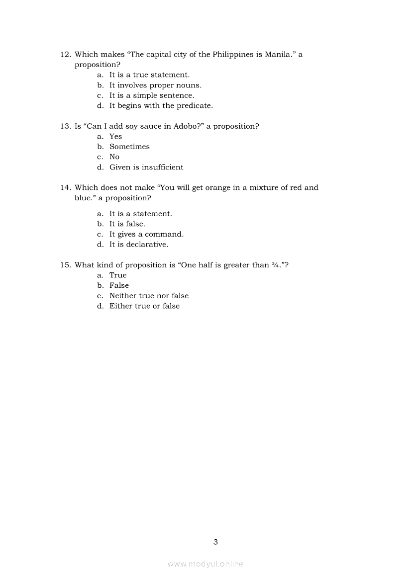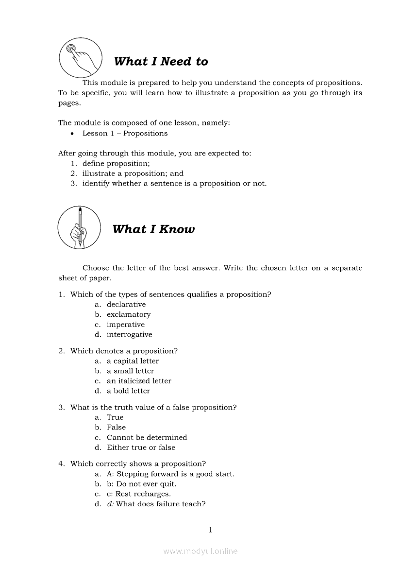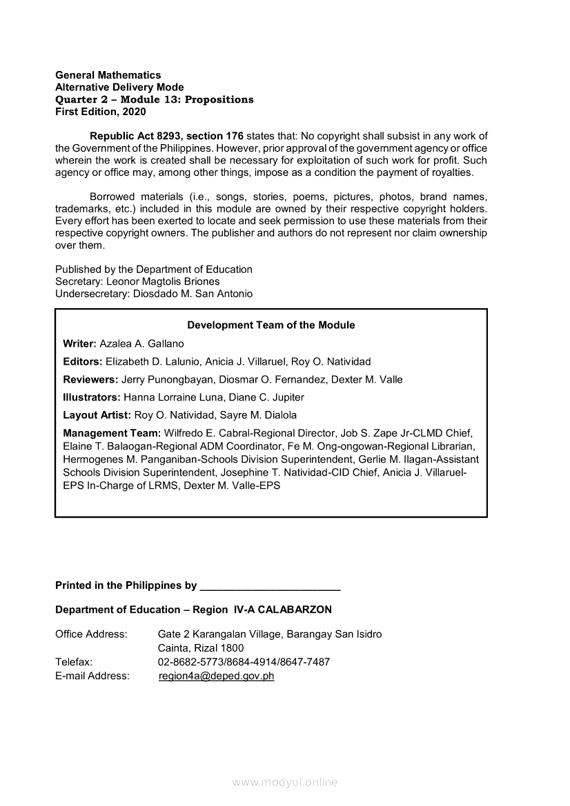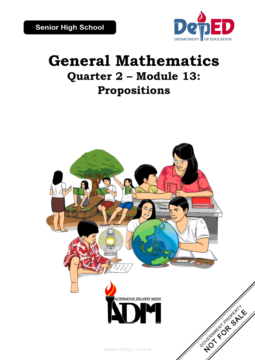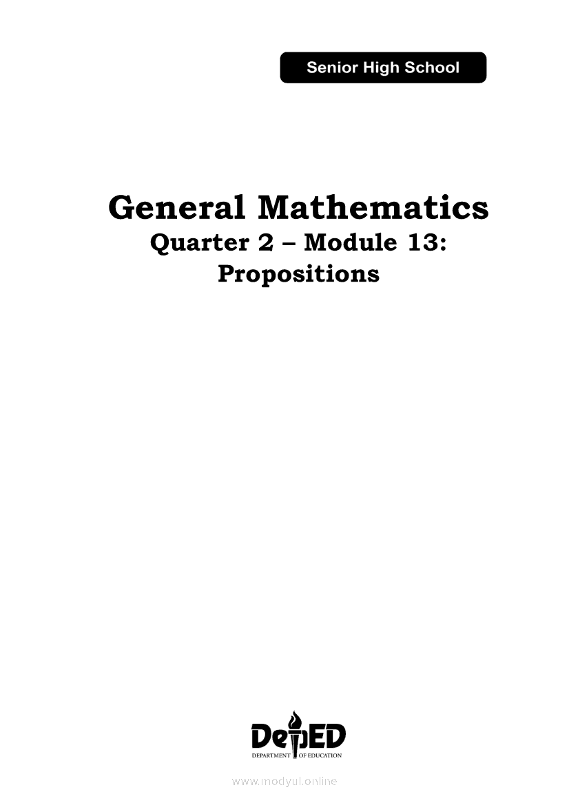 General Mathematics Quarter 2 – Module 13: PropositionsApr 22, 2021 SHSGrab your copy of Collegio Advance - ULTIMATE Updated College Entrance Exam Reviewer and pass with flying colors 🎉. General MathematicsRelatedGeneral Mathematics Module 8: The Domain and Range of a Rational FunctionsGeneral Mathematics Quarter 2 – Module 20: Valid Arguments and FallaciesGeneral Mathematics Module 10: Solving Real-Life Problems Involving Rational Functions, Equations, and InequalitiesGeneral Mathematics Quarter 2 – Module 15: Logical OperatorsGeneral Mathematics Quarter 2 – Module 14: Simple and Compound Propositions