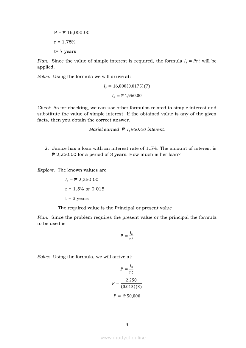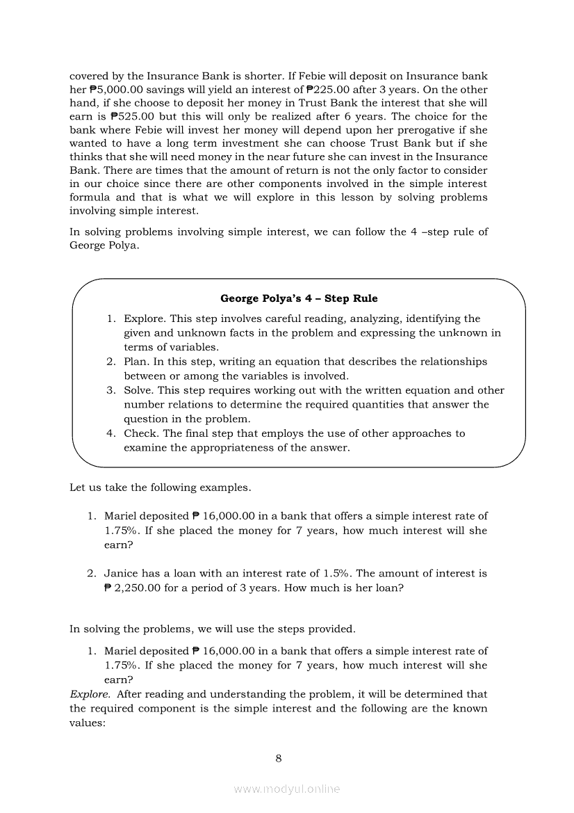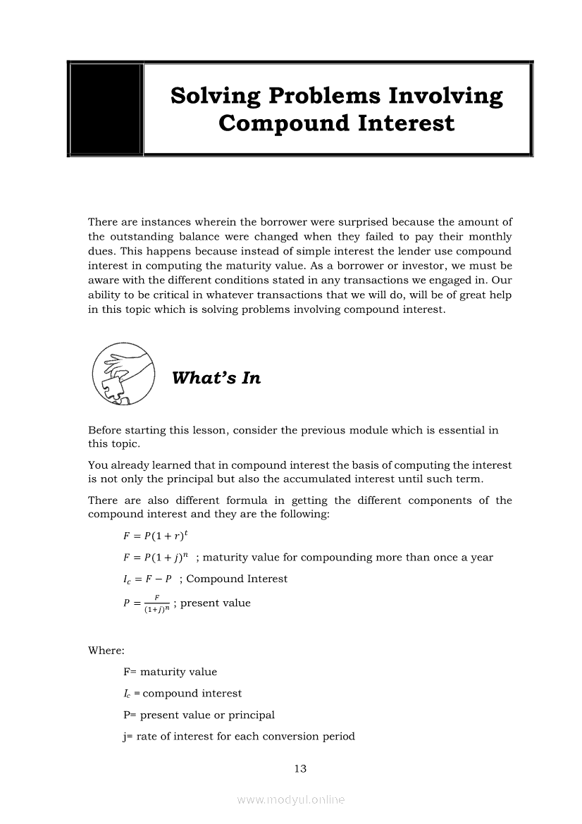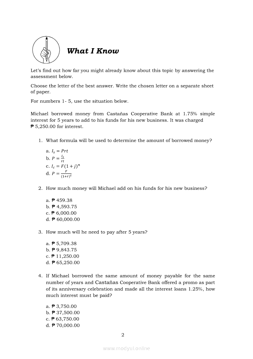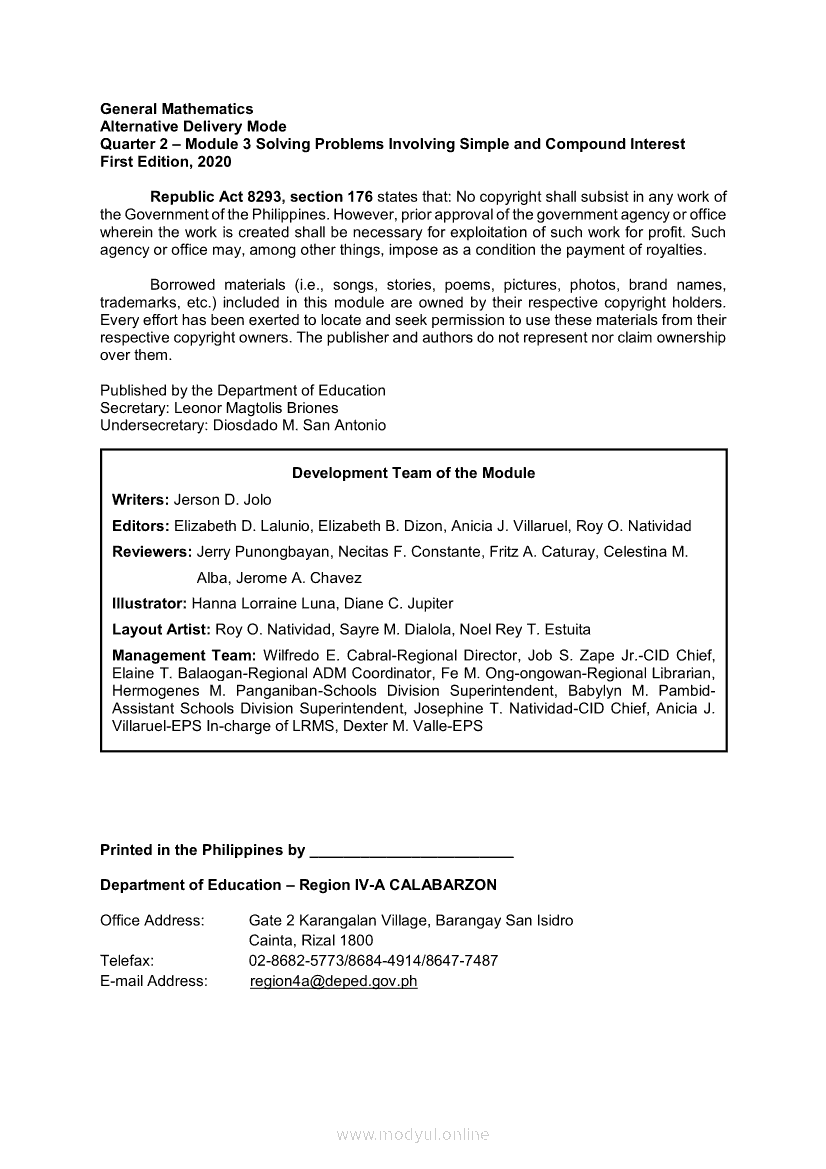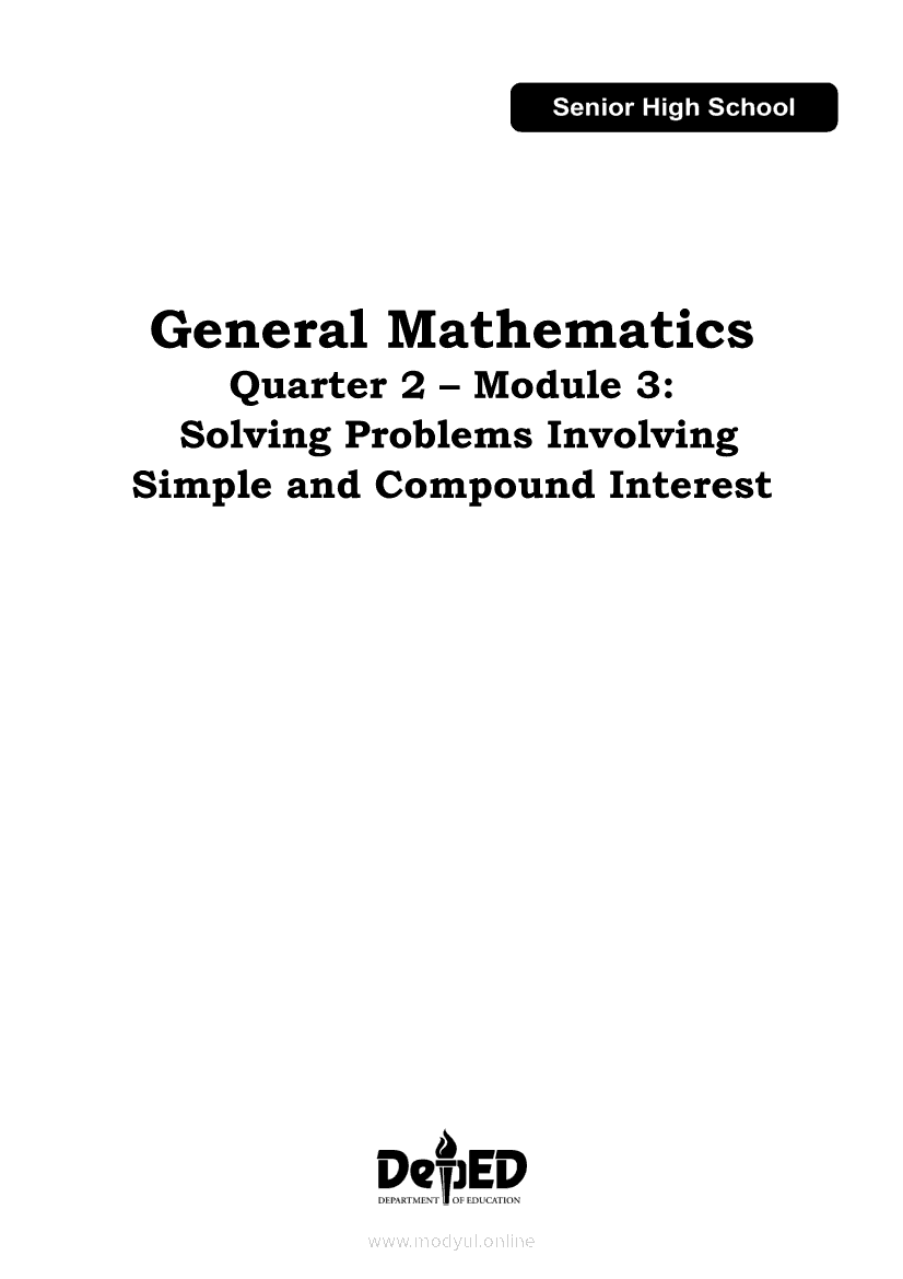 General Mathematics Quarter 2 – Module 3: Solving Problems Involving Simple and Compound InterestApr 22, 2021 SHSGrab your copy of Collegio Advance - ULTIMATE Updated College Entrance Exam Reviewer and pass with flying colors 🎉. General MathematicsRelatedGeneral Mathematics Module 5: Rational Functions, Equations and InequalitiesGeneral Mathematics Quarter 2 – Module 19: Validity of Categorical SyllogismsGeneral Mathematics Module 8: The Domain and Range of a Rational FunctionsGeneral Mathematics Quarter 2 – Module 2: Interest, Maturity, Future, and Present Values in Simple and Compound InterestsGeneral Mathematics Quarter 2 – Module 20: Valid Arguments and Fallacies