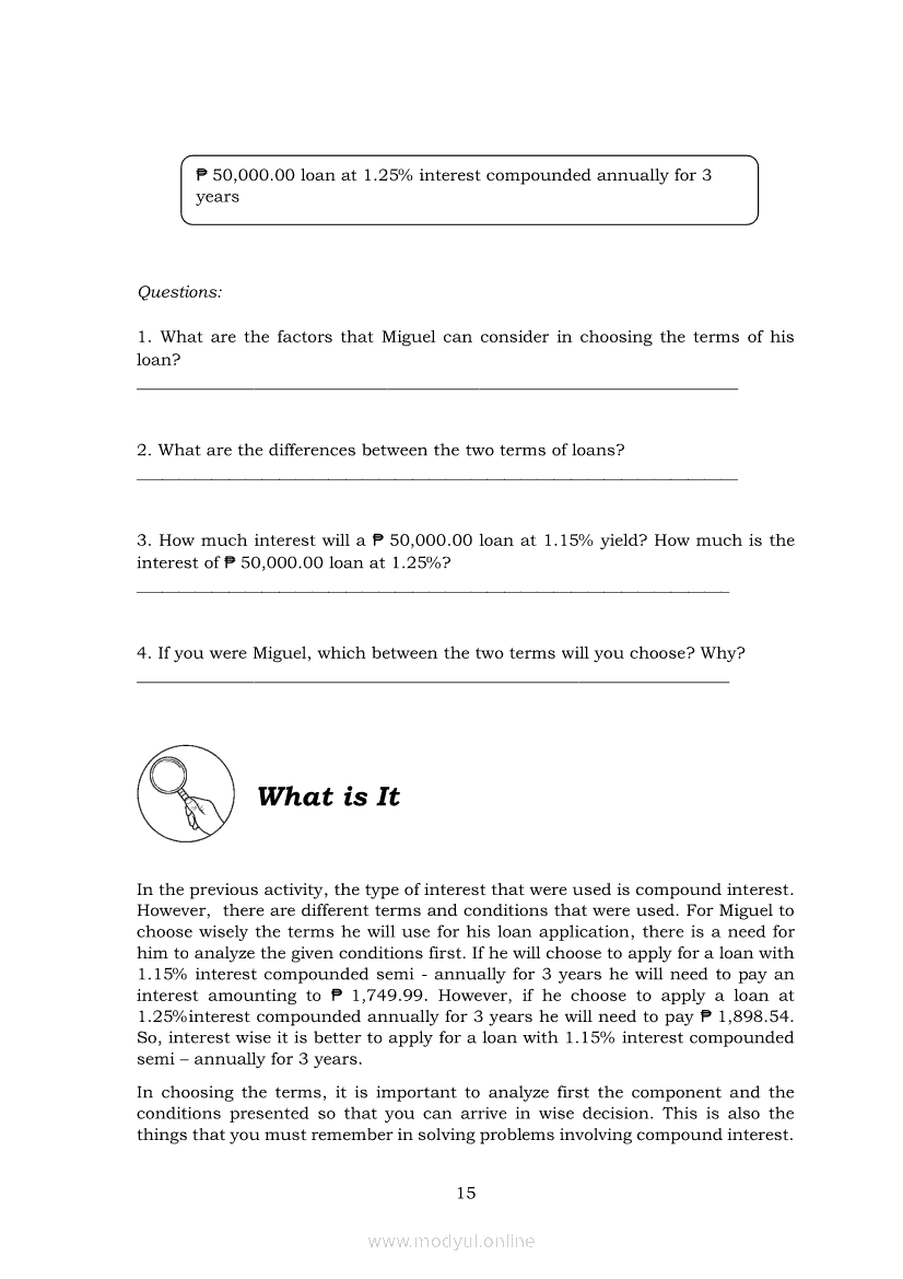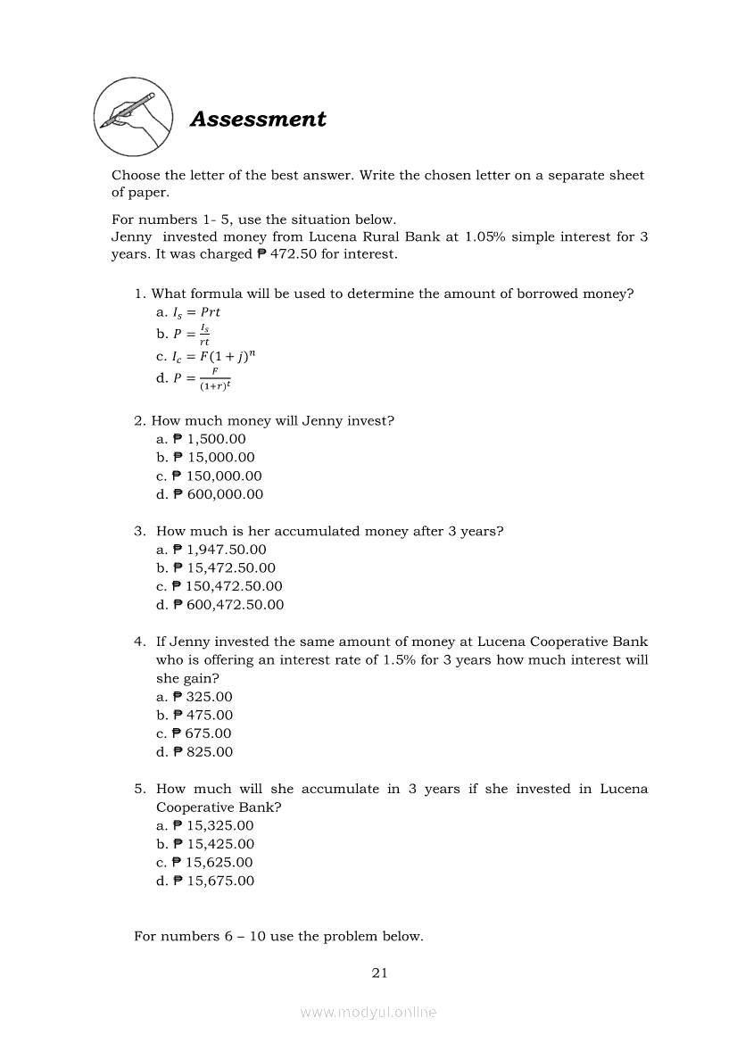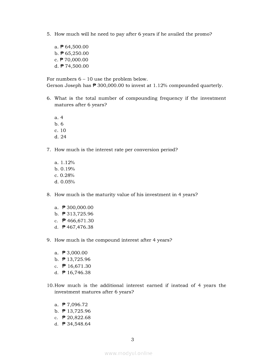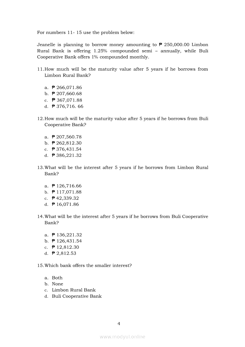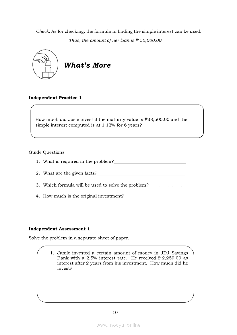 General Mathematics Quarter 2 – Module 3: Solving Problems Involving Simple and Compound InterestApr 22, 2021 SHSGrab your copy of Collegio Advance - ULTIMATE Updated College Entrance Exam Reviewer and pass with flying colors 🎉. General MathematicsRelatedGeneral Mathematics Module 5: Rational Functions, Equations and InequalitiesGeneral Mathematics Quarter 2 – Module 19: Validity of Categorical SyllogismsGeneral Mathematics Module 8: The Domain and Range of a Rational FunctionsGeneral Mathematics Quarter 2 – Module 2: Interest, Maturity, Future, and Present Values in Simple and Compound InterestsGeneral Mathematics Quarter 2 – Module 20: Valid Arguments and Fallacies