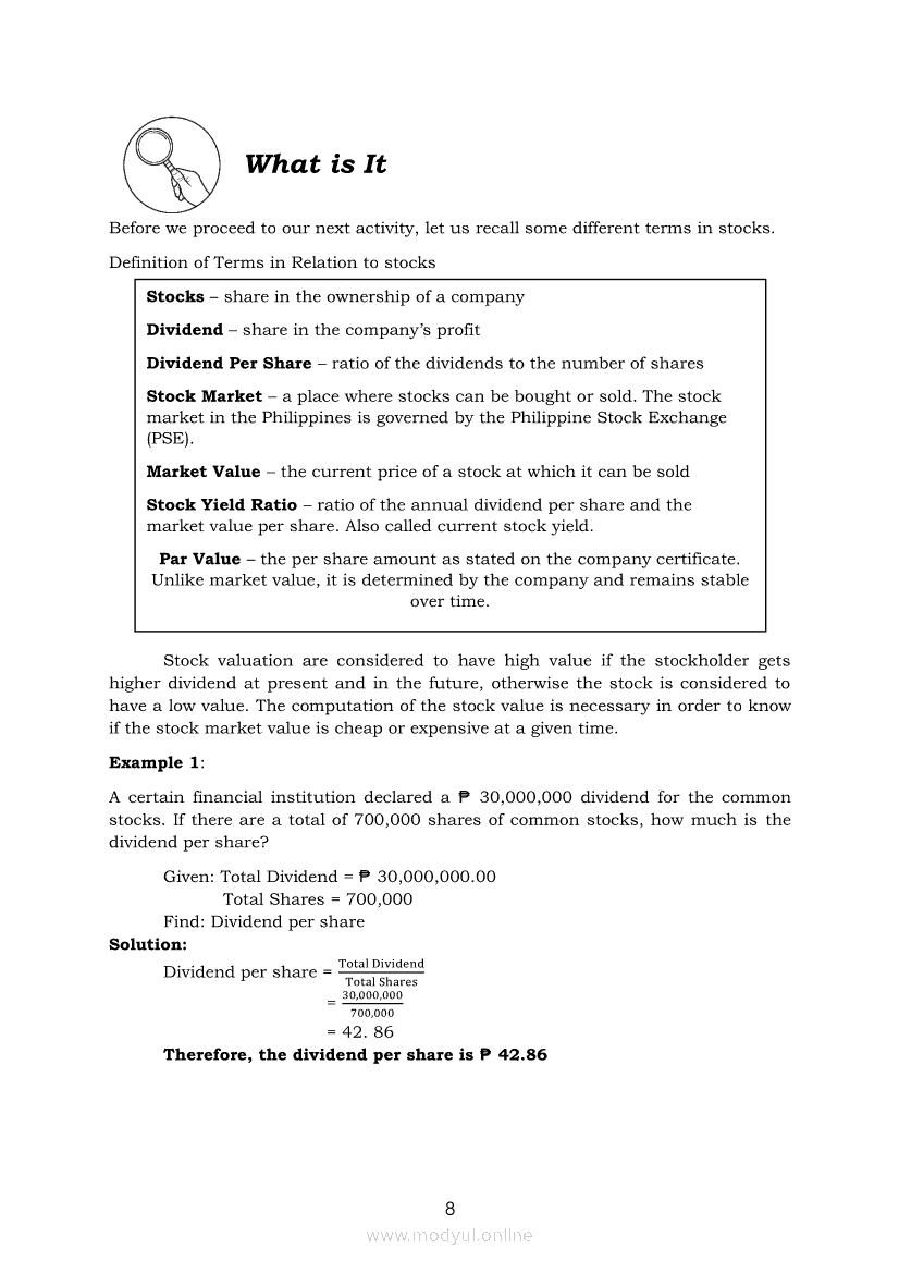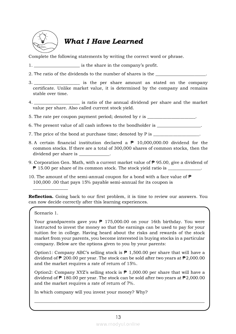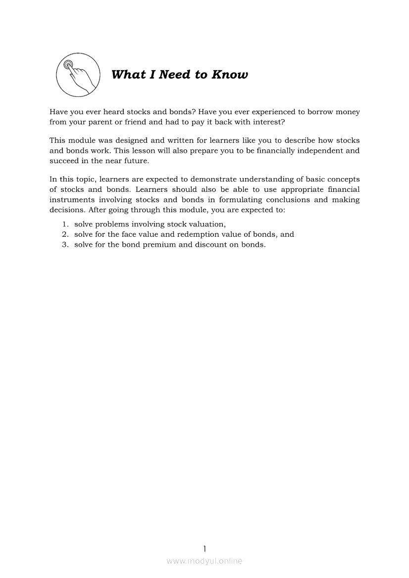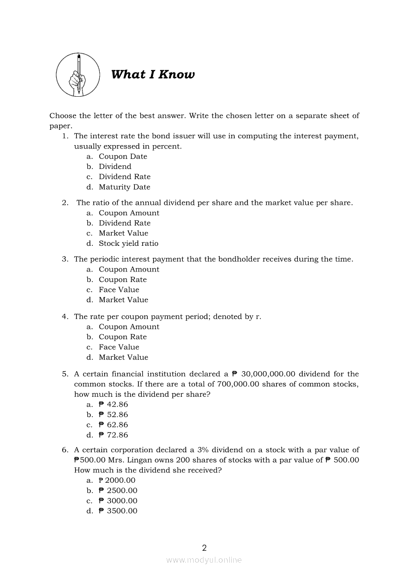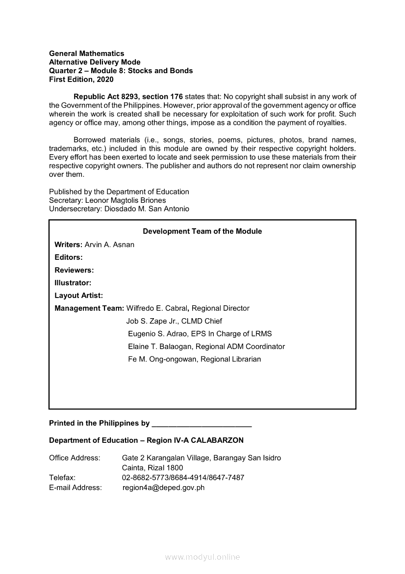 General Mathematics Quarter 2 – Module 8: Stocks and BondsApr 22, 2021 SHSGrab your copy of Collegio Advance - ULTIMATE Updated College Entrance Exam Reviewer and pass with flying colors 🎉. General MathematicsRelatedGeneral Mathematics Quarter 2 – Module 5: Future and Present Values of Simple and General AnnuitiesGeneral Mathematics Module 1: FunctionsGeneral Mathematics Module 12: The Inverse of One-to-one FunctionsGeneral Mathematics Quarter 2 – Module 2: Interest, Maturity, Future, and Present Values in Simple and Compound InterestsGeneral Mathematics Quarter 2 – Module 16: Truth Values of Propositions