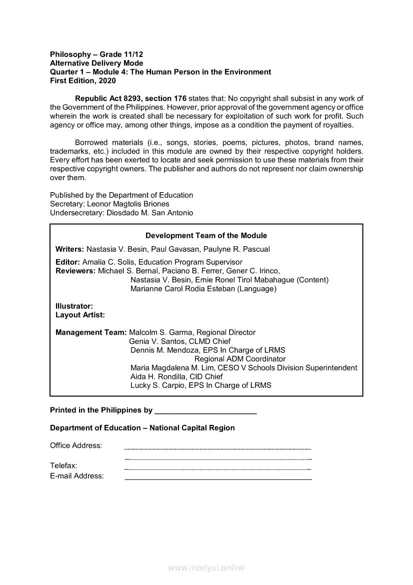 Introduction to Philosophy of the Human Person Module 4: THE HUMAN PERSON IN THE ENVIRONMENTApr 22, 2021 SHSGrab your copy of Collegio Advance - ULTIMATE Updated College Entrance Exam Reviewer and pass with flying colors 🎉. Introduction to Philosophy of the Human PersonRelatedIntroduction to Philosophy Method of Philosophizing Quarter 1 Week 5Introduction to Philosophy of the Human Person Module 2.2 Methods of PhilosophizingIntroduction to Philosophy of the Human Person Quarter 2 – Module 2: IntersubjectivityIntroduction to Philosophy of the Human Person Quarter 2 – Module 3: Human Person and SocietyIntroduction to Philosophy of the Human Person Module 2.1: Methods of Philosophizing