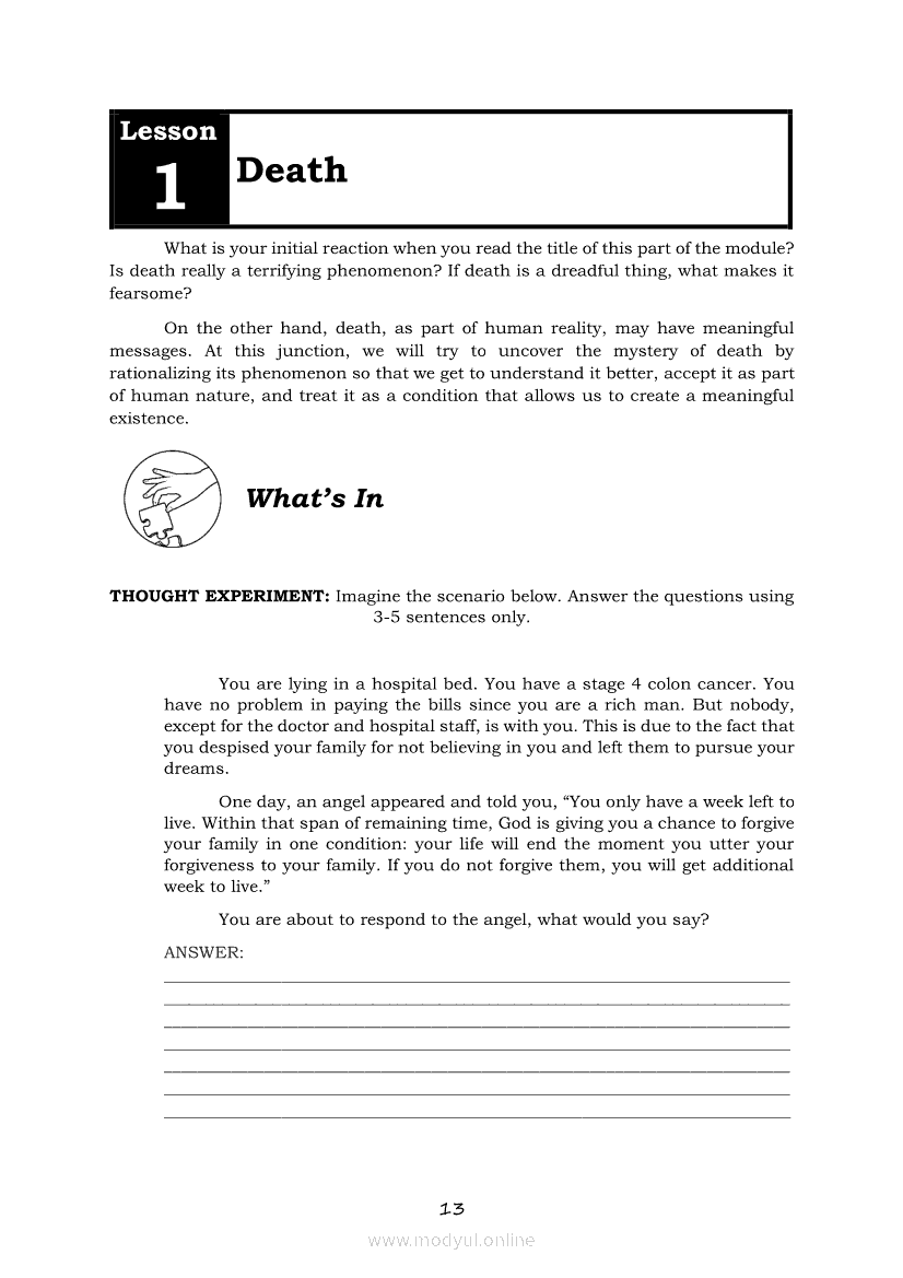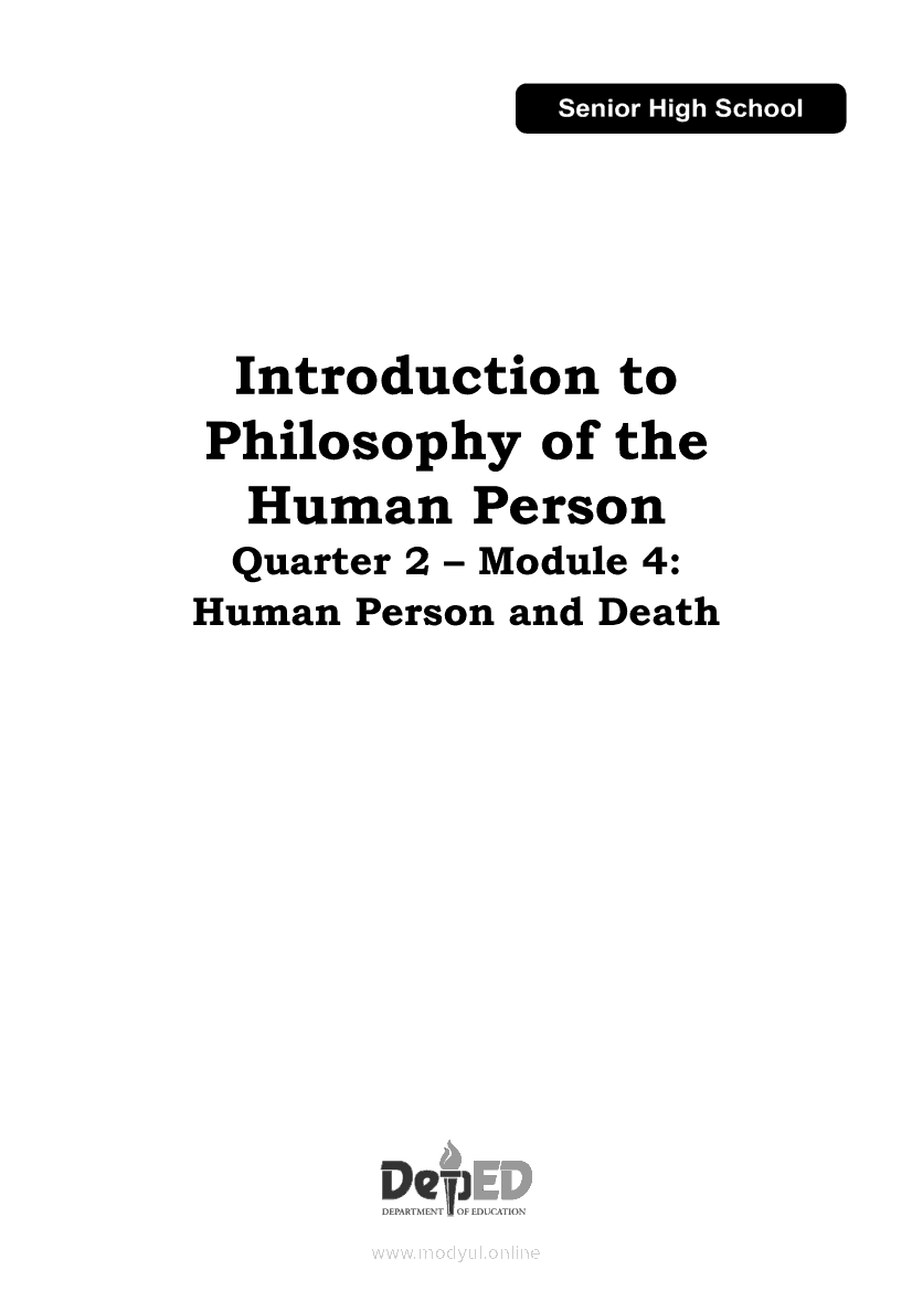 Introduction to Philosophy of the Human Person Quarter 2 – Module 4: Human Person and DeathApr 22, 2021 SHSGrab your copy of Collegio Advance - ULTIMATE Updated College Entrance Exam Reviewer and pass with flying colors 🎉. Introduction to Philosophy of the Human PersonRelatedIntroduction to Philosophy Method of Philosophizing Quarter 1 Week 5Introduction to Philosophy of the Human Person Quarter 2 – Module 3: Human Person and SocietyIntroduction to Philosophy of the Human Person Quarter 2 – Module 2: IntersubjectivityIntroduction to Philosophy of the Human Person Doing PhilosophyIntroduction to Philosophy of the Human Person Module 3: THE HUMAN PERSON AS AN EMBODIED SPIRIT