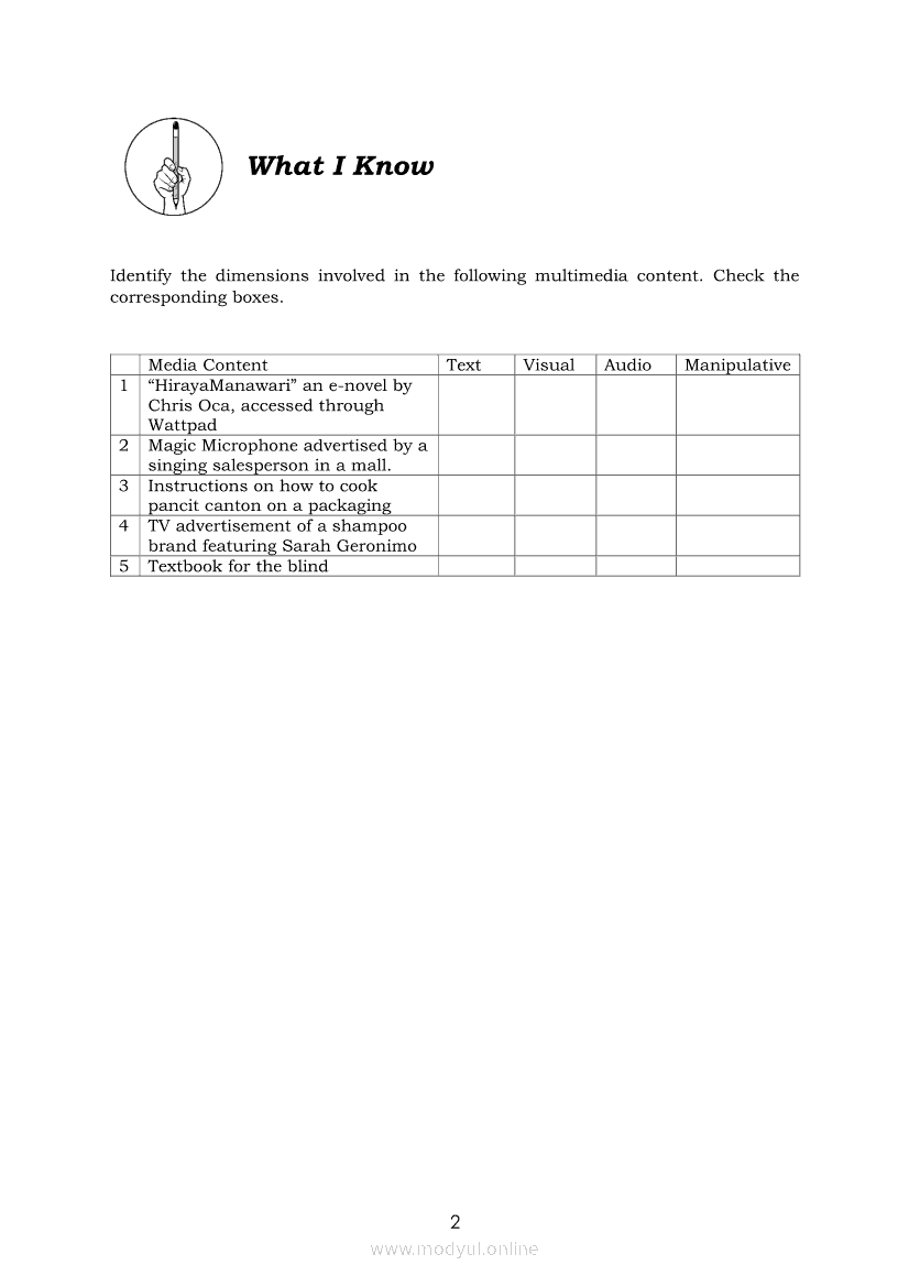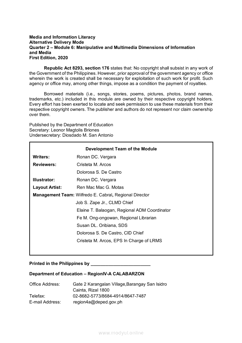 Media and Information Literacy Quarter 2 – Module 6: Manipulative and Multimedia Dimensions of Information and MediaApr 22, 2021 SHSGrab your copy of Collegio Advance - ULTIMATE Updated College Entrance Exam Reviewer and pass with flying colors 🎉. Media and Information LiteracyRelatedMedia and Information Literacy Quarter 2 – Module 8: Evaluating MultimediaMedia and Information Literacy Quarter 2 – Module 4: Text and Visual Dimensions of Information and MediaMedia and Information Literacy Quarter 2 – Module 1: The Power of Media and InformationMedia and Information Literacy Quarter 2 – Module 9: Creative Content CreationMedia and Information Literacy Grade 12 (PIVOT)