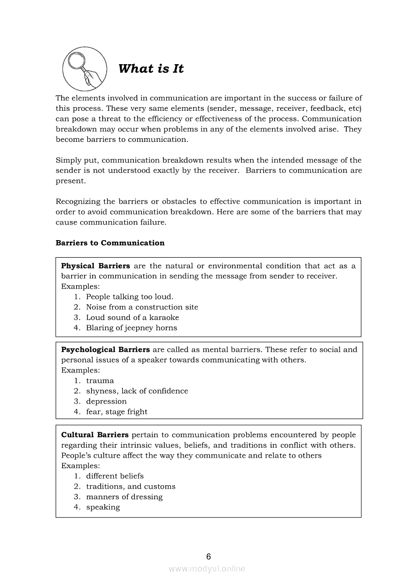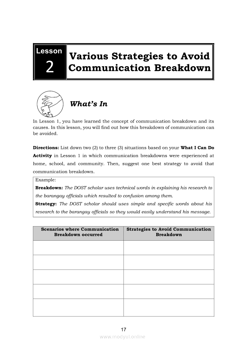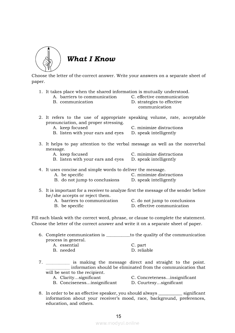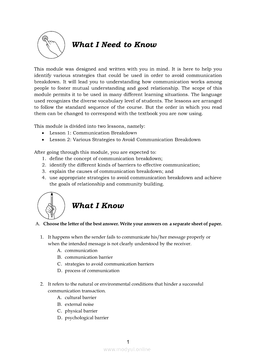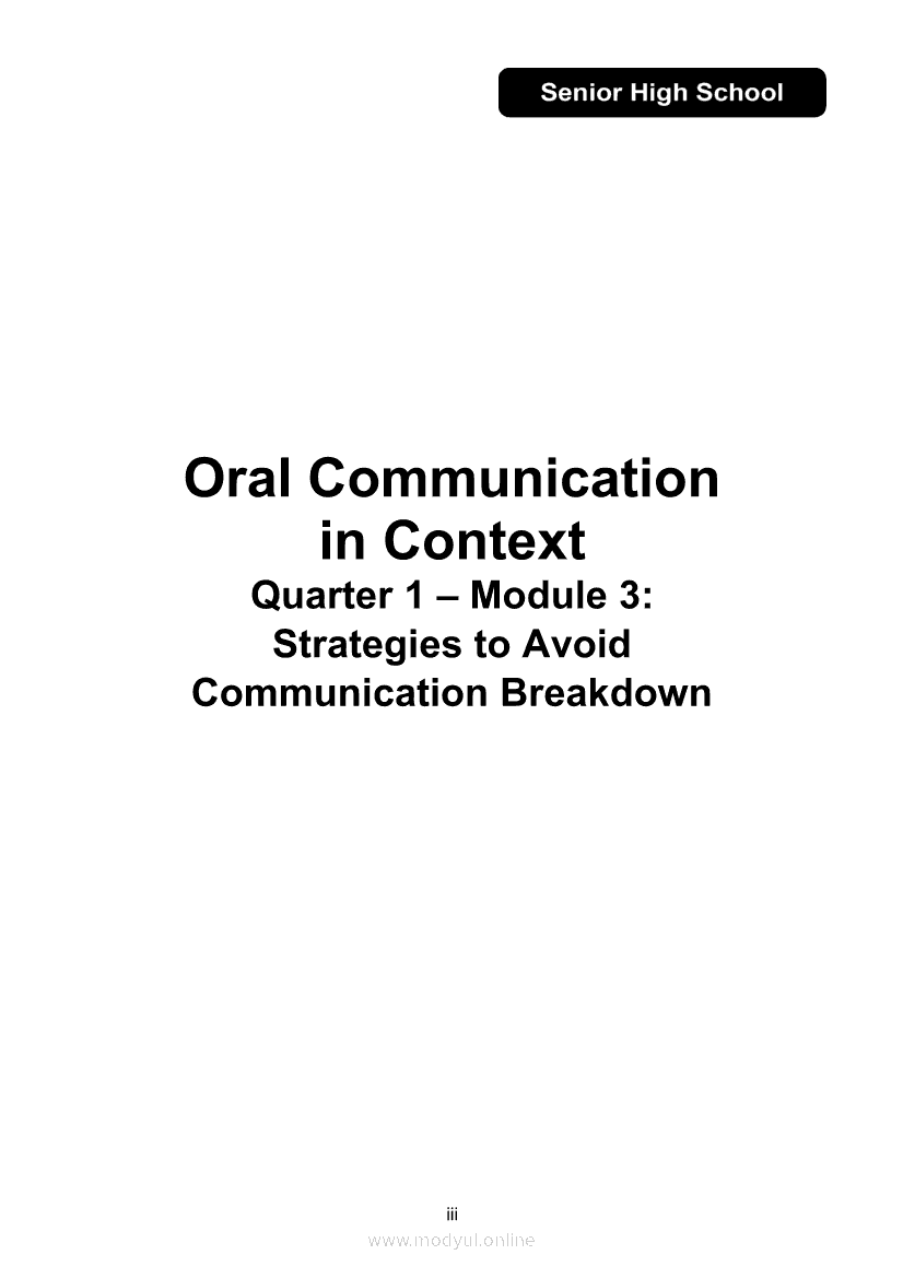 Oral Communication in Context Module 3: Strategies to Avoid Communication BreakdownApr 22, 2021 SHSGrab your copy of Collegio Advance - ULTIMATE Updated College Entrance Exam Reviewer and pass with flying colors 🎉. Oral Communication in ContextRelatedOral Communication in Context Module 1-Functions, Nature and Process of CommunicationOral Communication in Context Quarter 2 – Module 2: Understanding Speech Context, Speech Style, Speech Act and Communicative StrategyOral Communication in Context Quarter 2 – Module 1: Types of Communicative StrategyOral Communication in Context Module 5: Types of Speech ContextOral Communication in Context Oral Communication in Context (PIVOT)