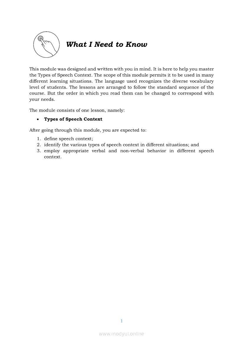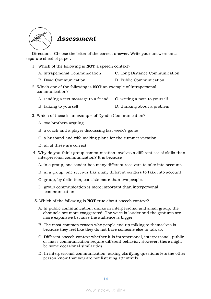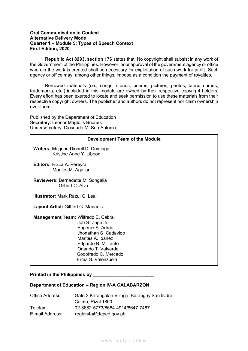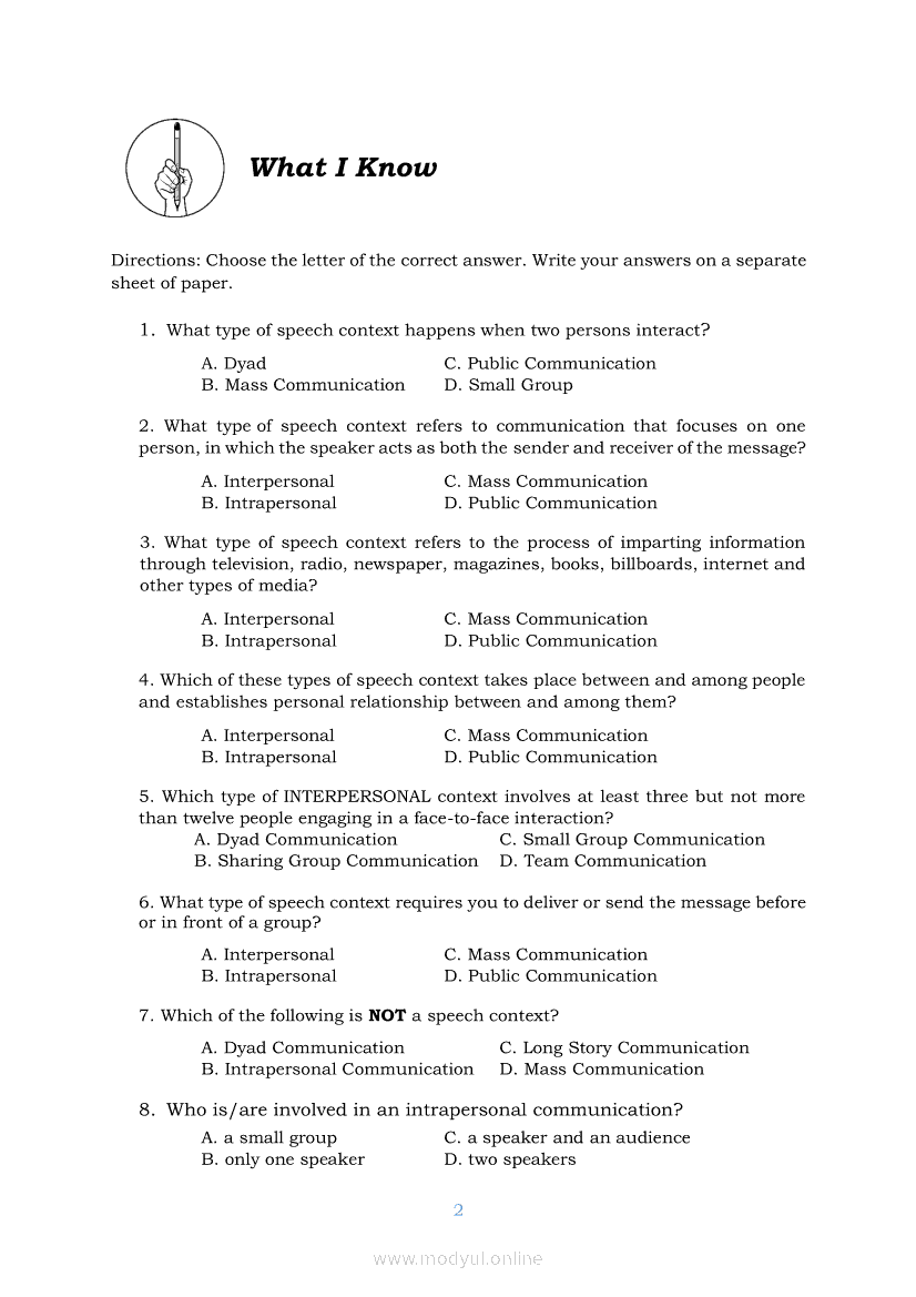 Oral Communication in Context Module 5: Types of Speech ContextApr 22, 2021 SHSGrab your copy of Collegio Advance - ULTIMATE Updated College Entrance Exam Reviewer and pass with flying colors 🎉. Oral Communication in ContextRelatedOral Communication in Context Module 3: Strategies to Avoid Communication BreakdownOral Communication in Context Module 1-Functions, Nature and Process of CommunicationOral Communication in Context Oral Communication in Context (PIVOT)Oral Communication in Context Module 2: Communication ModelsOral Communication in Context Quarter 2 – Module 2: Understanding Speech Context, Speech Style, Speech Act and Communicative Strategy