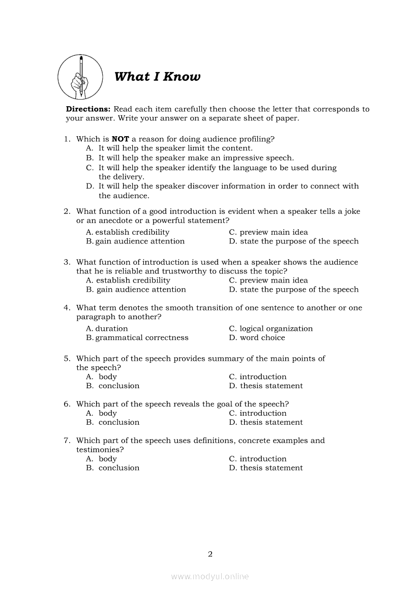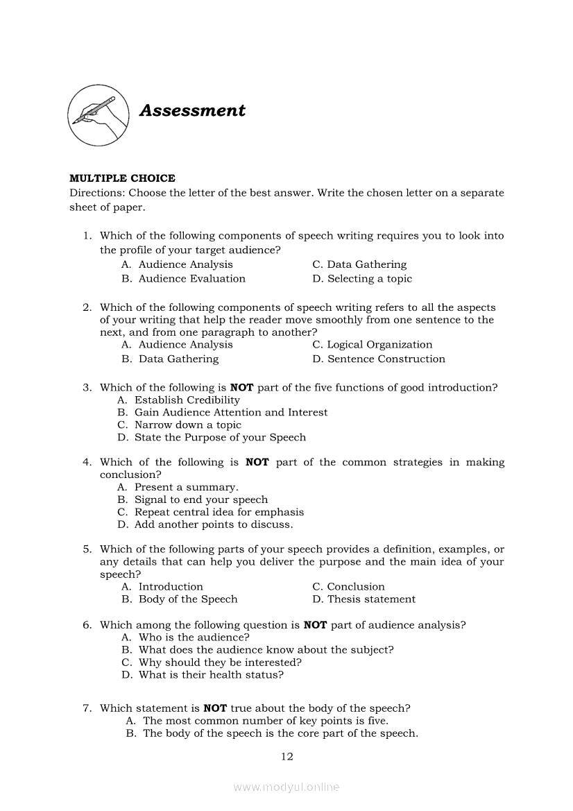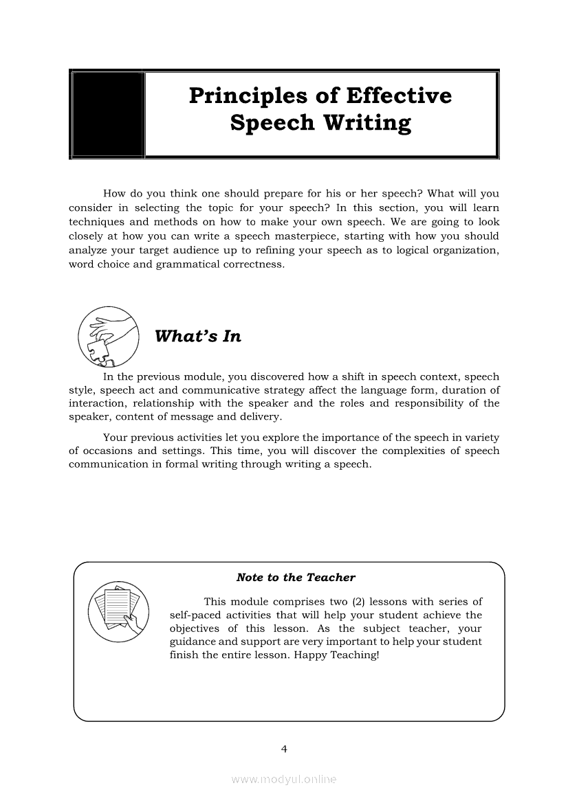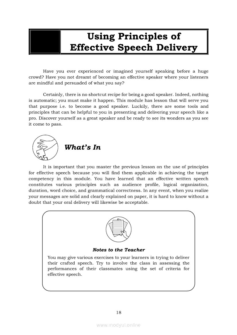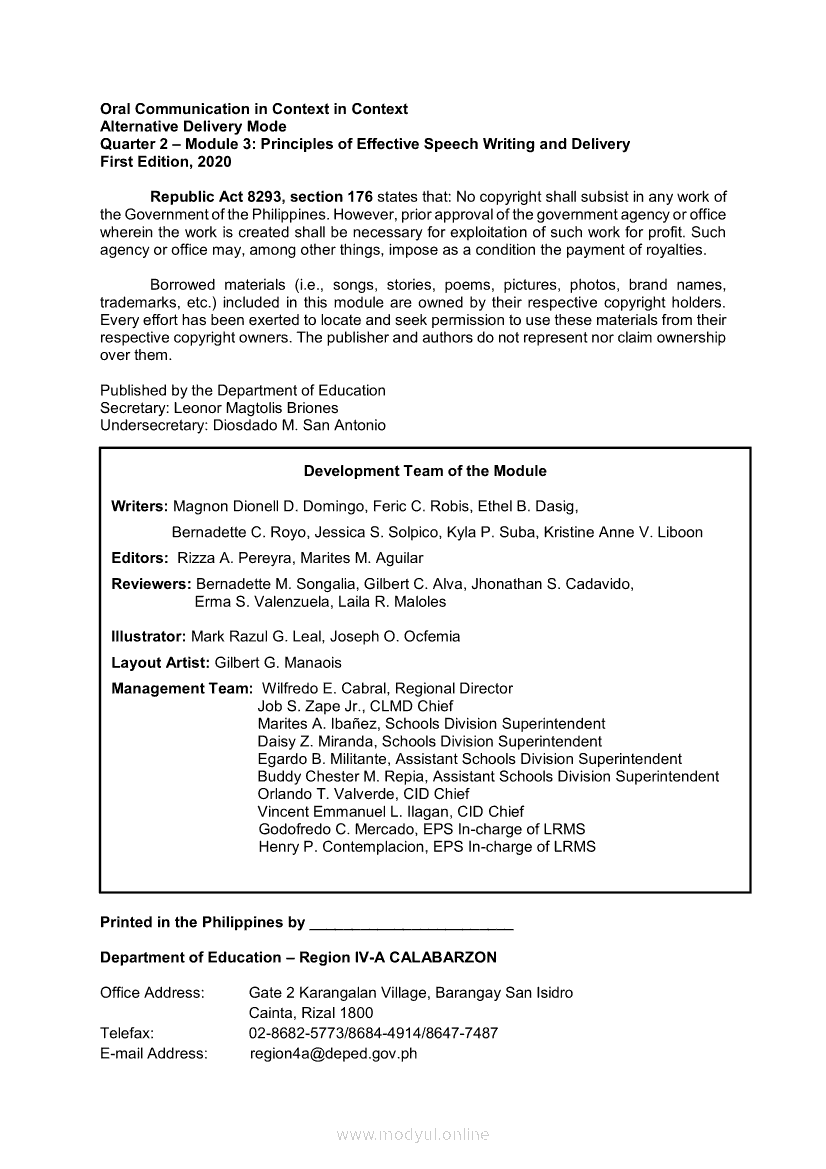 Oral Communication in Context Quarter 2 – Module 3: Principles of Effective Speech Writing and DeliveryApr 22, 2021 SHSGrab your copy of Collegio Advance - ULTIMATE Updated College Entrance Exam Reviewer and pass with flying colors 🎉. Oral Communication in ContextRelatedOral Communication in Context Module 7: Types of Speech ActOral Communication in Context Module 1-Functions, Nature and Process of CommunicationOral Communication in Context Oral Communication in Context (PIVOT)Oral Communication in Context Module 3: Strategies to Avoid Communication BreakdownOral Communication in Context Module 5: Types of Speech Context