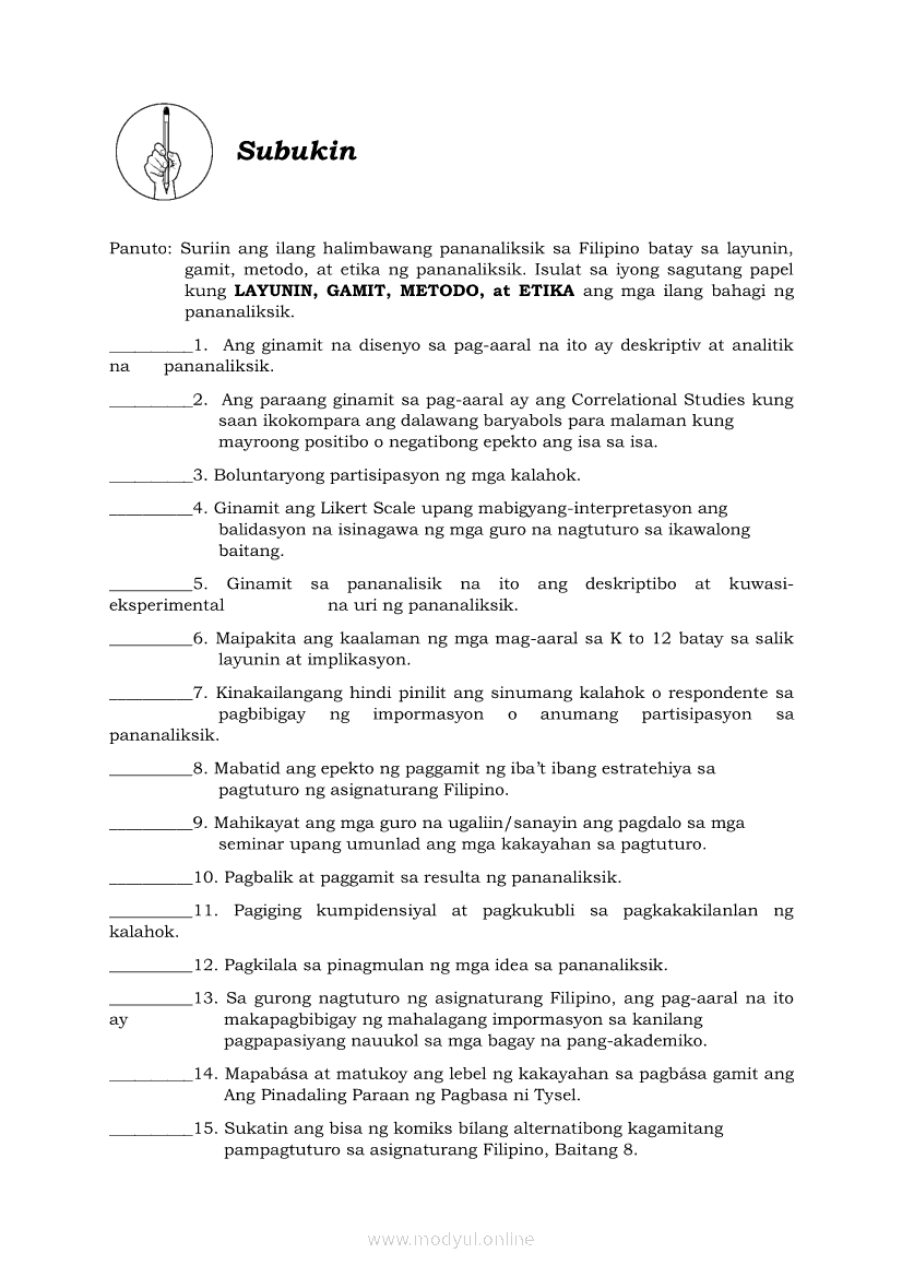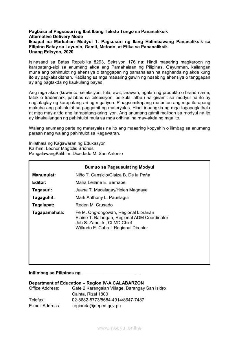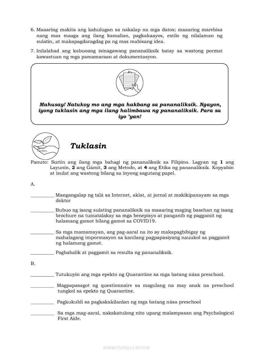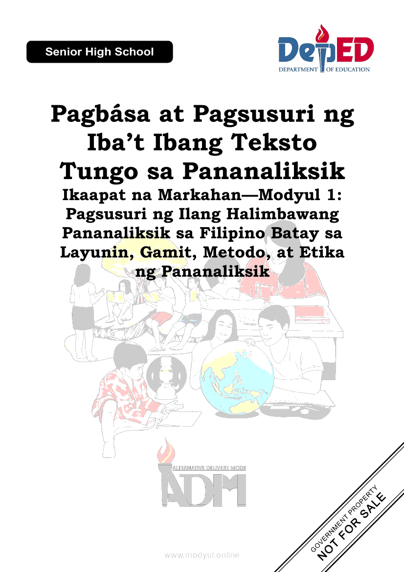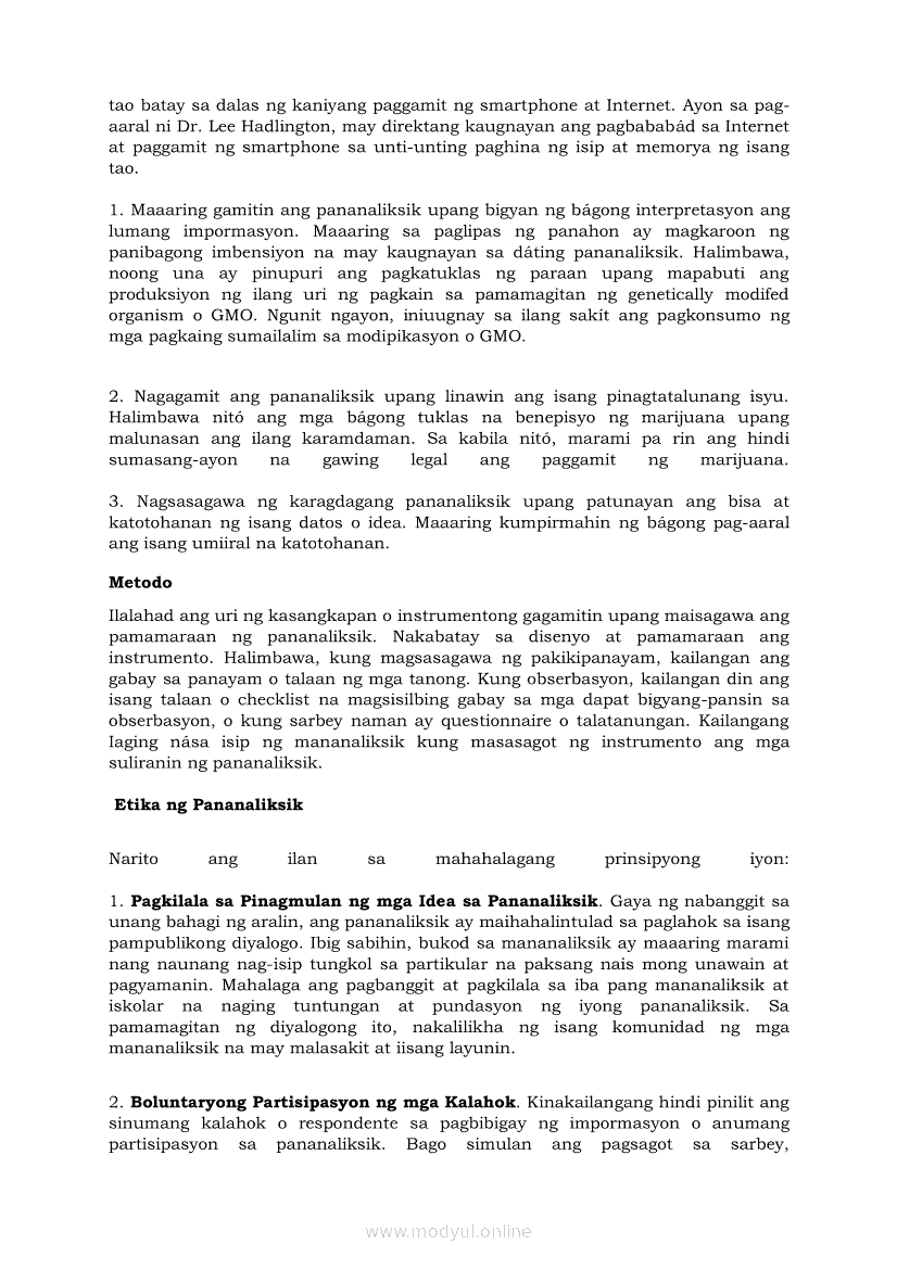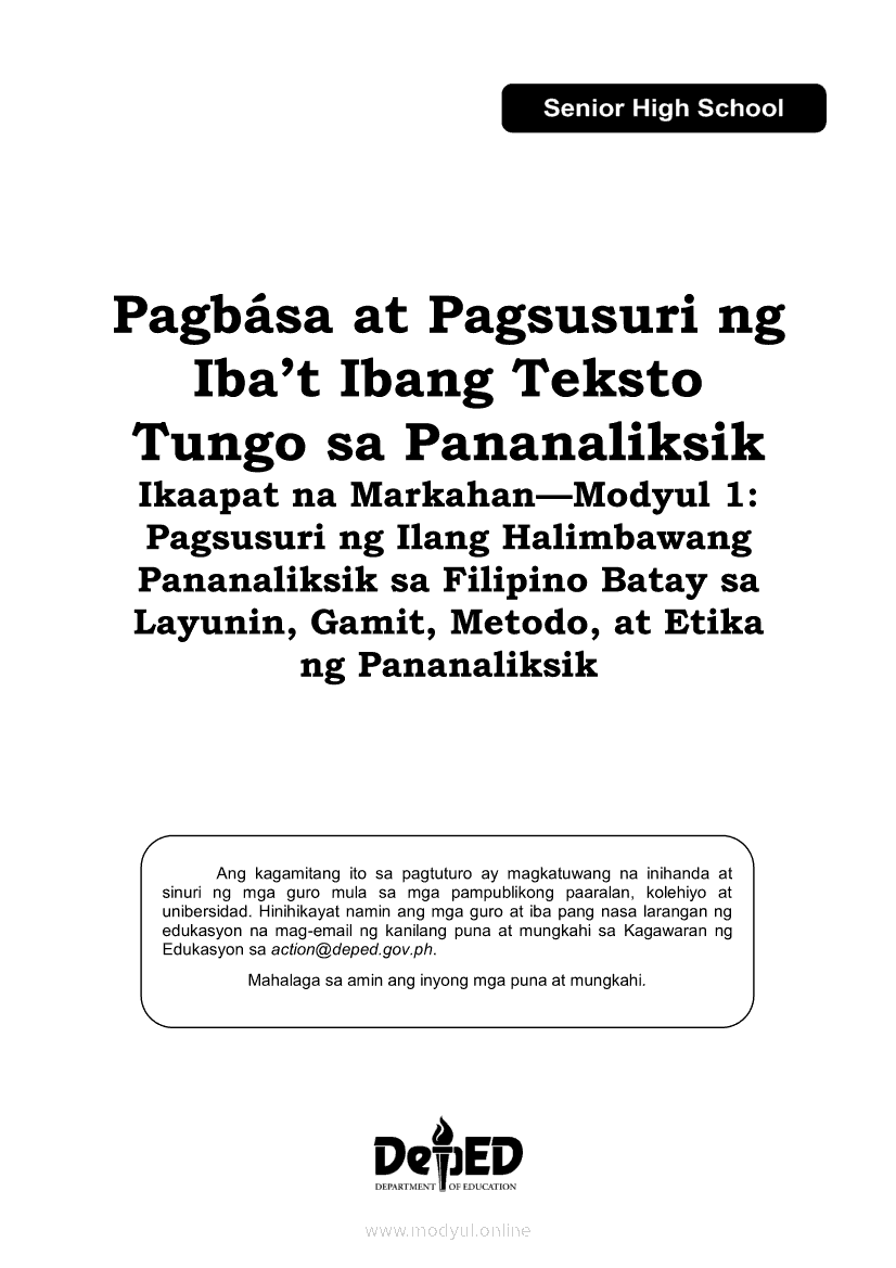 Pagbasa at Pagsusuri ng Iba't Ibang Teksto Tungo sa Pananaliksik Ikaapat na Markahan—Modyul 1: Pagsusuri ng Ilang Halimbawang Pananaliksik sa Filipino Batay sa Layunin, Gamit, Metodo, at Etika ng PananaliksikApr 22, 2021 SHSGrab your copy of Collegio Advance - ULTIMATE Updated College Entrance Exam Reviewer and pass with flying colors 🎉. Pagbasa at Pagsusuri ng Iba't Ibang Teksto Tungo sa PananaliksikRelatedPagbasa at Pagsusuri ng Iba't Ibang Teksto Tungo sa Pananaliksik Ikaapat na Markahan–Modyul 4: Lohikal at Ugnayan ng mga Idea sa Pagsulat ng PananaliksikPagbasa at Pagsusuri ng Iba't Ibang Teksto Tungo sa Pananaliksik Ikaapat na Markahan–Modyul 5: Pagbuo ng Isang Maikling Pananaliksik sa mga Napapanahong IsyuPagbasa at Pagsusuri ng Iba't Ibang Teksto Tungo sa Pananaliksik Ikaapat na Markahan–Modyul 2: Pagbibigay-Kahulugan sa mga Konseptong Kaugnay ng PananaliksikPagbasa at Pagsusuri ng Iba't Ibang Teksto Tungo sa Pananaliksik Ikaapat na Markahan–Modyul 3: Proseso sa Pagsulat ng PananaliksikPagbasa at Pagsusuri ng Iba't Ibang Teksto Tungo sa Pananaliksik (PIVOT)