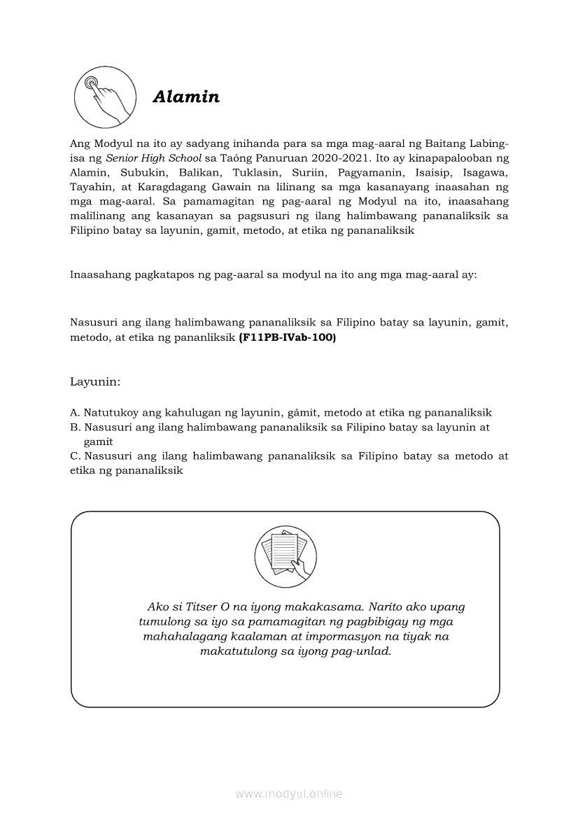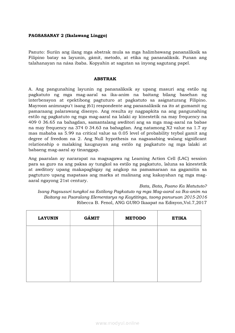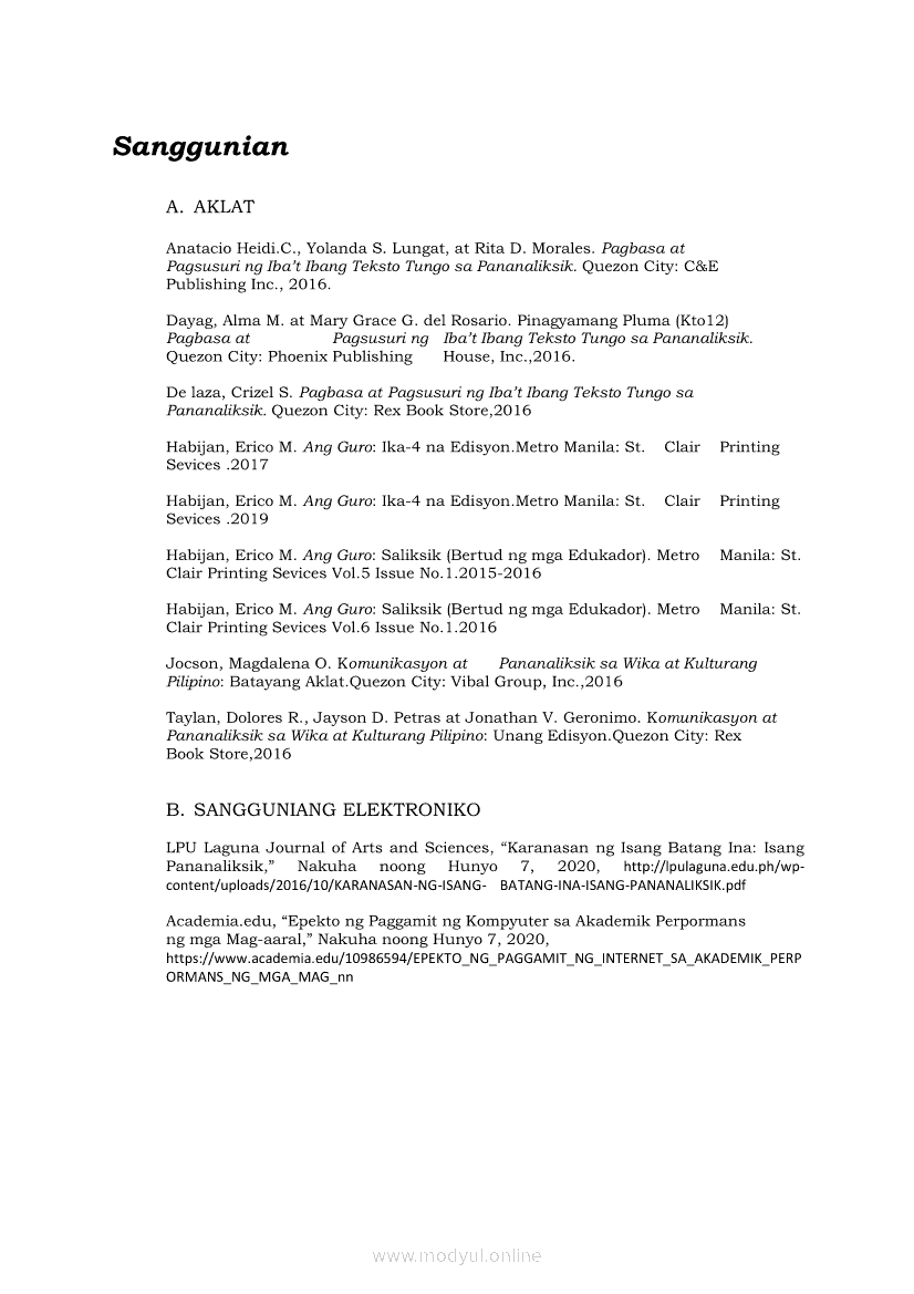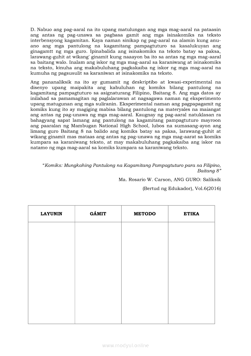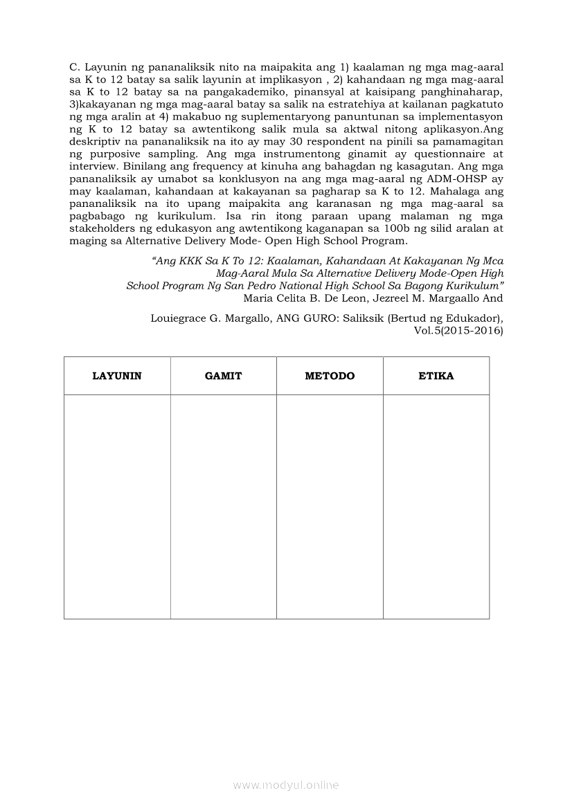 Pagbasa at Pagsusuri ng Iba't Ibang Teksto Tungo sa Pananaliksik Ikaapat na Markahan—Modyul 1: Pagsusuri ng Ilang Halimbawang Pananaliksik sa Filipino Batay sa Layunin, Gamit, Metodo, at Etika ng PananaliksikApr 22, 2021 SHSGrab your copy of Collegio Advance - ULTIMATE Updated College Entrance Exam Reviewer and pass with flying colors 🎉. Pagbasa at Pagsusuri ng Iba't Ibang Teksto Tungo sa PananaliksikRelatedPagbasa at Pagsusuri ng Iba't Ibang Teksto Tungo sa Pananaliksik Ikaapat na Markahan–Modyul 4: Lohikal at Ugnayan ng mga Idea sa Pagsulat ng PananaliksikPagbasa at Pagsusuri ng Iba't Ibang Teksto Tungo sa Pananaliksik Ikaapat na Markahan–Modyul 5: Pagbuo ng Isang Maikling Pananaliksik sa mga Napapanahong IsyuPagbasa at Pagsusuri ng Iba't Ibang Teksto Tungo sa Pananaliksik Ikaapat na Markahan–Modyul 2: Pagbibigay-Kahulugan sa mga Konseptong Kaugnay ng PananaliksikPagbasa at Pagsusuri ng Iba't Ibang Teksto Tungo sa Pananaliksik Ikaapat na Markahan–Modyul 3: Proseso sa Pagsulat ng PananaliksikPagbasa at Pagsusuri ng Iba't Ibang Teksto Tungo sa Pananaliksik (PIVOT)
