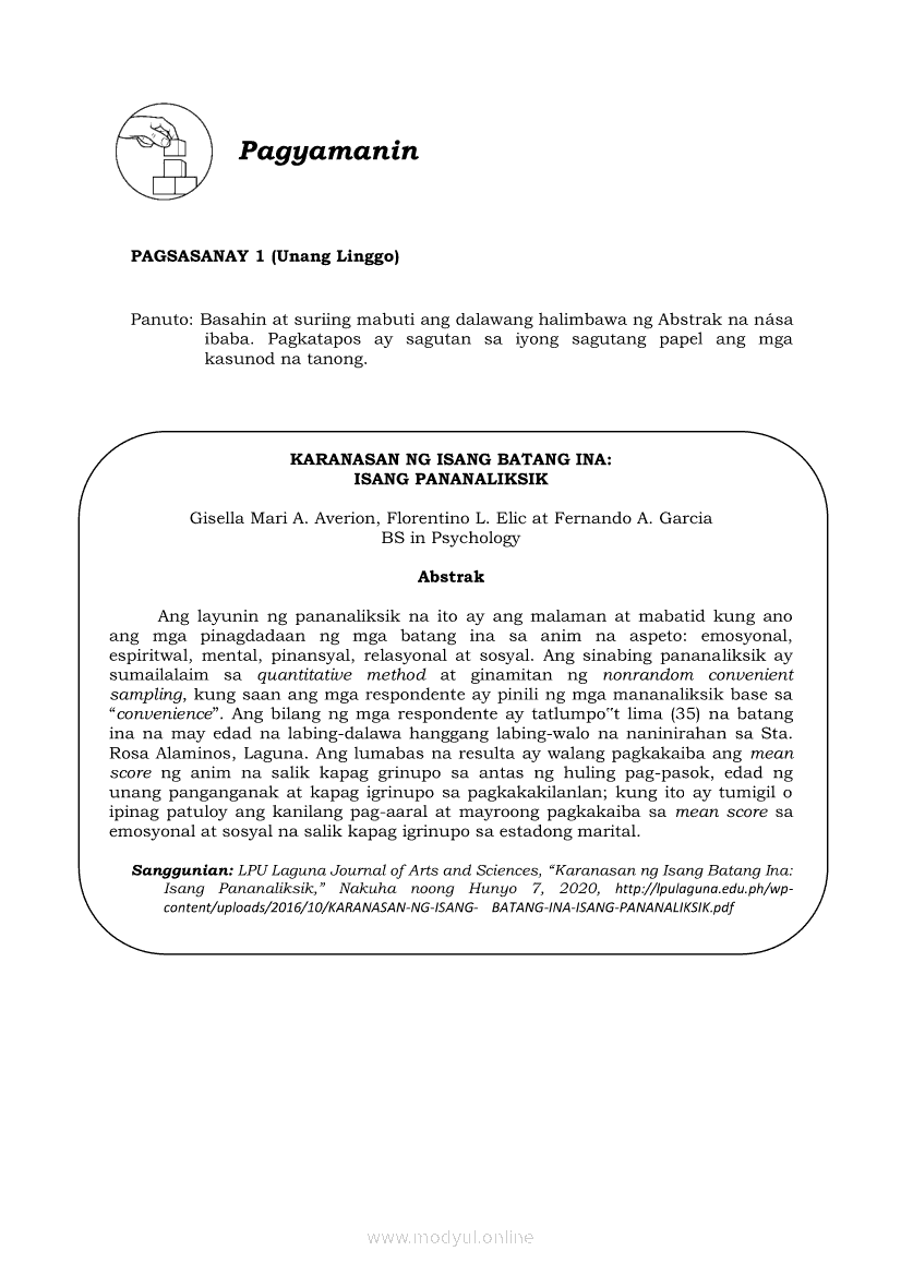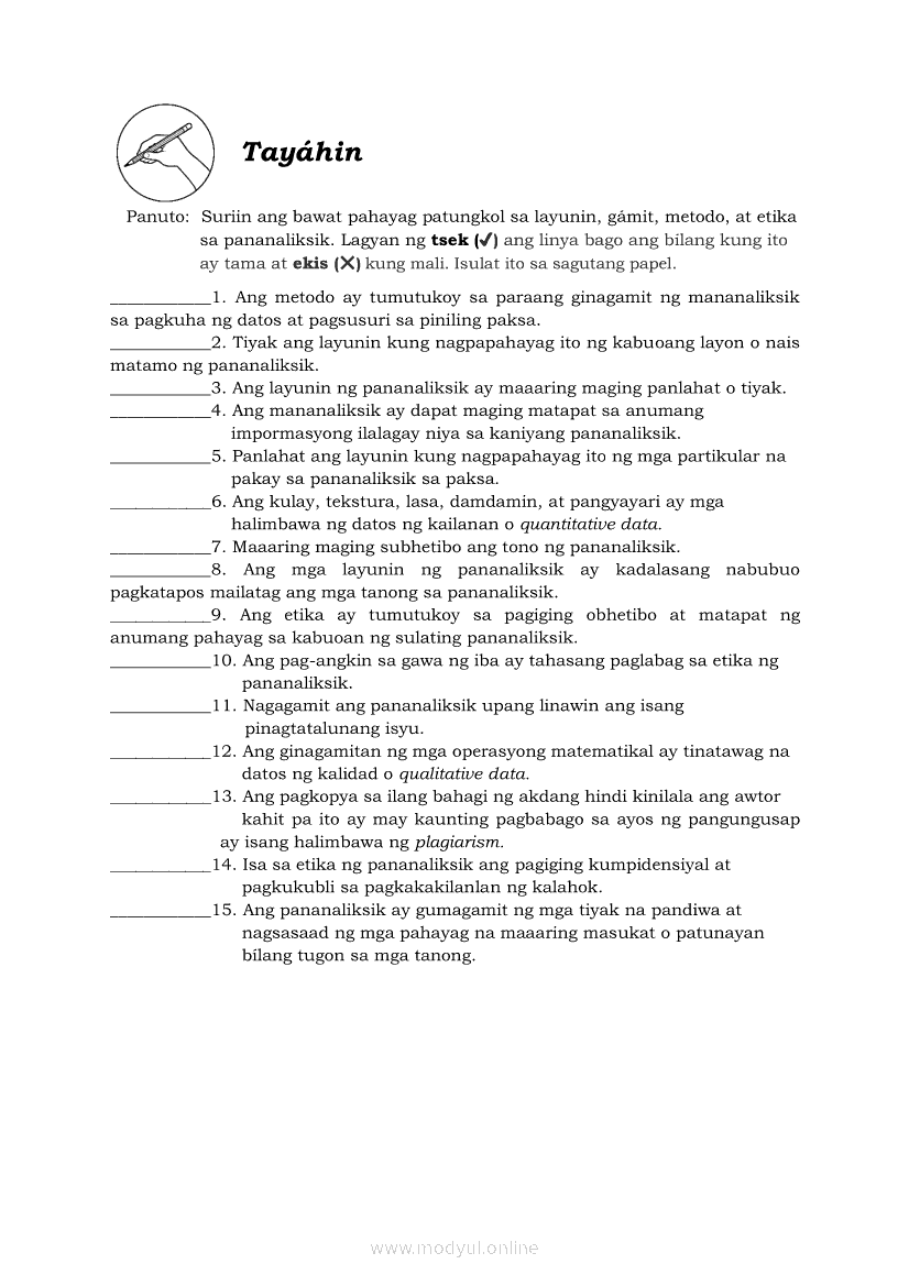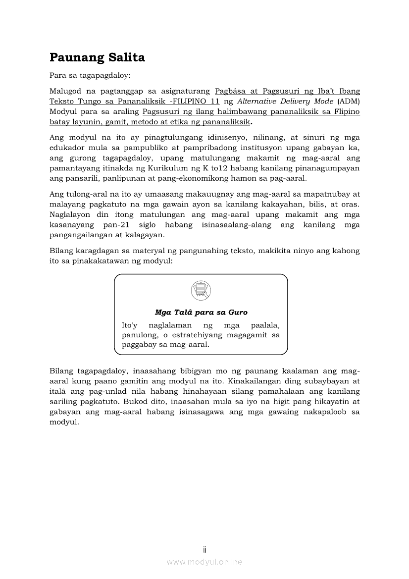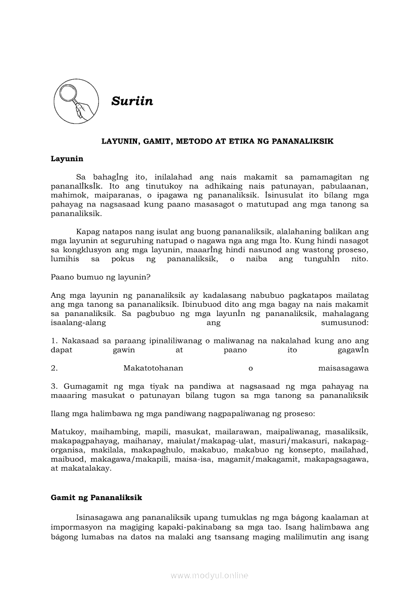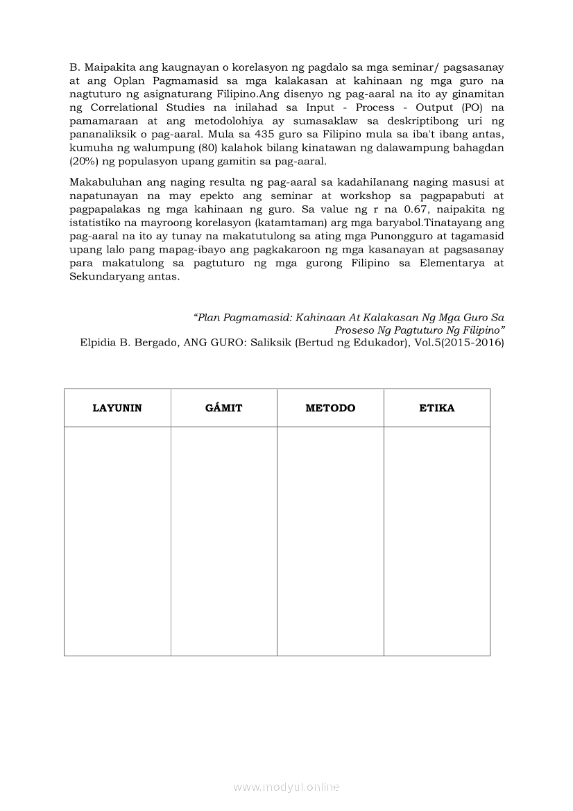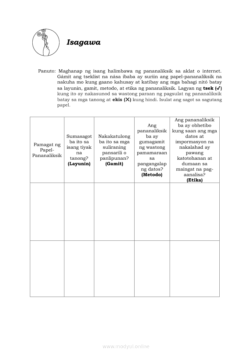 Pagbasa at Pagsusuri ng Iba't Ibang Teksto Tungo sa Pananaliksik Ikaapat na Markahan—Modyul 1: Pagsusuri ng Ilang Halimbawang Pananaliksik sa Filipino Batay sa Layunin, Gamit, Metodo, at Etika ng PananaliksikApr 22, 2021 SHSGrab your copy of Collegio Advance - ULTIMATE Updated College Entrance Exam Reviewer and pass with flying colors 🎉. Pagbasa at Pagsusuri ng Iba't Ibang Teksto Tungo sa PananaliksikRelatedPagbasa at Pagsusuri ng Iba't Ibang Teksto Tungo sa Pananaliksik Ikaapat na Markahan–Modyul 4: Lohikal at Ugnayan ng mga Idea sa Pagsulat ng PananaliksikPagbasa at Pagsusuri ng Iba't Ibang Teksto Tungo sa Pananaliksik Ikaapat na Markahan–Modyul 5: Pagbuo ng Isang Maikling Pananaliksik sa mga Napapanahong IsyuPagbasa at Pagsusuri ng Iba't Ibang Teksto Tungo sa Pananaliksik Ikaapat na Markahan–Modyul 2: Pagbibigay-Kahulugan sa mga Konseptong Kaugnay ng PananaliksikPagbasa at Pagsusuri ng Iba't Ibang Teksto Tungo sa Pananaliksik Ikaapat na Markahan–Modyul 3: Proseso sa Pagsulat ng PananaliksikPagbasa at Pagsusuri ng Iba't Ibang Teksto Tungo sa Pananaliksik (PIVOT)