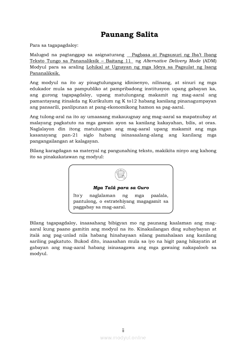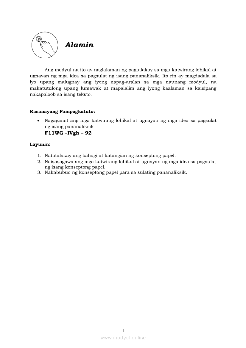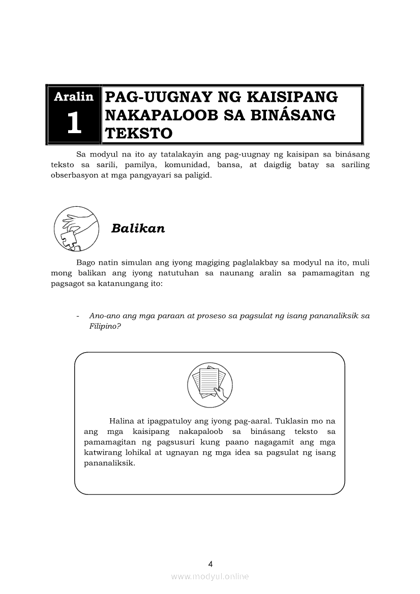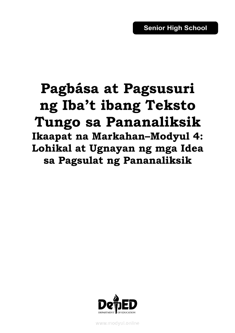 Pagbasa at Pagsusuri ng Iba't Ibang Teksto Tungo sa Pananaliksik Ikaapat na Markahan–Modyul 4: Lohikal at Ugnayan ng mga Idea sa Pagsulat ng PananaliksikApr 22, 2021 SHSGrab your copy of Collegio Advance - ULTIMATE Updated College Entrance Exam Reviewer and pass with flying colors 🎉. Pagbasa at Pagsusuri ng Iba't Ibang Teksto Tungo sa PananaliksikRelatedPagbasa at Pagsusuri ng Iba't Ibang Teksto Tungo sa Pananaliksik (PIVOT)Pagbasa at Pagsusuri ng Iba't Ibang Teksto Tungo sa Pananaliksik Ikaapat na Markahan–Modyul 3: Proseso sa Pagsulat ng PananaliksikPagbasa at Pagsusuri ng Iba't Ibang Teksto Tungo sa Pananaliksik Ikaapat na Markahan—Modyul 1: Pagsusuri ng Ilang Halimbawang Pananaliksik sa Filipino Batay sa Layunin, Gamit, Metodo, at Etika ng PananaliksikPagbasa at Pagsusuri ng Iba't Ibang Teksto Tungo sa Pananaliksik Ikaapat na Markahan–Modyul 2: Pagbibigay-Kahulugan sa mga Konseptong Kaugnay ng PananaliksikPagbasa at Pagsusuri ng Iba't Ibang Teksto Tungo sa Pananaliksik Ikaapat na Markahan–Modyul 5: Pagbuo ng Isang Maikling Pananaliksik sa mga Napapanahong Isyu