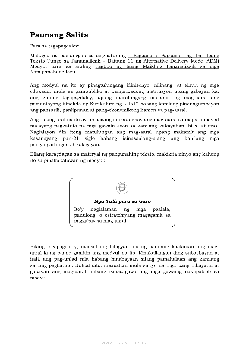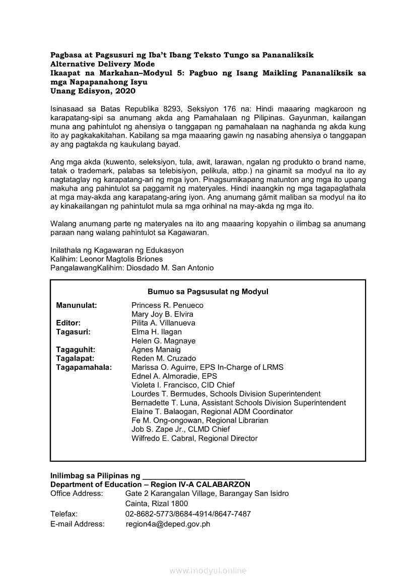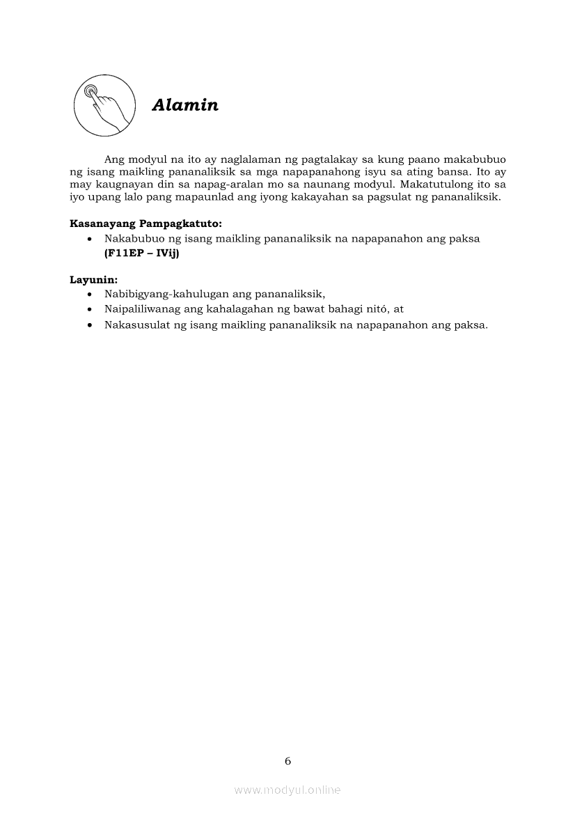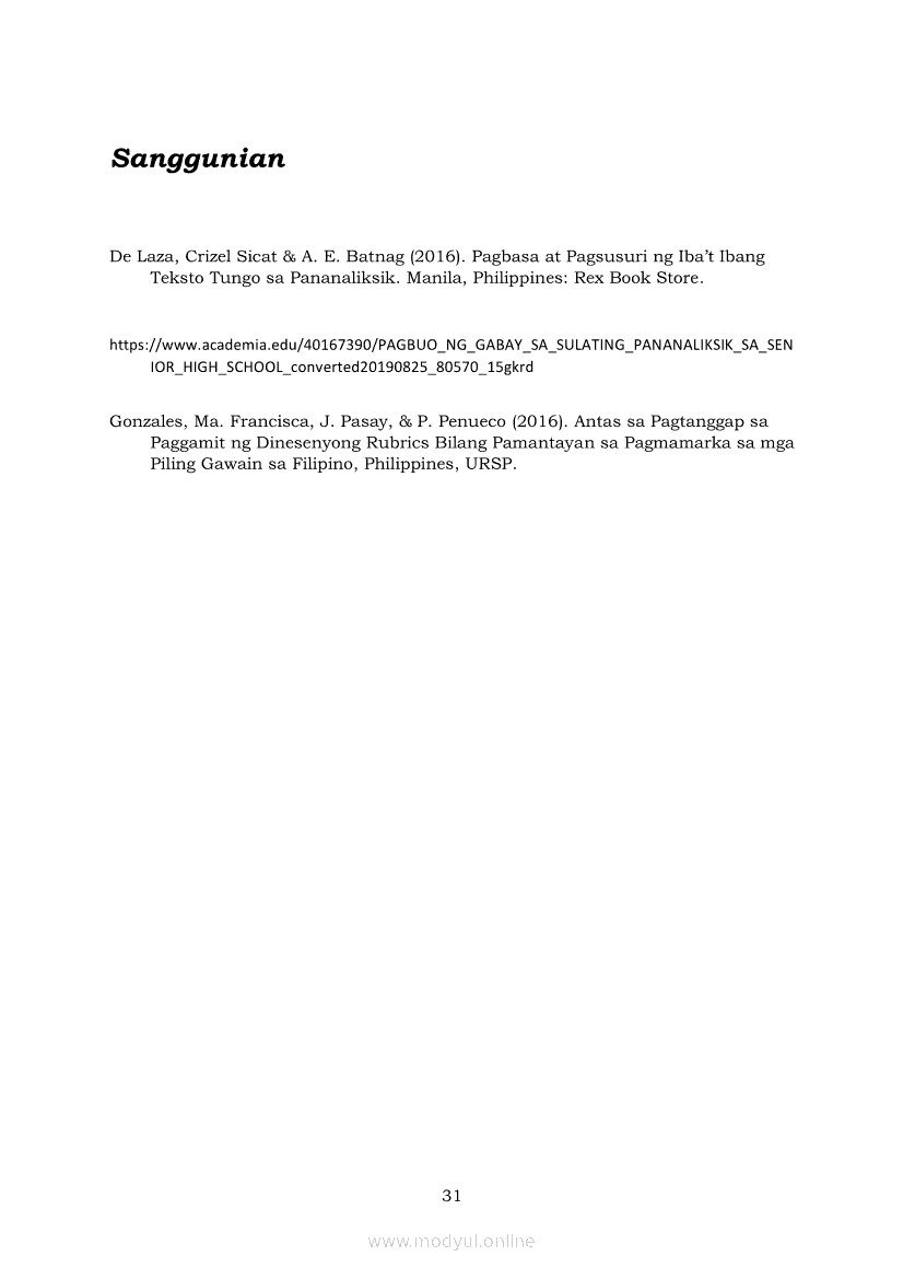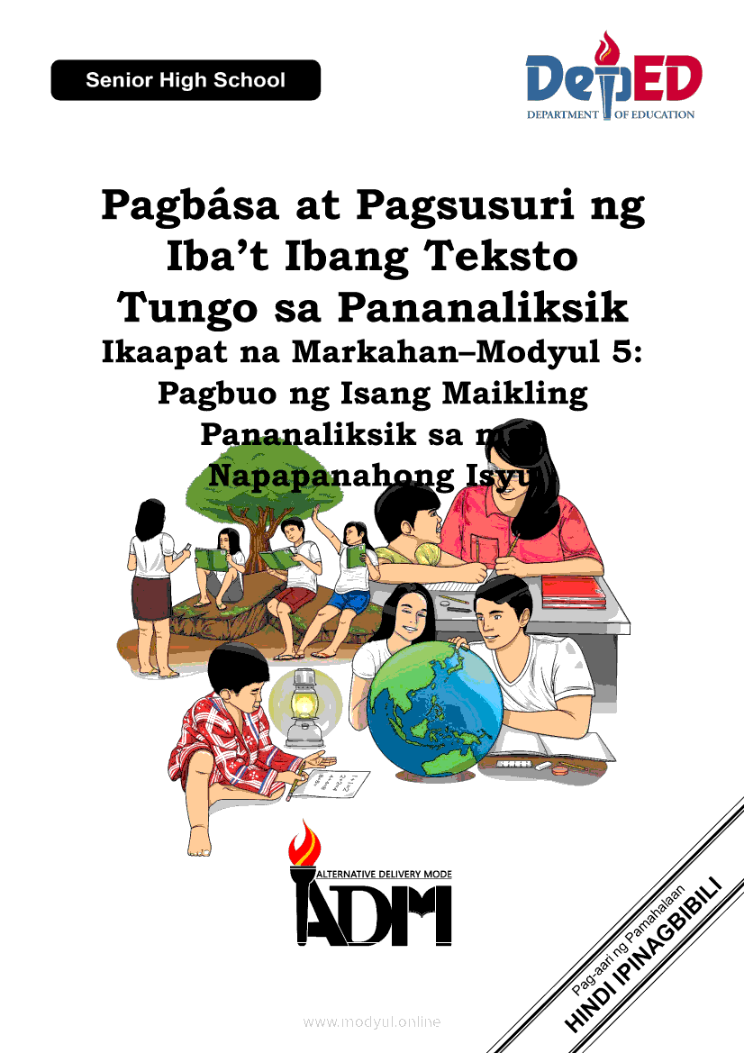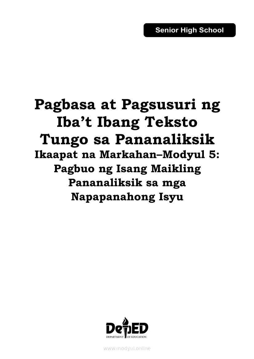 Pagbasa at Pagsusuri ng Iba't Ibang Teksto Tungo sa Pananaliksik Ikaapat na Markahan–Modyul 5: Pagbuo ng Isang Maikling Pananaliksik sa mga Napapanahong IsyuApr 22, 2021 SHSGrab your copy of Collegio Advance - ULTIMATE Updated College Entrance Exam Reviewer and pass with flying colors 🎉. Pagbasa at Pagsusuri ng Iba't Ibang Teksto Tungo sa PananaliksikRelatedPagbasa at Pagsusuri ng Iba't Ibang Teksto Tungo sa Pananaliksik (PIVOT)Pagbasa at Pagsusuri ng Iba't Ibang Teksto Tungo sa Pananaliksik Ikaapat na Markahan—Modyul 1: Pagsusuri ng Ilang Halimbawang Pananaliksik sa Filipino Batay sa Layunin, Gamit, Metodo, at Etika ng PananaliksikPagbasa at Pagsusuri ng Iba't Ibang Teksto Tungo sa Pananaliksik Ikaapat na Markahan–Modyul 2: Pagbibigay-Kahulugan sa mga Konseptong Kaugnay ng PananaliksikPagbasa at Pagsusuri ng Iba't Ibang Teksto Tungo sa Pananaliksik Ikaapat na Markahan–Modyul 3: Proseso sa Pagsulat ng PananaliksikPagbasa at Pagsusuri ng Iba't Ibang Teksto Tungo sa Pananaliksik Ikaapat na Markahan–Modyul 4: Lohikal at Ugnayan ng mga Idea sa Pagsulat ng Pananaliksik