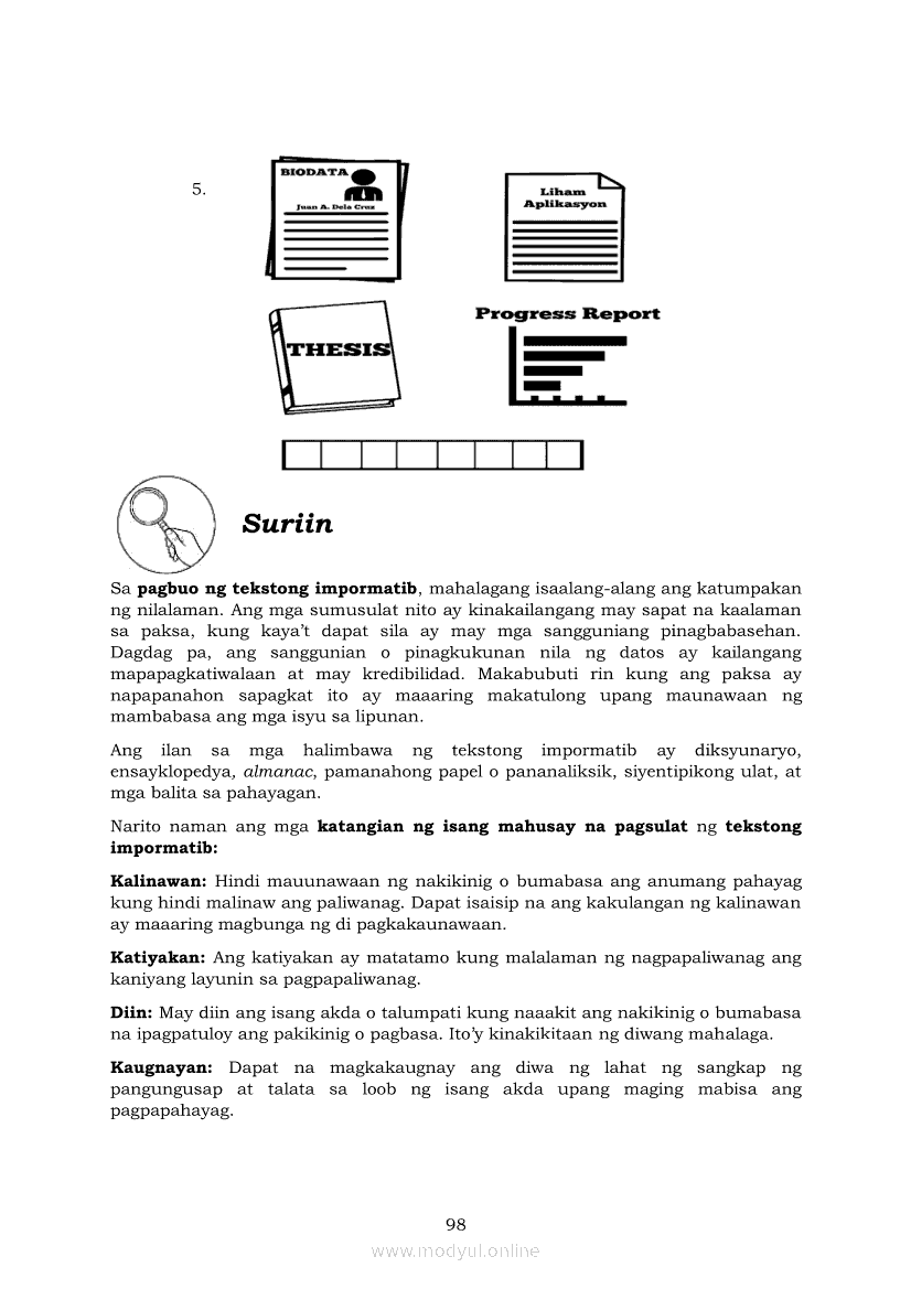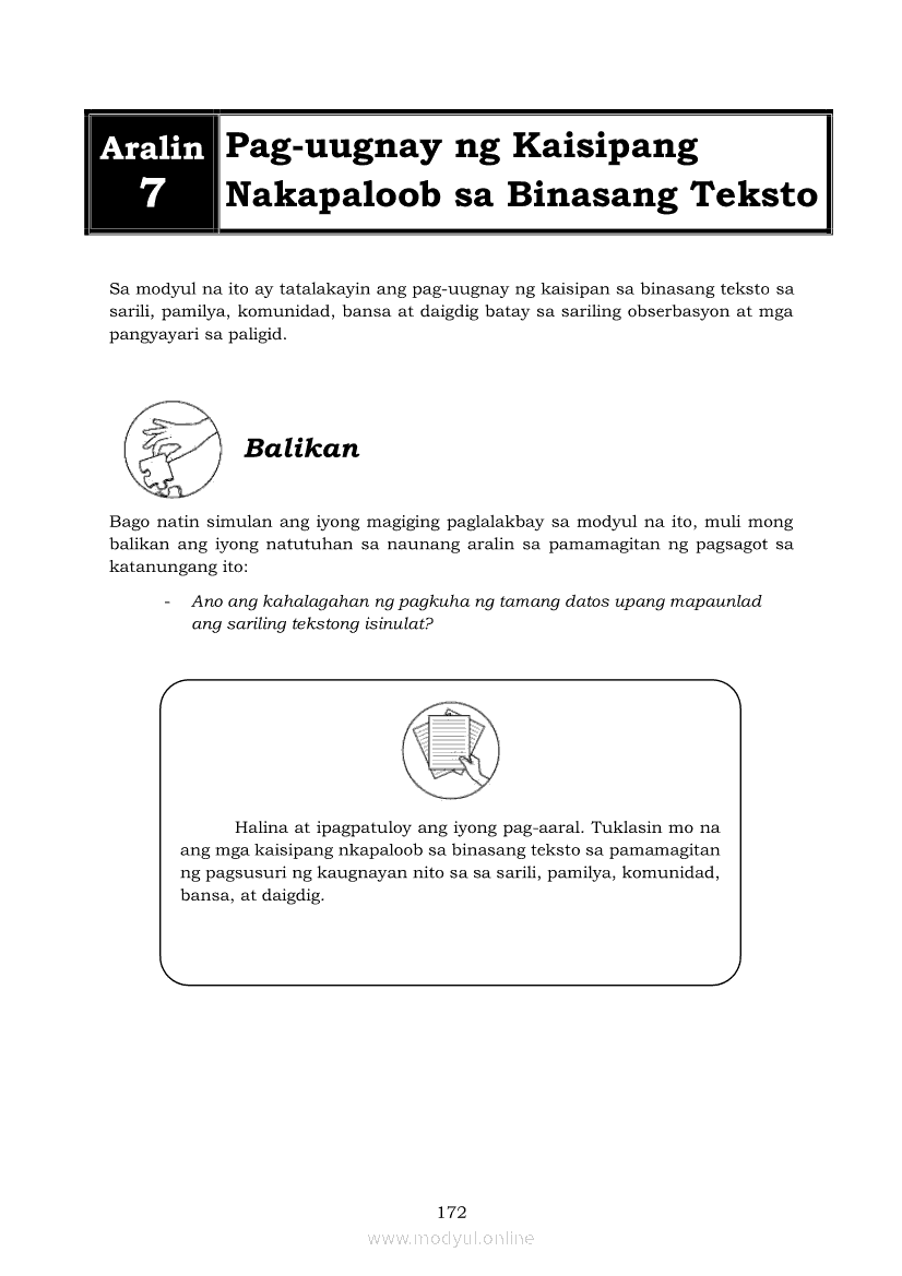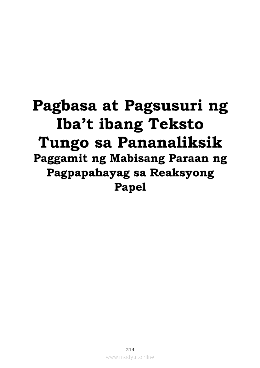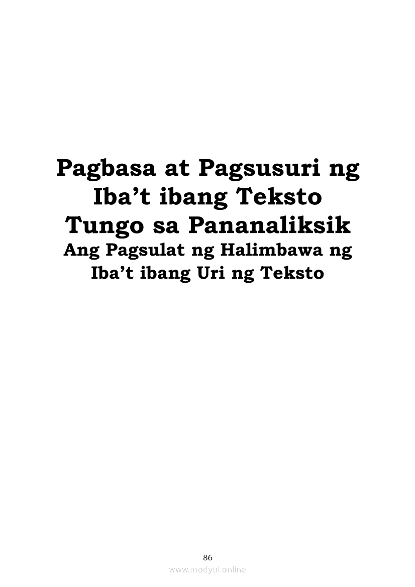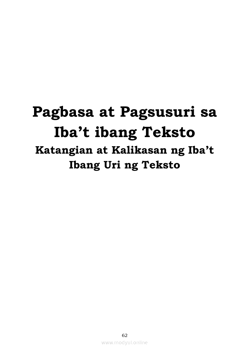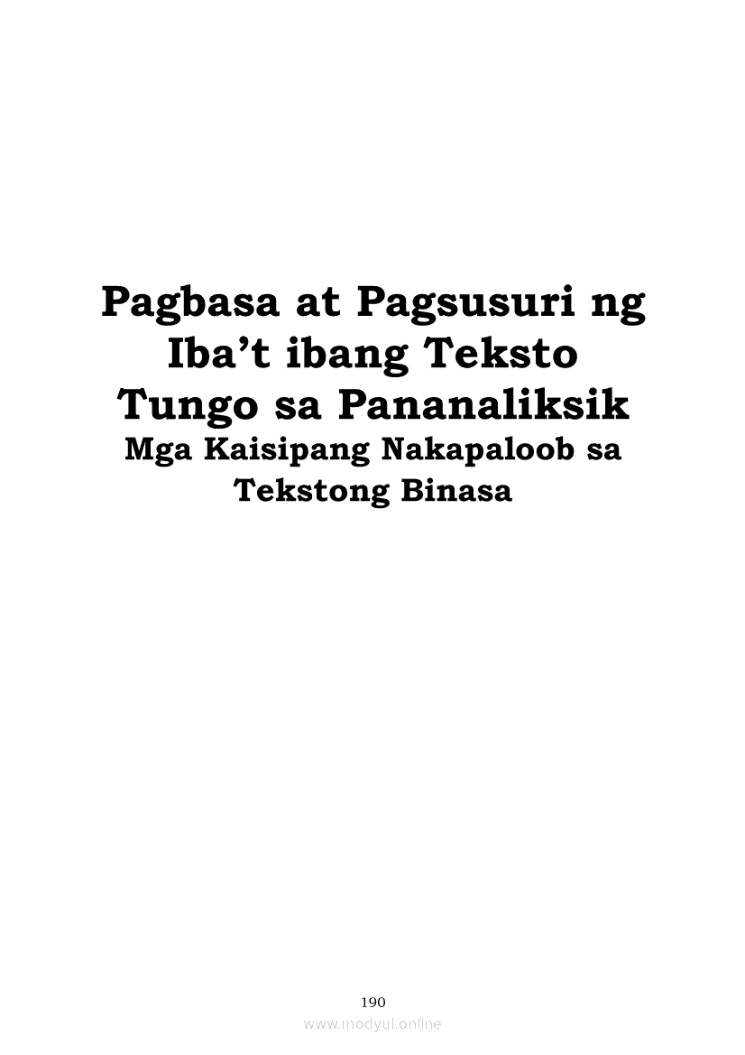 Pagbasa at Pagsusuri ng Iba't Ibang Teksto Tungo sa Pananaliksik (PIVOT)Apr 22, 2021 SHSGrab your copy of Collegio Advance - ULTIMATE Updated College Entrance Exam Reviewer and pass with flying colors 🎉. Pagbasa at Pagsusuri ng Iba't Ibang Teksto Tungo sa PananaliksikRelatedPagbasa at Pagsusuri ng Iba't Ibang Teksto Tungo sa Pananaliksik Ikaapat na Markahan–Modyul 4: Lohikal at Ugnayan ng mga Idea sa Pagsulat ng PananaliksikPagbasa at Pagsusuri ng Iba't Ibang Teksto Tungo sa Pananaliksik Ikaapat na Markahan–Modyul 3: Proseso sa Pagsulat ng PananaliksikPagbasa at Pagsusuri ng Iba't Ibang Teksto Tungo sa Pananaliksik Ikaapat na Markahan—Modyul 1: Pagsusuri ng Ilang Halimbawang Pananaliksik sa Filipino Batay sa Layunin, Gamit, Metodo, at Etika ng PananaliksikPagbasa at Pagsusuri ng Iba't Ibang Teksto Tungo sa Pananaliksik Ikaapat na Markahan–Modyul 2: Pagbibigay-Kahulugan sa mga Konseptong Kaugnay ng PananaliksikPagbasa at Pagsusuri ng Iba't Ibang Teksto Tungo sa Pananaliksik Ikaapat na Markahan–Modyul 5: Pagbuo ng Isang Maikling Pananaliksik sa mga Napapanahong Isyu