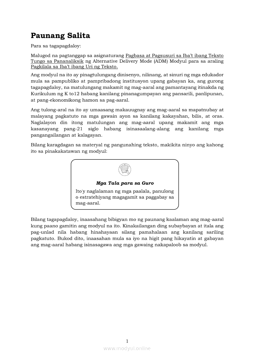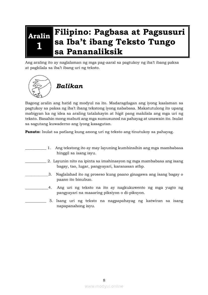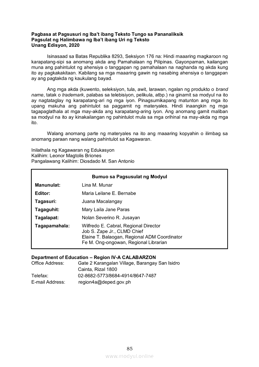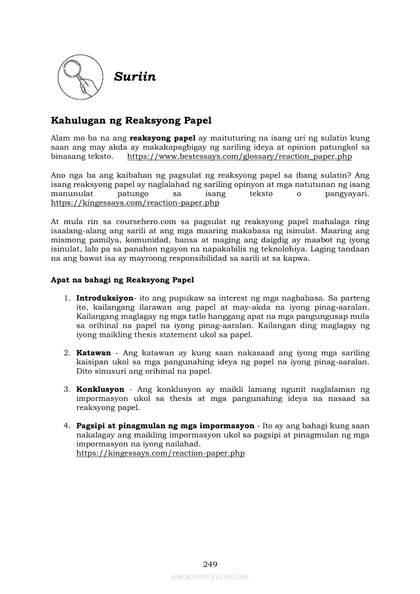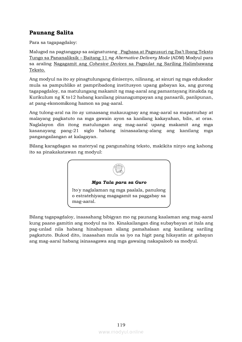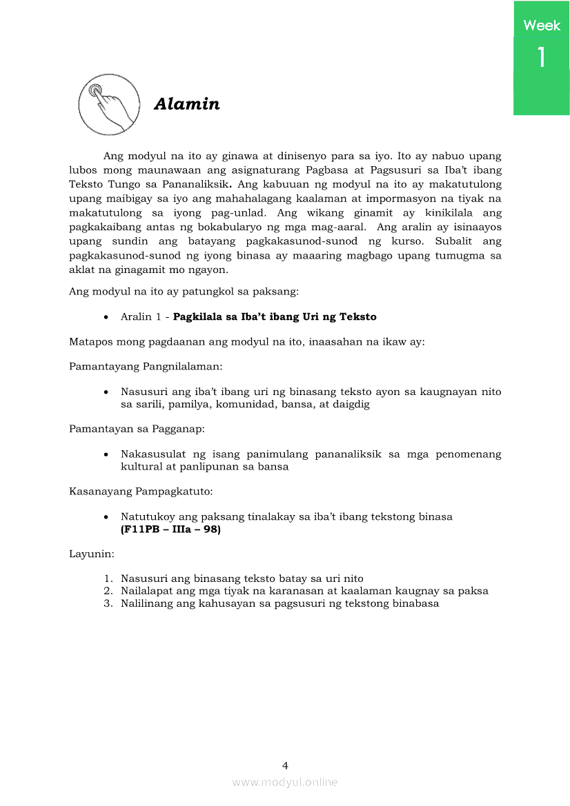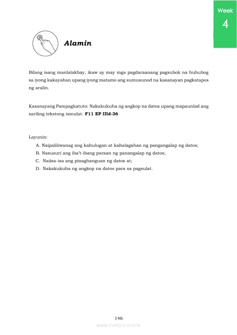 Pagbasa at Pagsusuri ng Iba't Ibang Teksto Tungo sa Pananaliksik (PIVOT)Apr 22, 2021 SHSGrab your copy of Collegio Advance - ULTIMATE Updated College Entrance Exam Reviewer and pass with flying colors 🎉. Pagbasa at Pagsusuri ng Iba't Ibang Teksto Tungo sa PananaliksikRelatedPagbasa at Pagsusuri ng Iba't Ibang Teksto Tungo sa Pananaliksik Ikaapat na Markahan–Modyul 4: Lohikal at Ugnayan ng mga Idea sa Pagsulat ng PananaliksikPagbasa at Pagsusuri ng Iba't Ibang Teksto Tungo sa Pananaliksik Ikaapat na Markahan–Modyul 3: Proseso sa Pagsulat ng PananaliksikPagbasa at Pagsusuri ng Iba't Ibang Teksto Tungo sa Pananaliksik Ikaapat na Markahan—Modyul 1: Pagsusuri ng Ilang Halimbawang Pananaliksik sa Filipino Batay sa Layunin, Gamit, Metodo, at Etika ng PananaliksikPagbasa at Pagsusuri ng Iba't Ibang Teksto Tungo sa Pananaliksik Ikaapat na Markahan–Modyul 2: Pagbibigay-Kahulugan sa mga Konseptong Kaugnay ng PananaliksikPagbasa at Pagsusuri ng Iba't Ibang Teksto Tungo sa Pananaliksik Ikaapat na Markahan–Modyul 5: Pagbuo ng Isang Maikling Pananaliksik sa mga Napapanahong Isyu