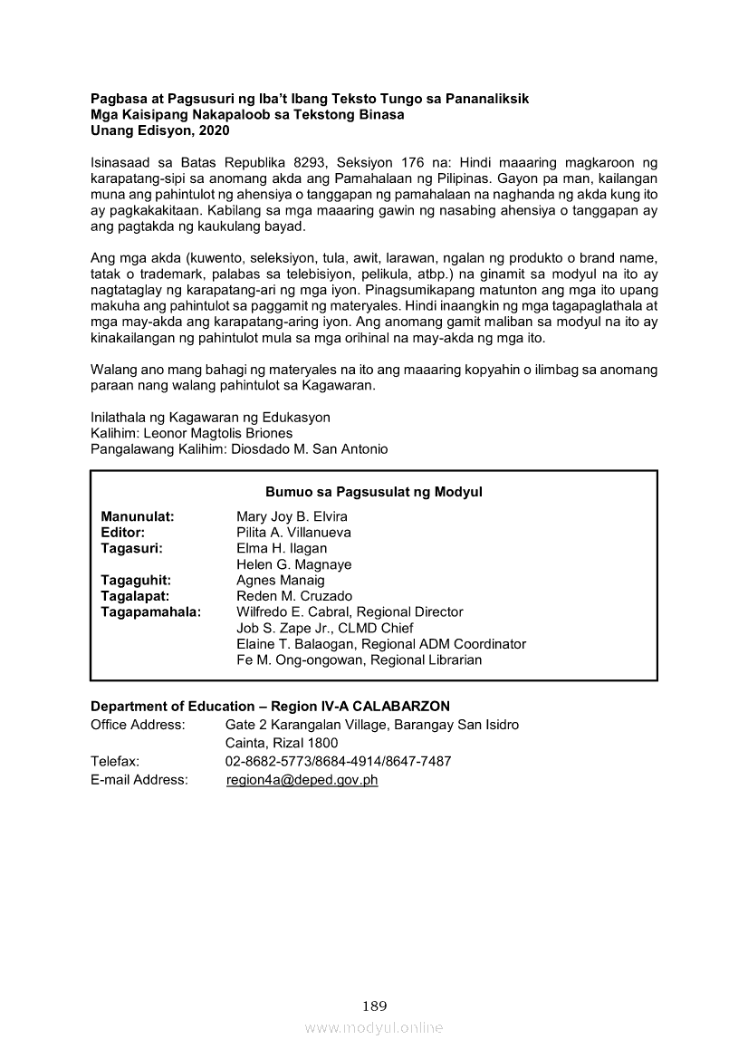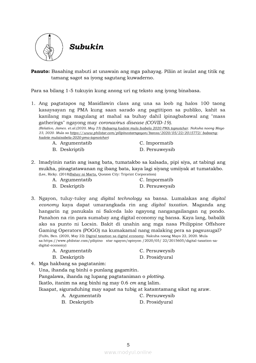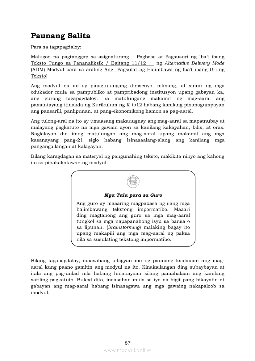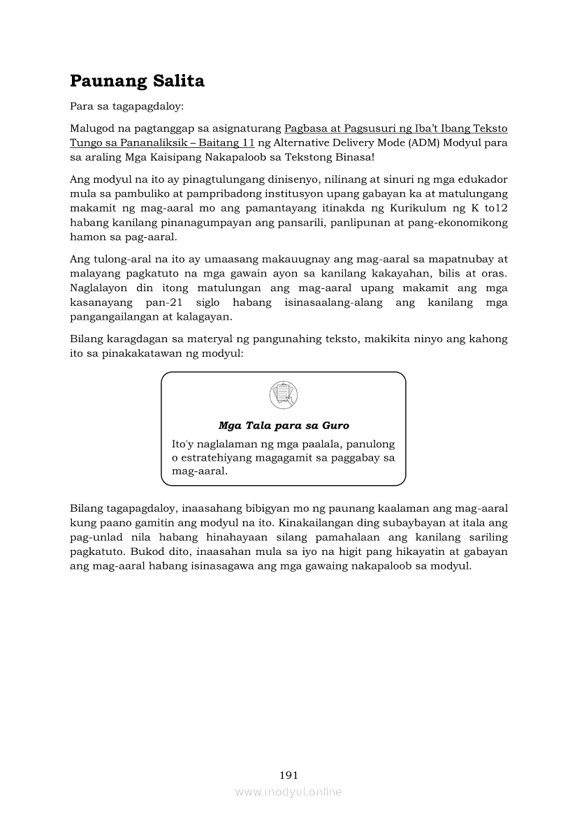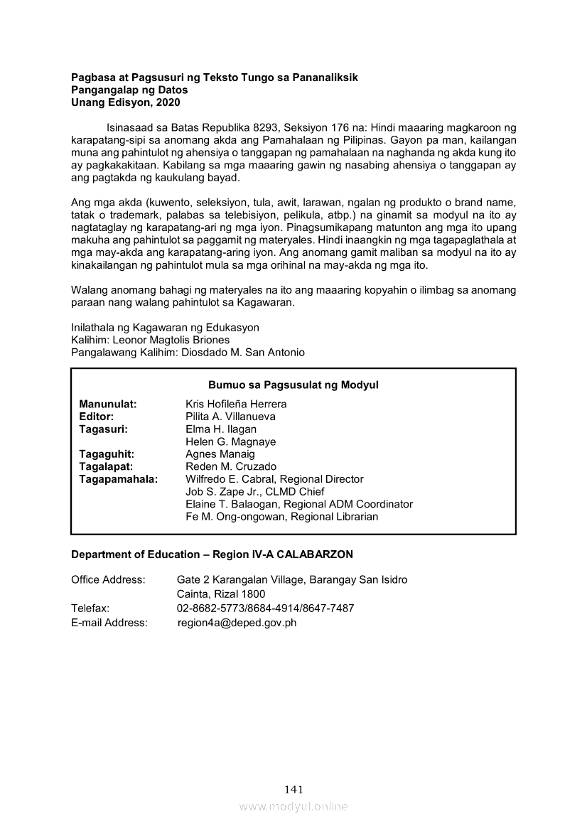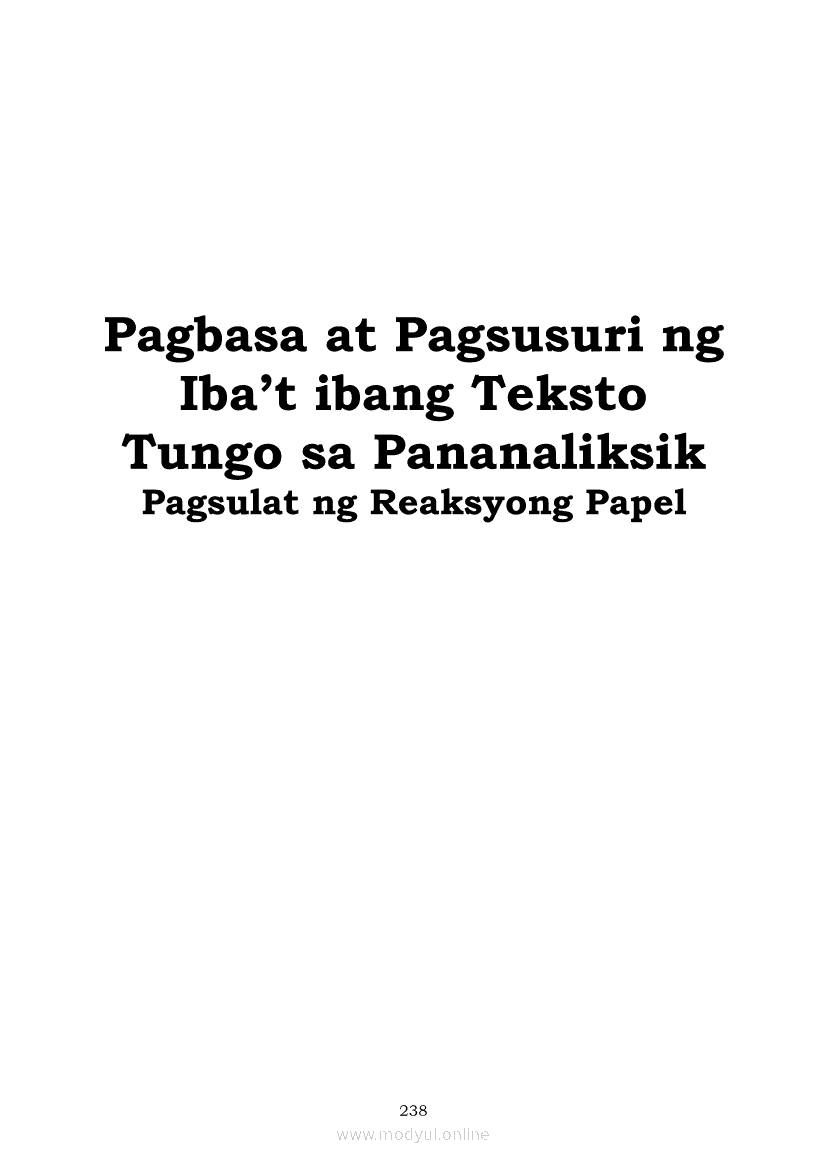 Pagbasa at Pagsusuri ng Iba't Ibang Teksto Tungo sa Pananaliksik (PIVOT)Apr 22, 2021 SHSGrab your copy of Collegio Advance - ULTIMATE Updated College Entrance Exam Reviewer and pass with flying colors 🎉. Pagbasa at Pagsusuri ng Iba't Ibang Teksto Tungo sa PananaliksikRelatedPagbasa at Pagsusuri ng Iba't Ibang Teksto Tungo sa Pananaliksik Ikaapat na Markahan–Modyul 4: Lohikal at Ugnayan ng mga Idea sa Pagsulat ng PananaliksikPagbasa at Pagsusuri ng Iba't Ibang Teksto Tungo sa Pananaliksik Ikaapat na Markahan–Modyul 3: Proseso sa Pagsulat ng PananaliksikPagbasa at Pagsusuri ng Iba't Ibang Teksto Tungo sa Pananaliksik Ikaapat na Markahan—Modyul 1: Pagsusuri ng Ilang Halimbawang Pananaliksik sa Filipino Batay sa Layunin, Gamit, Metodo, at Etika ng PananaliksikPagbasa at Pagsusuri ng Iba't Ibang Teksto Tungo sa Pananaliksik Ikaapat na Markahan–Modyul 2: Pagbibigay-Kahulugan sa mga Konseptong Kaugnay ng PananaliksikPagbasa at Pagsusuri ng Iba't Ibang Teksto Tungo sa Pananaliksik Ikaapat na Markahan–Modyul 5: Pagbuo ng Isang Maikling Pananaliksik sa mga Napapanahong Isyu