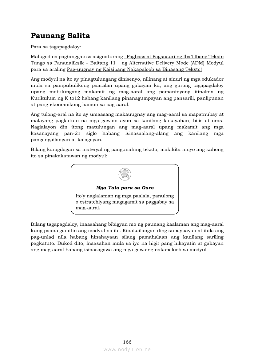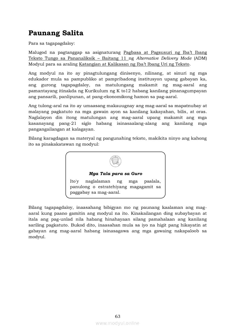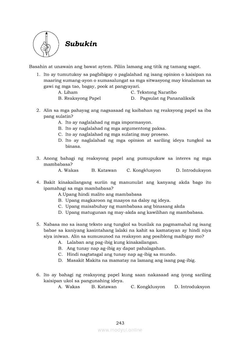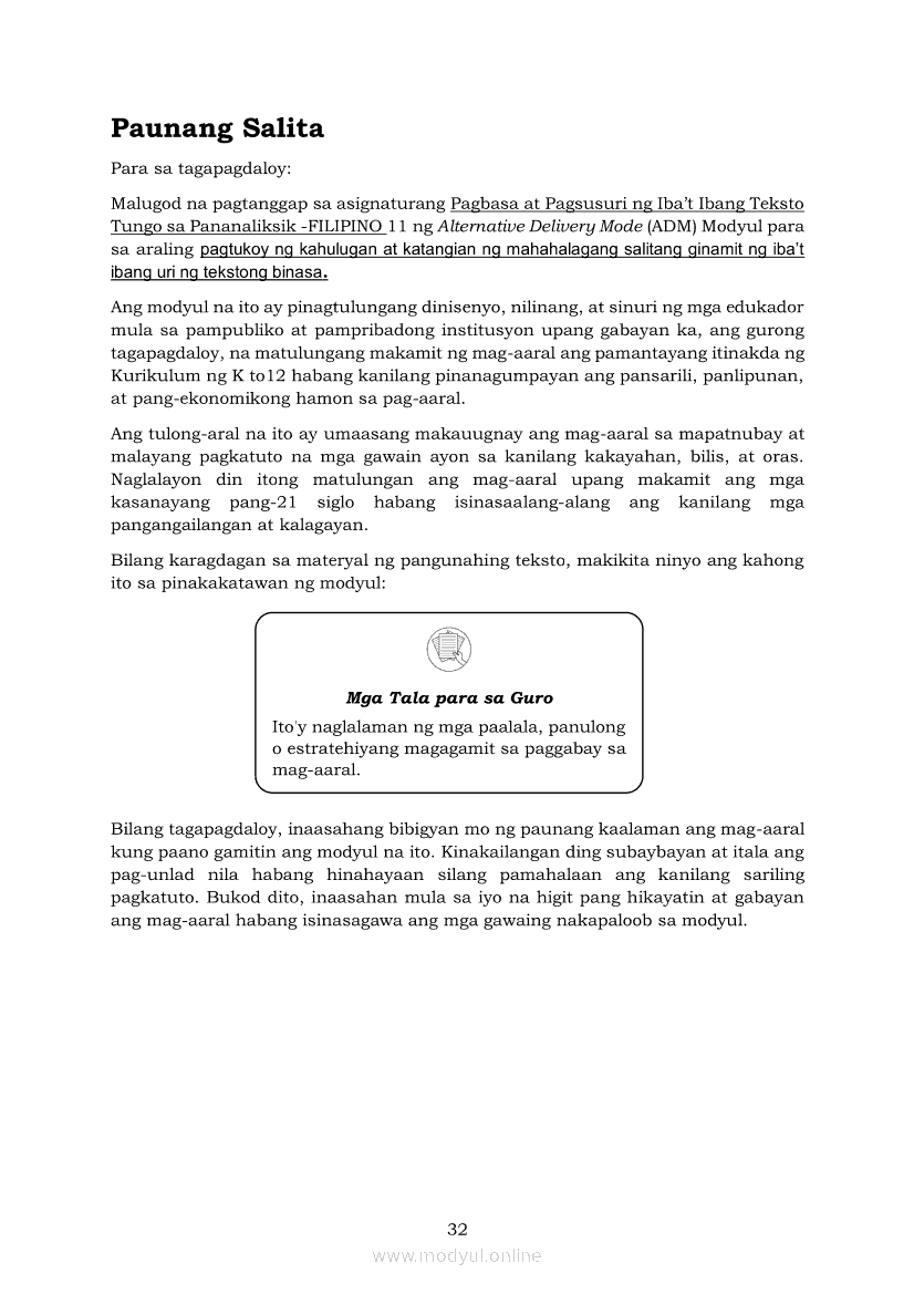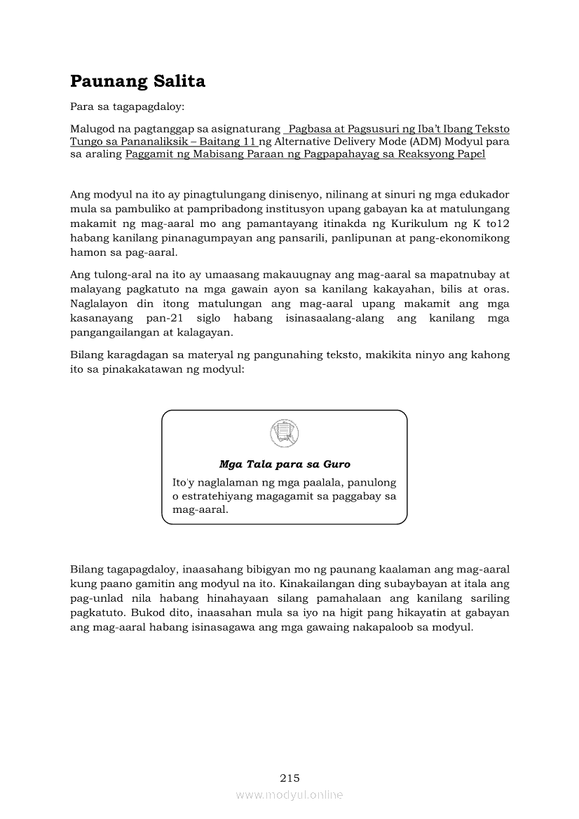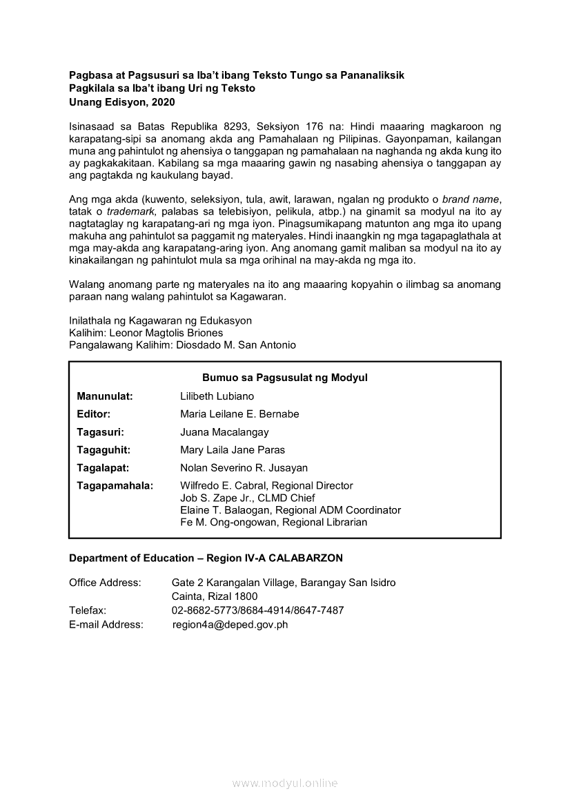 Pagbasa at Pagsusuri ng Iba't Ibang Teksto Tungo sa Pananaliksik (PIVOT)Apr 22, 2021 SHSGrab your copy of Collegio Advance - ULTIMATE Updated College Entrance Exam Reviewer and pass with flying colors 🎉. Pagbasa at Pagsusuri ng Iba't Ibang Teksto Tungo sa PananaliksikRelatedPagbasa at Pagsusuri ng Iba't Ibang Teksto Tungo sa Pananaliksik Ikaapat na Markahan–Modyul 4: Lohikal at Ugnayan ng mga Idea sa Pagsulat ng PananaliksikPagbasa at Pagsusuri ng Iba't Ibang Teksto Tungo sa Pananaliksik Ikaapat na Markahan–Modyul 3: Proseso sa Pagsulat ng PananaliksikPagbasa at Pagsusuri ng Iba't Ibang Teksto Tungo sa Pananaliksik Ikaapat na Markahan—Modyul 1: Pagsusuri ng Ilang Halimbawang Pananaliksik sa Filipino Batay sa Layunin, Gamit, Metodo, at Etika ng PananaliksikPagbasa at Pagsusuri ng Iba't Ibang Teksto Tungo sa Pananaliksik Ikaapat na Markahan–Modyul 2: Pagbibigay-Kahulugan sa mga Konseptong Kaugnay ng PananaliksikPagbasa at Pagsusuri ng Iba't Ibang Teksto Tungo sa Pananaliksik Ikaapat na Markahan–Modyul 5: Pagbuo ng Isang Maikling Pananaliksik sa mga Napapanahong Isyu
