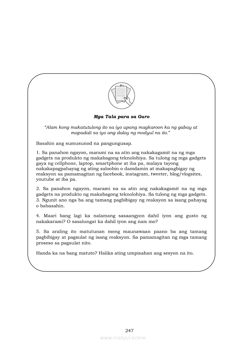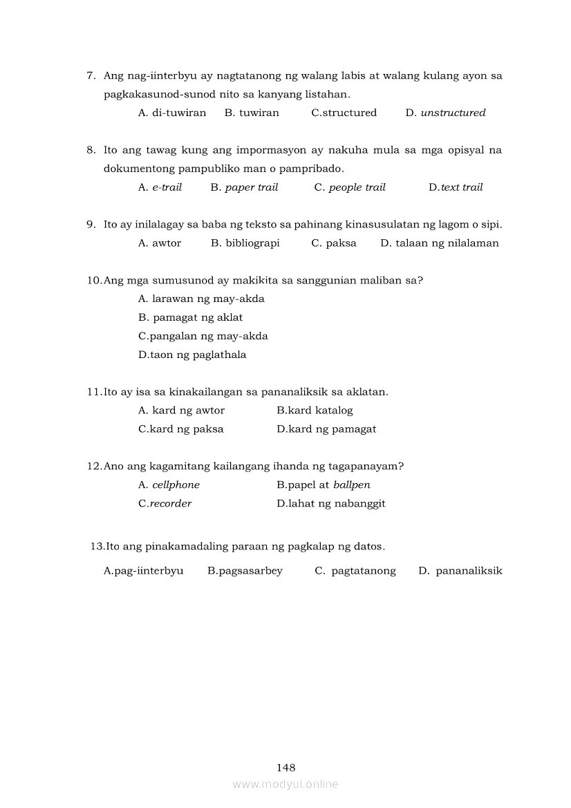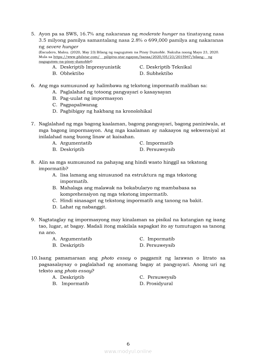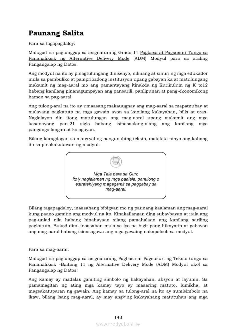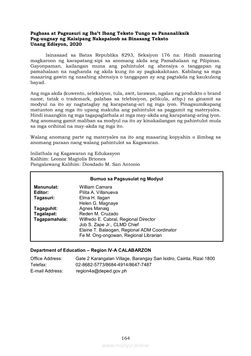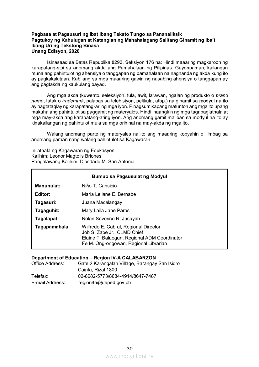 Pagbasa at Pagsusuri ng Iba't Ibang Teksto Tungo sa Pananaliksik (PIVOT)Apr 22, 2021 SHSGrab your copy of Collegio Advance - ULTIMATE Updated College Entrance Exam Reviewer and pass with flying colors 🎉. Pagbasa at Pagsusuri ng Iba't Ibang Teksto Tungo sa PananaliksikRelatedPagbasa at Pagsusuri ng Iba't Ibang Teksto Tungo sa Pananaliksik Ikaapat na Markahan–Modyul 4: Lohikal at Ugnayan ng mga Idea sa Pagsulat ng PananaliksikPagbasa at Pagsusuri ng Iba't Ibang Teksto Tungo sa Pananaliksik Ikaapat na Markahan–Modyul 3: Proseso sa Pagsulat ng PananaliksikPagbasa at Pagsusuri ng Iba't Ibang Teksto Tungo sa Pananaliksik Ikaapat na Markahan—Modyul 1: Pagsusuri ng Ilang Halimbawang Pananaliksik sa Filipino Batay sa Layunin, Gamit, Metodo, at Etika ng PananaliksikPagbasa at Pagsusuri ng Iba't Ibang Teksto Tungo sa Pananaliksik Ikaapat na Markahan–Modyul 2: Pagbibigay-Kahulugan sa mga Konseptong Kaugnay ng PananaliksikPagbasa at Pagsusuri ng Iba't Ibang Teksto Tungo sa Pananaliksik Ikaapat na Markahan–Modyul 5: Pagbuo ng Isang Maikling Pananaliksik sa mga Napapanahong Isyu