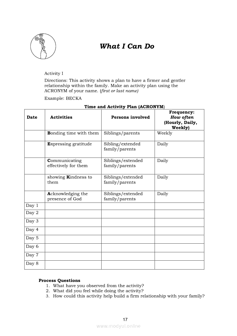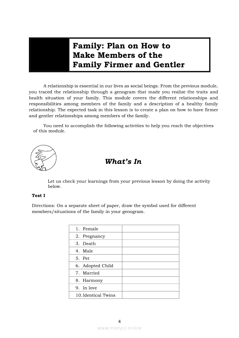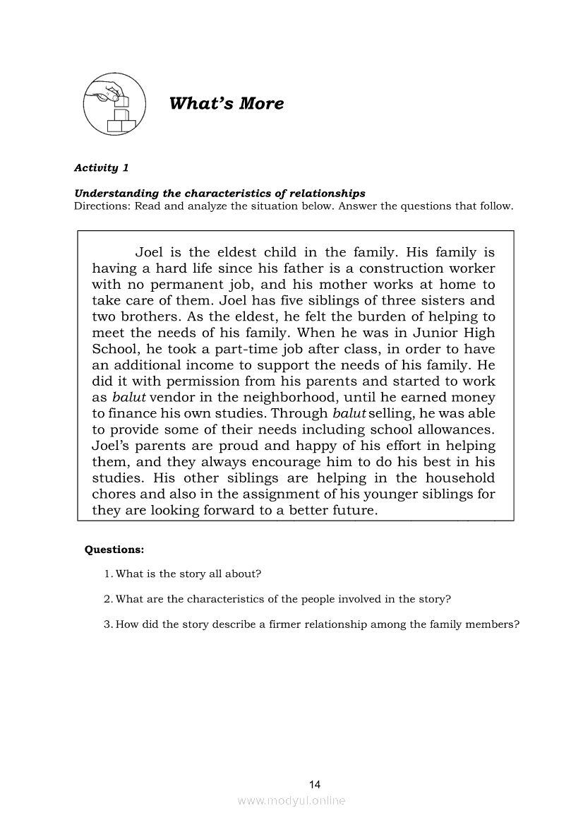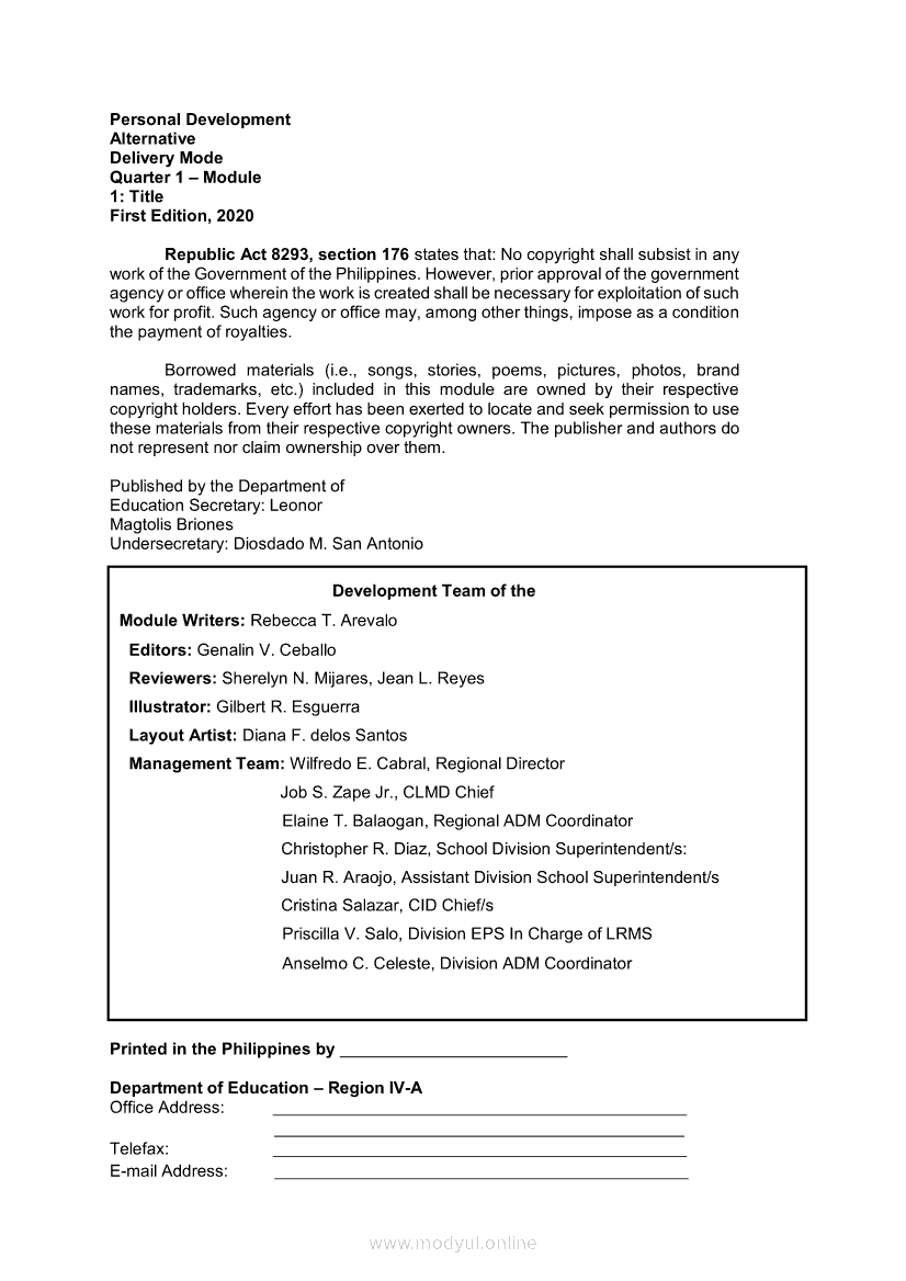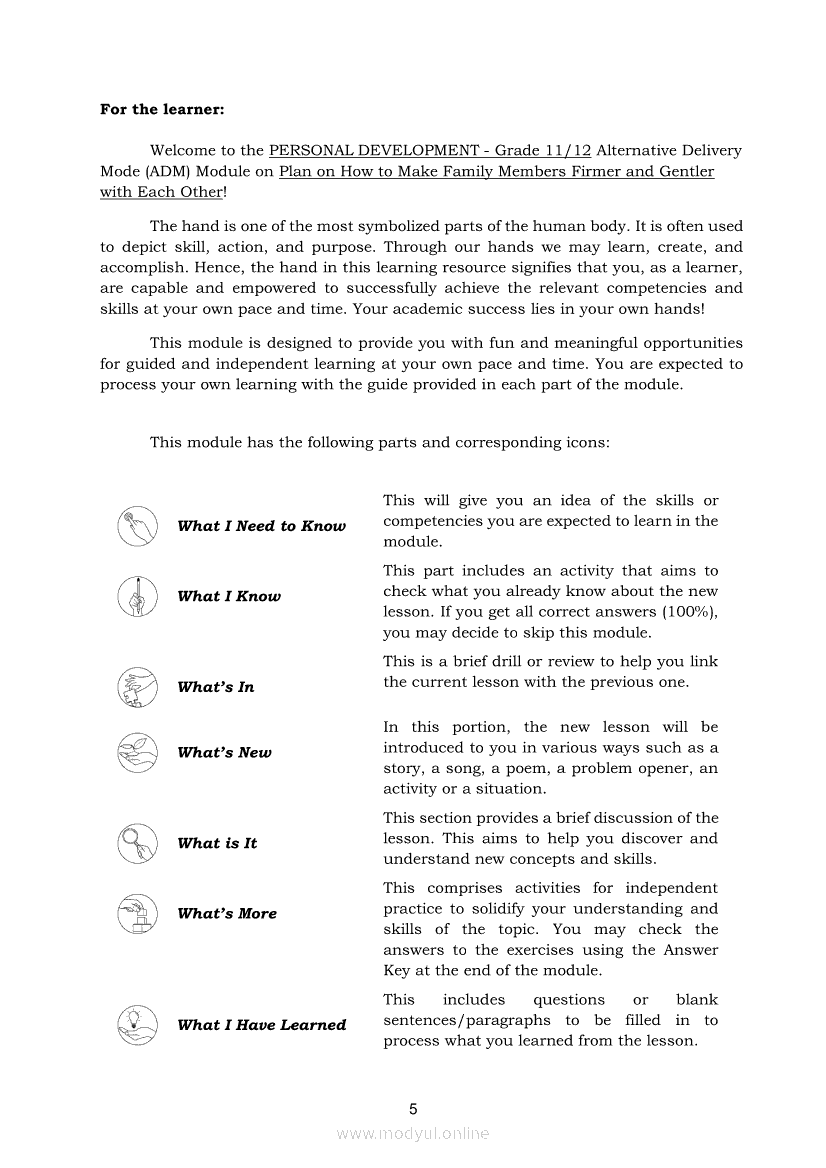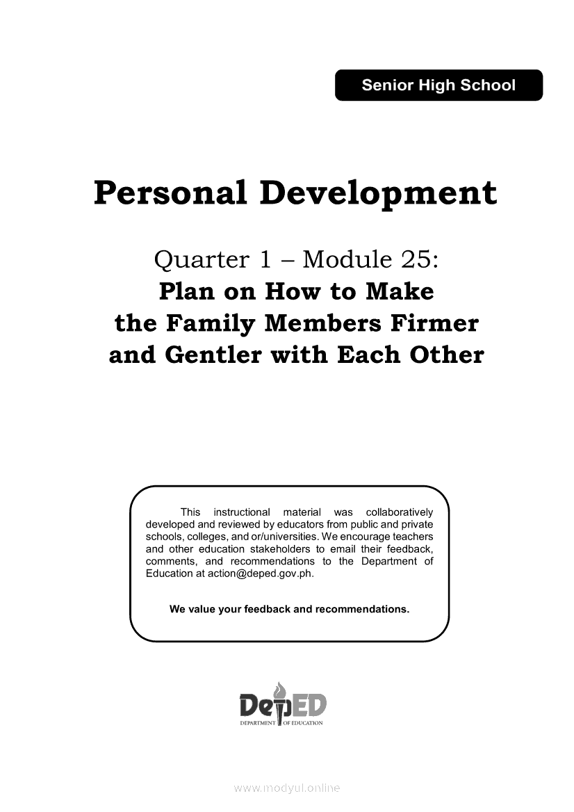 Personal Development Module 25: Plan on How to Make the Family Members Firmer and Gentler with Each OtherApr 22, 2021 SHSGrab your copy of Collegio Advance - ULTIMATE Updated College Entrance Exam Reviewer and pass with flying colors π. Personal DevelopmentRelatedPersonal Development Quarter 2 β Module 29: Factors in Personal Development: Guide in Making Important Career DecisionsPersonal Development Quarter 2 β Module 21: Social InfluencePersonal Development Quarter 2 β Module 28: Identifying Career Option Leading to Attaining Oneβs Personal GoalPersonal Development Quarter 2 β Module 17: Teen-age Relationships Including the Acceptable and Unacceptable Expressions of AttractionsPersonal Development Quarter 2 β Module 24: Make a Genogram and Trace Certain Physical, Personality, or Behavioral Attributes through Generations