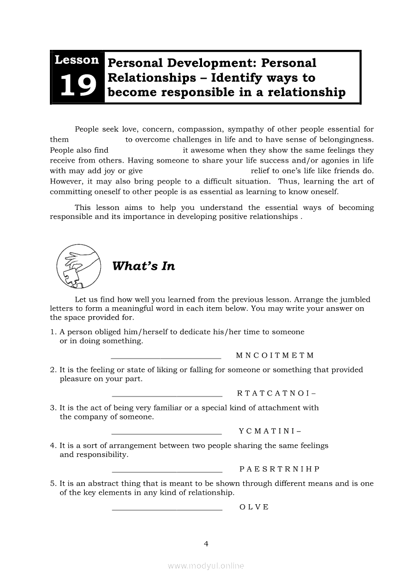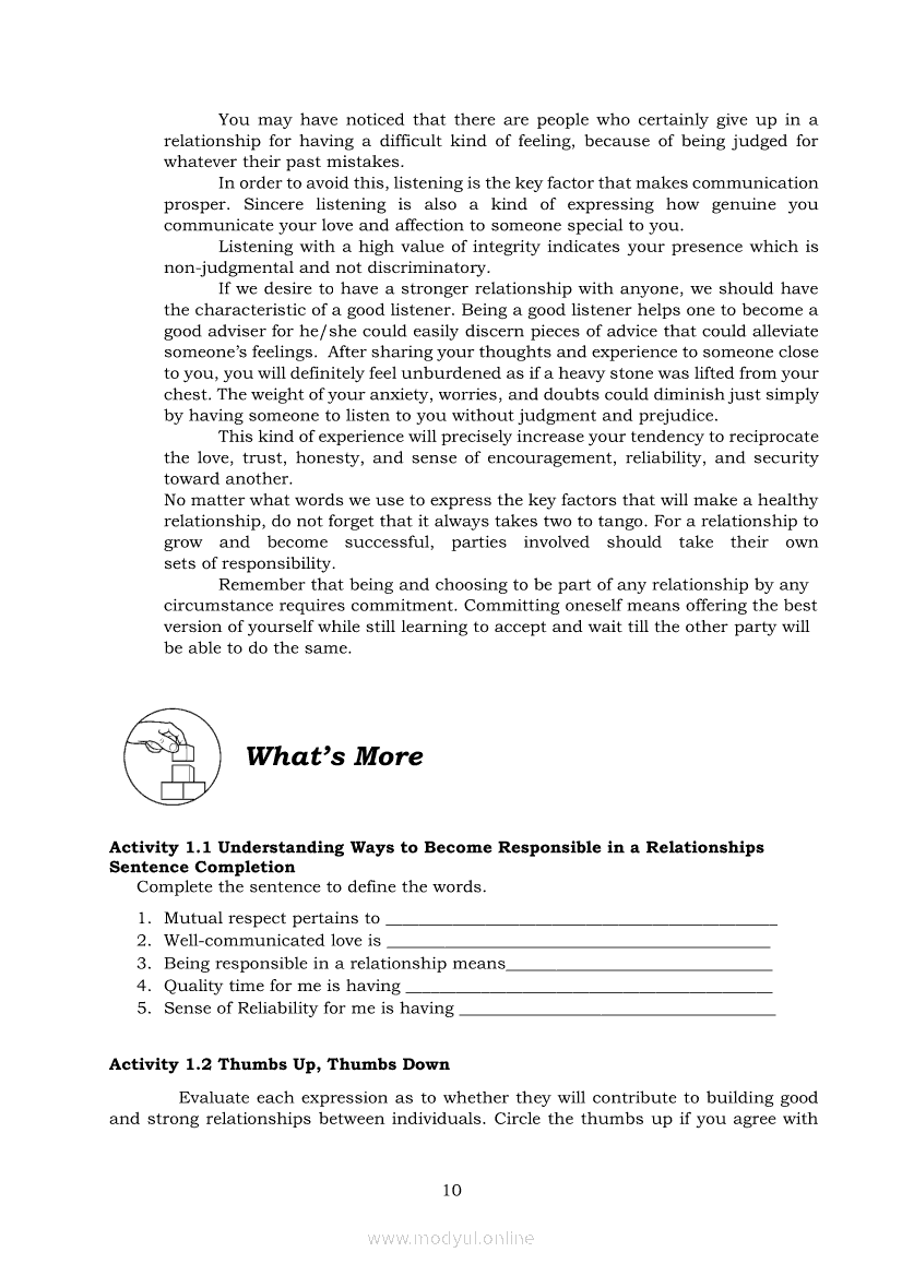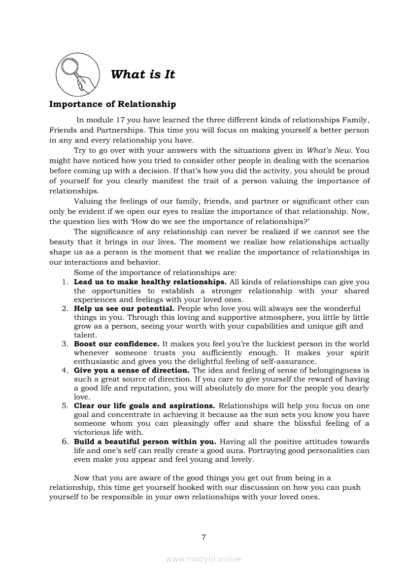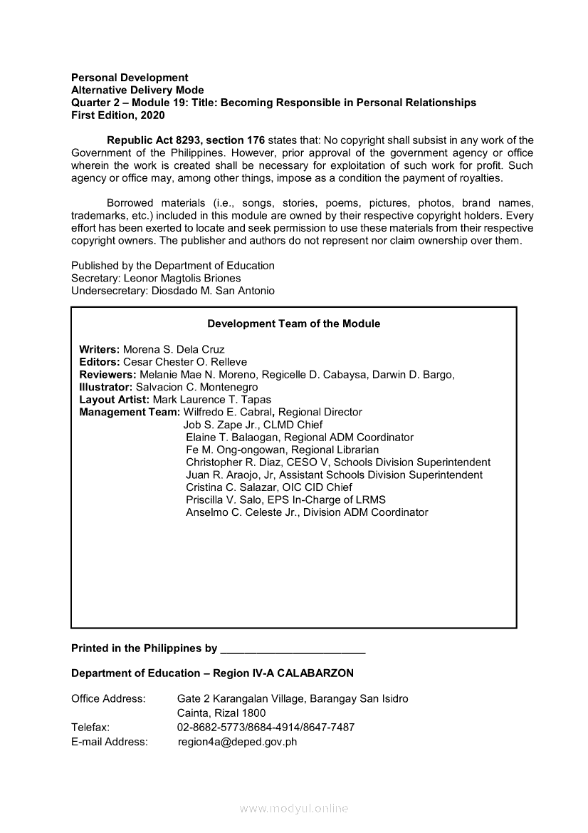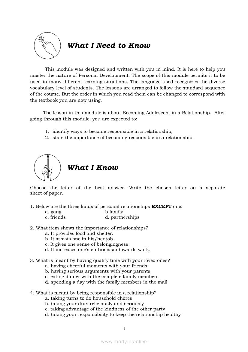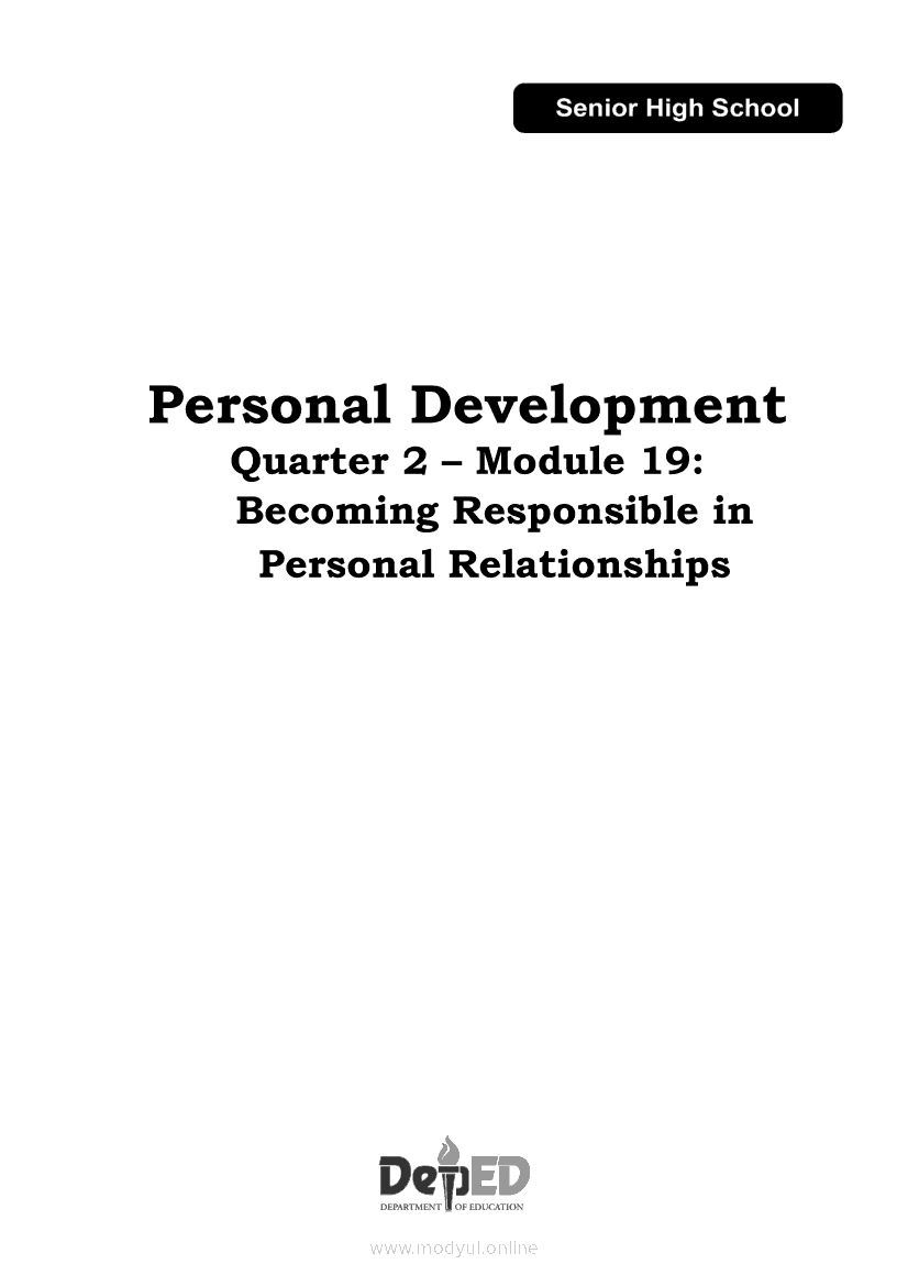 Personal Development Quarter 2 – Module 19: Becoming Responsible in Personal RelationshipsApr 22, 2021 SHSGrab your copy of Collegio Advance - ULTIMATE Updated College Entrance Exam Reviewer and pass with flying colors 🎉. Personal DevelopmentRelatedPersonal Development Quarter 2 – Module 29: Factors in Personal Development: Guide in Making Important Career DecisionsPersonal Development Quarter 2 – Module 27: Career Options Based on Career Development Concepts and Personal Life GoalsPersonal Development Quarter 2 – Module 30: Importance of Personal Development in Making a Career DecisionPersonal Development Quarter 2 – Module 23: Family Structures and LegaciesPersonal Development Quarter 2 – Module 22: Conduct a Mini-survey on Filipino Relationships (family, school, and community)