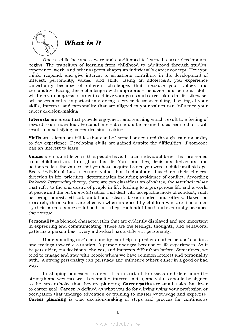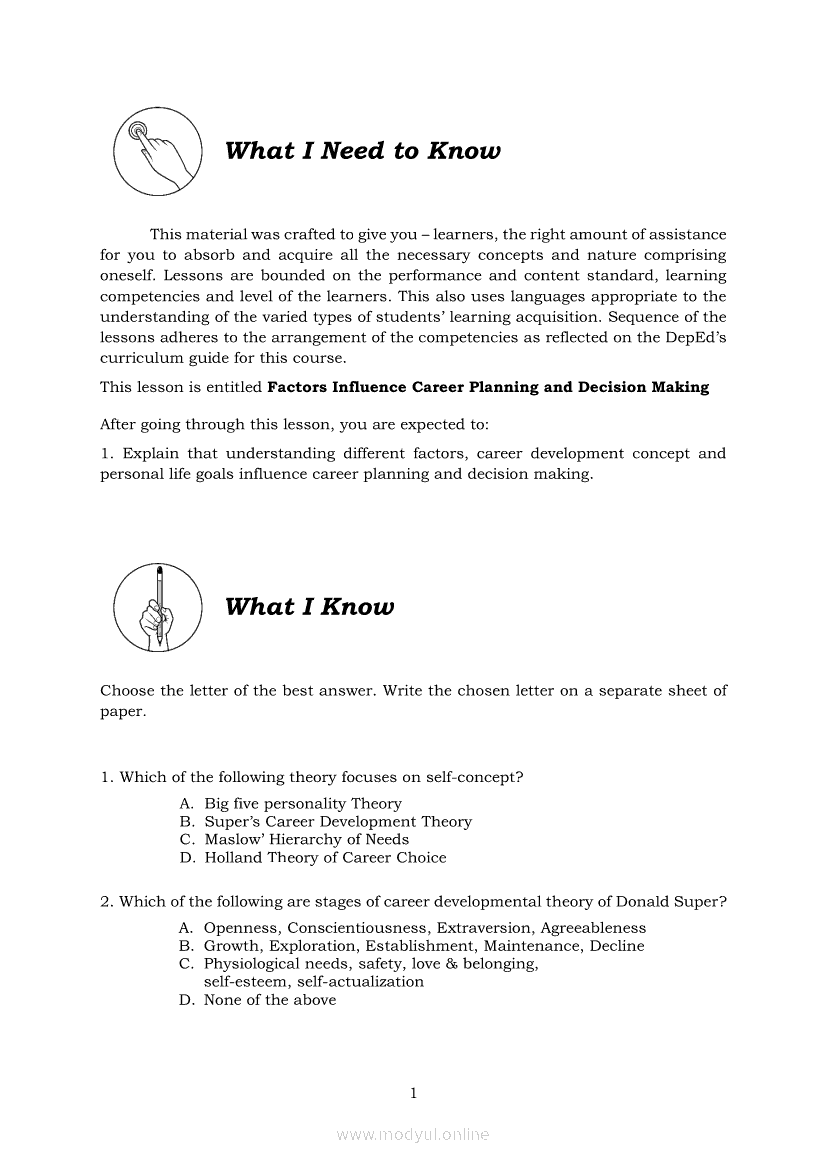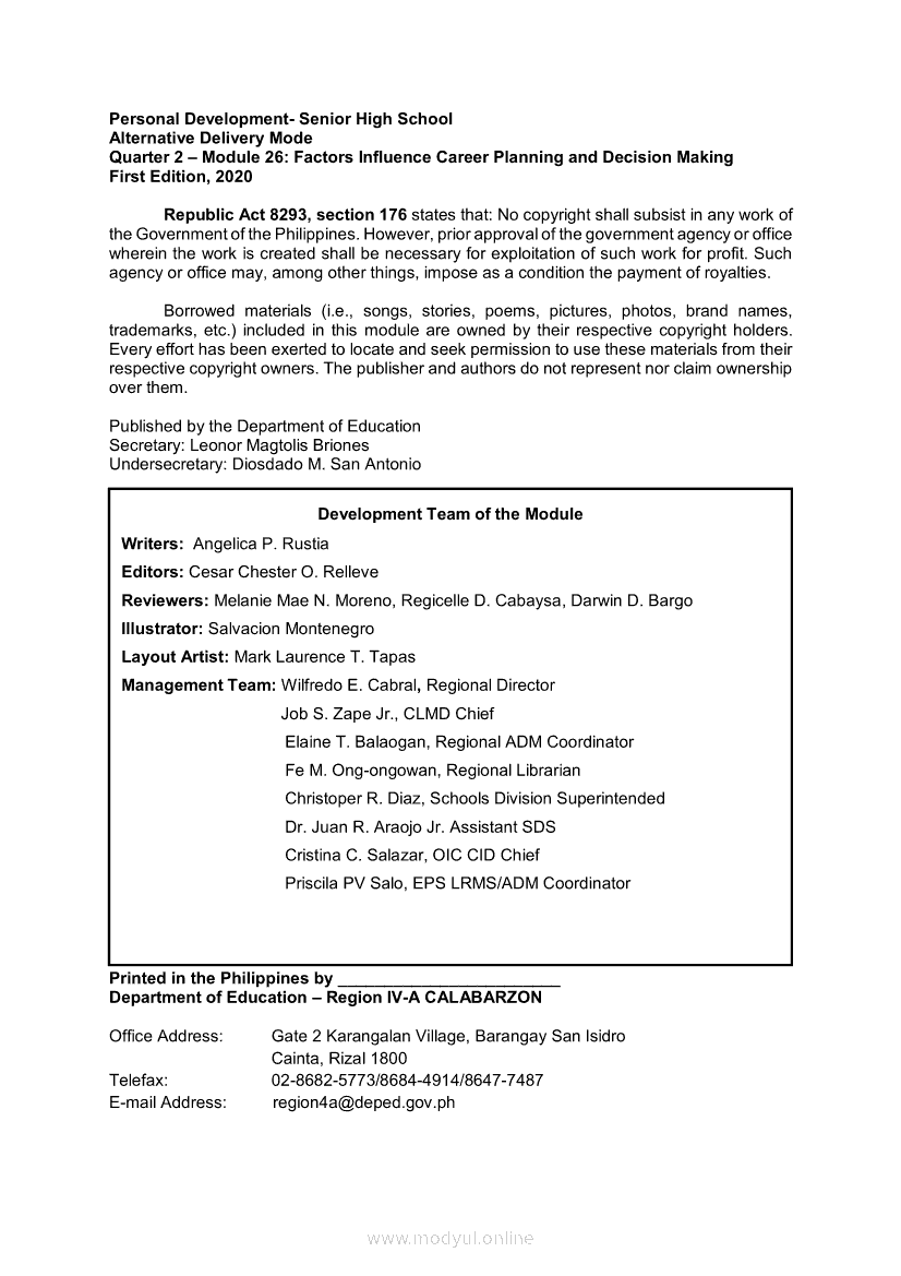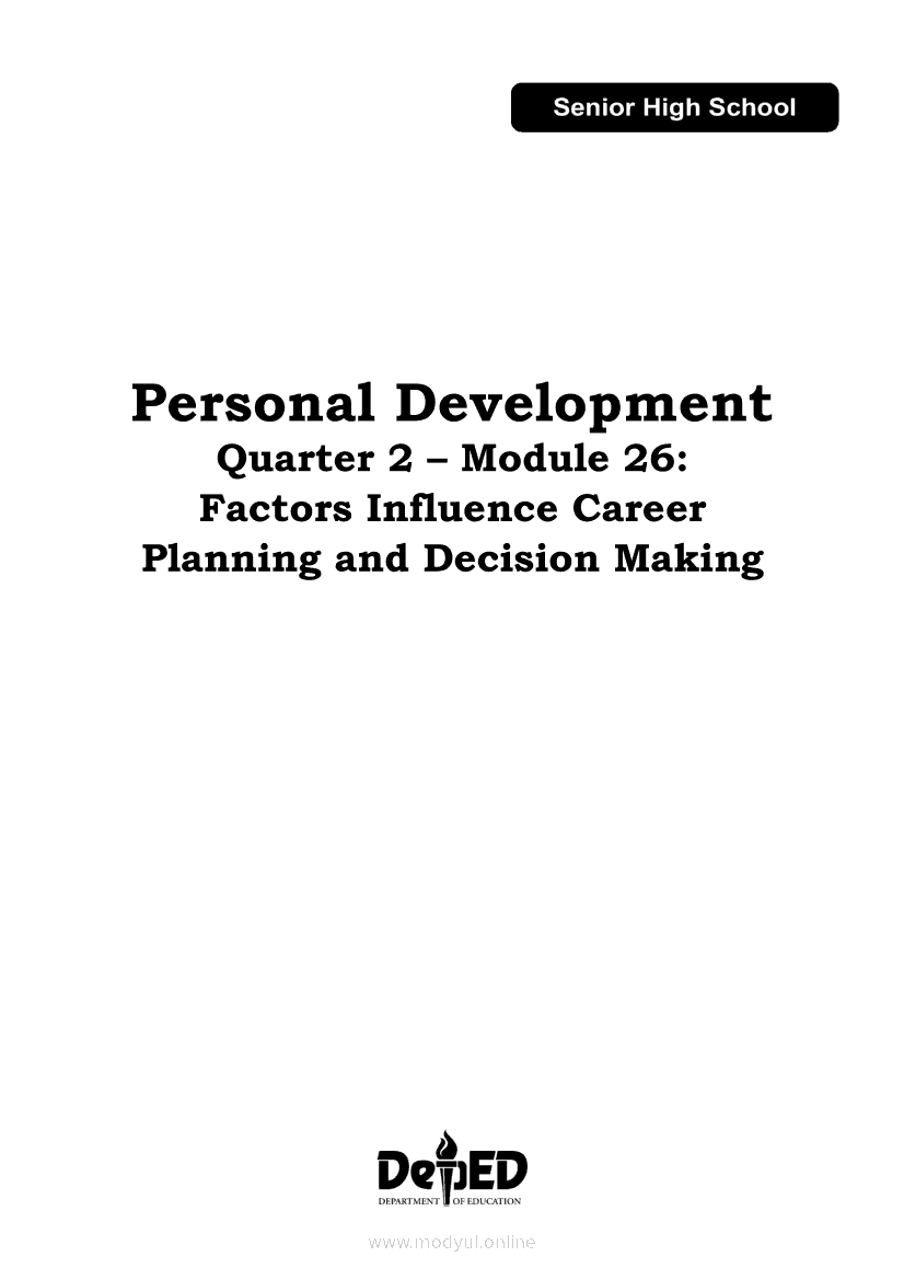 Personal Development Quarter 2 β Module 26: Factors Influence Career Planning and Decision MakingApr 22, 2021 SHSGrab your copy of Collegio Advance - ULTIMATE Updated College Entrance Exam Reviewer and pass with flying colors π. Personal DevelopmentRelatedPersonal Development Quarter 2 β Module 30: Importance of Personal Development in Making a Career DecisionPersonal Development Quarter 2 β Module:20 Various Roles of Different Individuals in Society and How They Can Influence People Through their Leadership or FollowershipPersonal Development Quarter 2 β Module 28: Identifying Career Option Leading to Attaining Oneβs Personal GoalPersonal Development Quarter 2 β Module 21: Social InfluencePersonal Development (PIVOT)