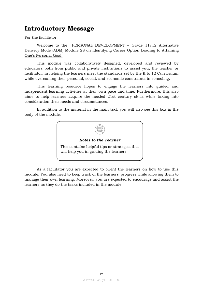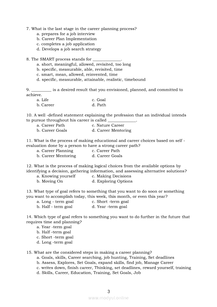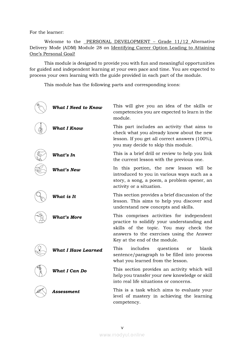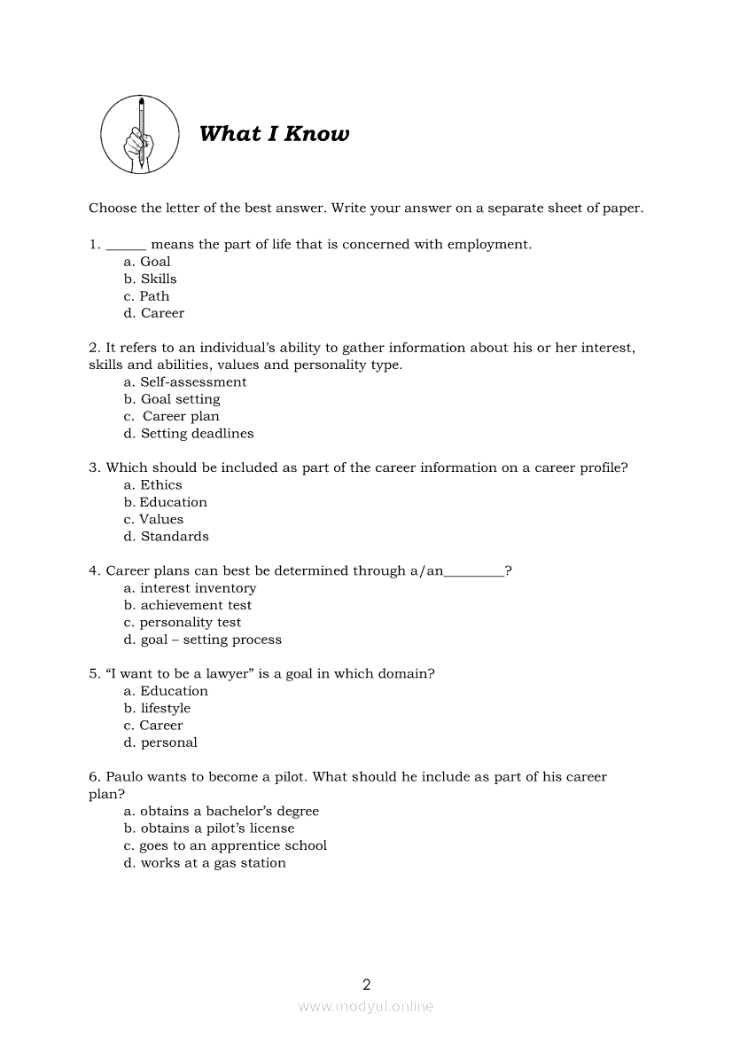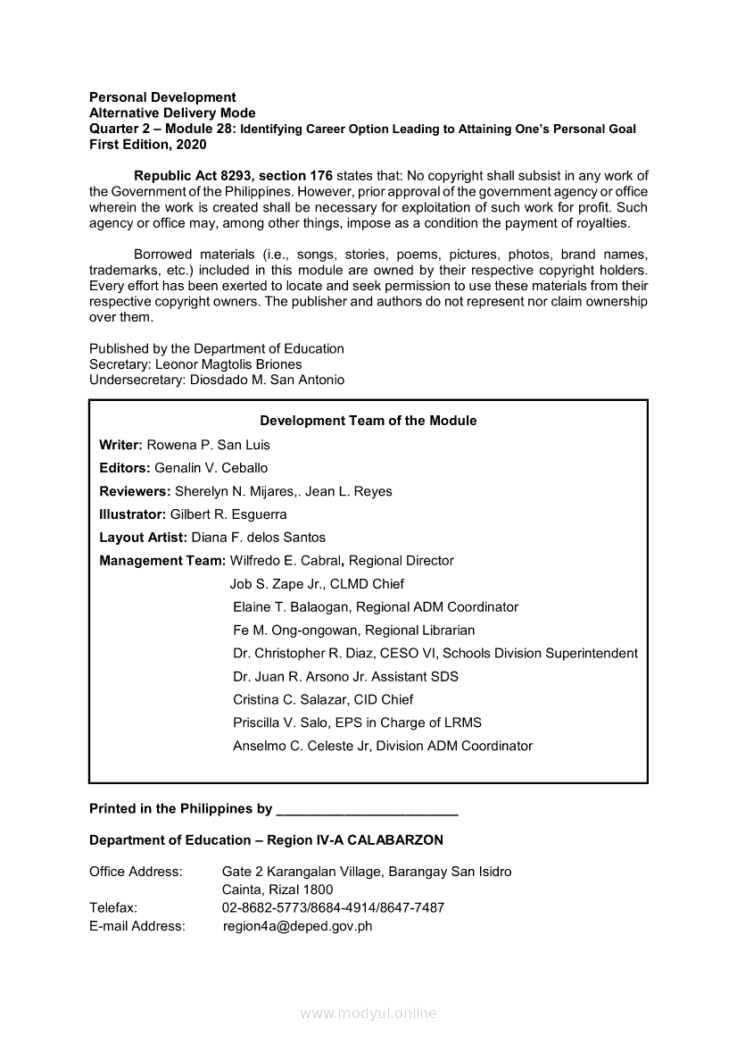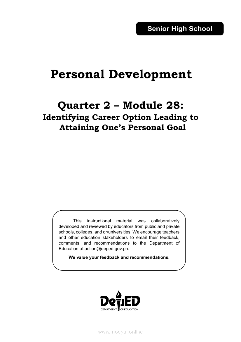 Personal Development Quarter 2 – Module 28: Identifying Career Option Leading to Attaining One’s Personal GoalApr 22, 2021 SHSGrab your copy of Collegio Advance - ULTIMATE Updated College Entrance Exam Reviewer and pass with flying colors 🎉. Personal DevelopmentRelatedPersonal Development Quarter 2 – Module 30: Importance of Personal Development in Making a Career DecisionPersonal Development Quarter 2 – Module 27: Career Options Based on Career Development Concepts and Personal Life GoalsPersonal Development Quarter 2 – Module 29: Factors in Personal Development: Guide in Making Important Career DecisionsPersonal Development Quarter 2 – Module 26: Factors Influence Career Planning and Decision MakingPersonal Development (PIVOT)