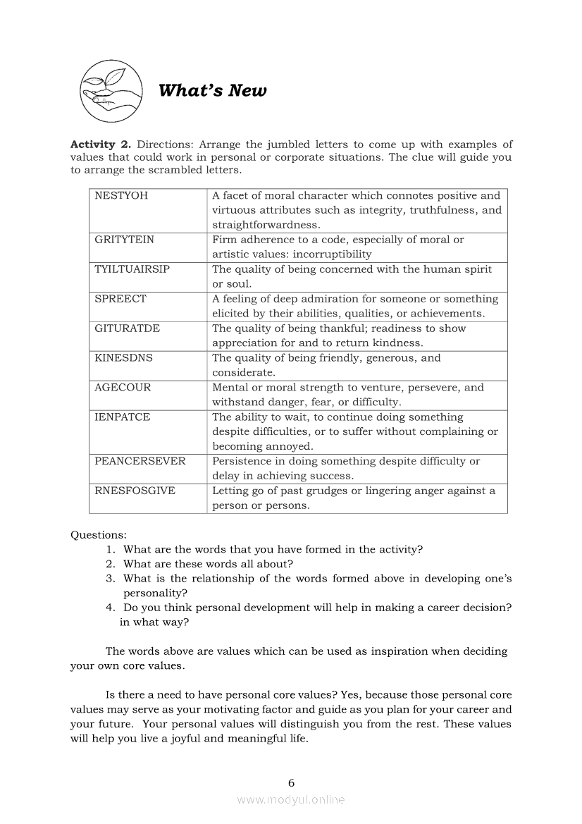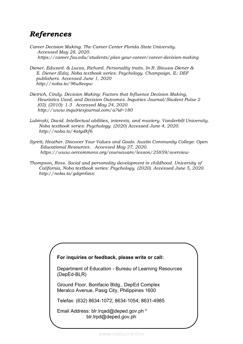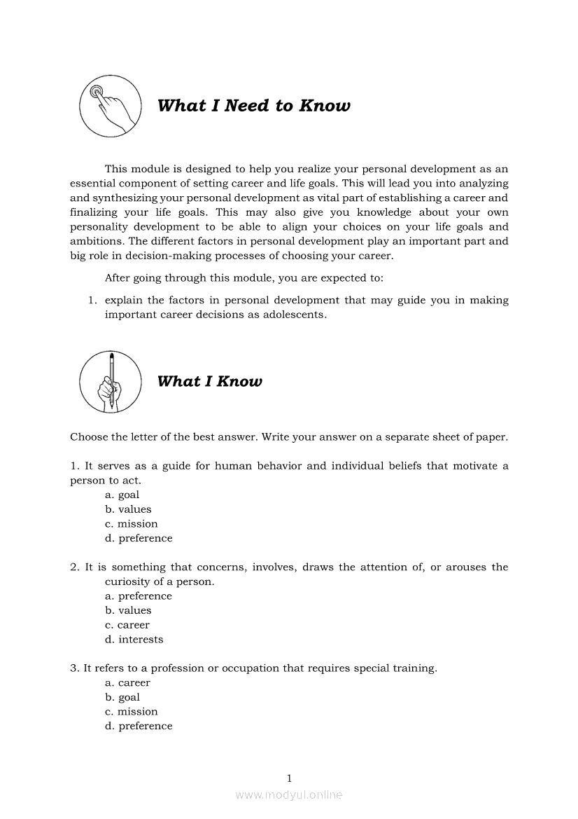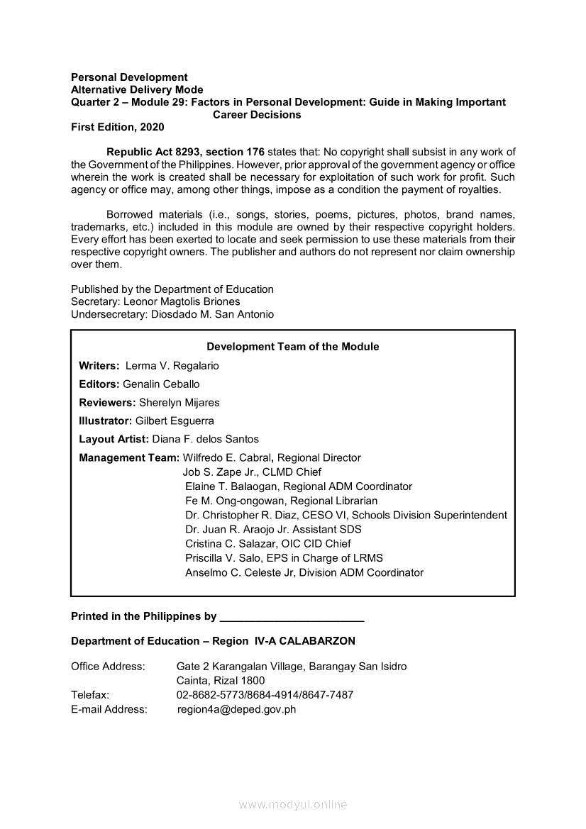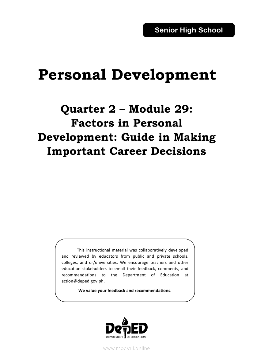 Personal Development Quarter 2 – Module 29: Factors in Personal Development: Guide in Making Important Career DecisionsApr 22, 2021 SHSGrab your copy of Collegio Advance - ULTIMATE Updated College Entrance Exam Reviewer and pass with flying colors 🎉. Personal DevelopmentRelatedPersonal Development (PIVOT)Personal Development Quarter 2 – Module 17: Teen-age Relationships Including the Acceptable and Unacceptable Expressions of AttractionsPersonal Development Quarter 2 – Module 24: Make a Genogram and Trace Certain Physical, Personality, or Behavioral Attributes through GenerationsPersonal Development Quarter 2 – Module 22: Conduct a Mini-survey on Filipino Relationships (family, school, and community)Personal Development Quarter 2 – Module 18: Personal Relationship – Attraction, Love, and Commitment