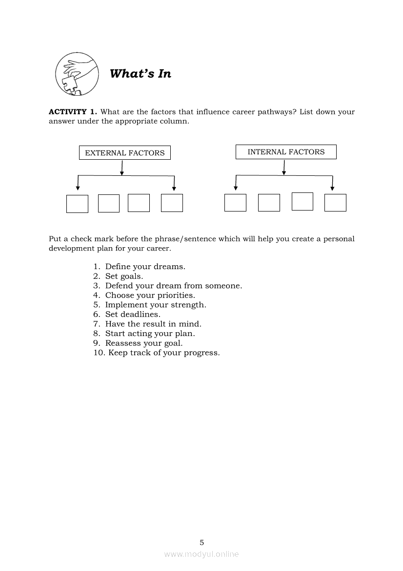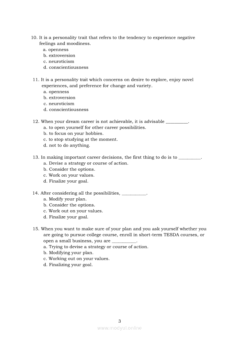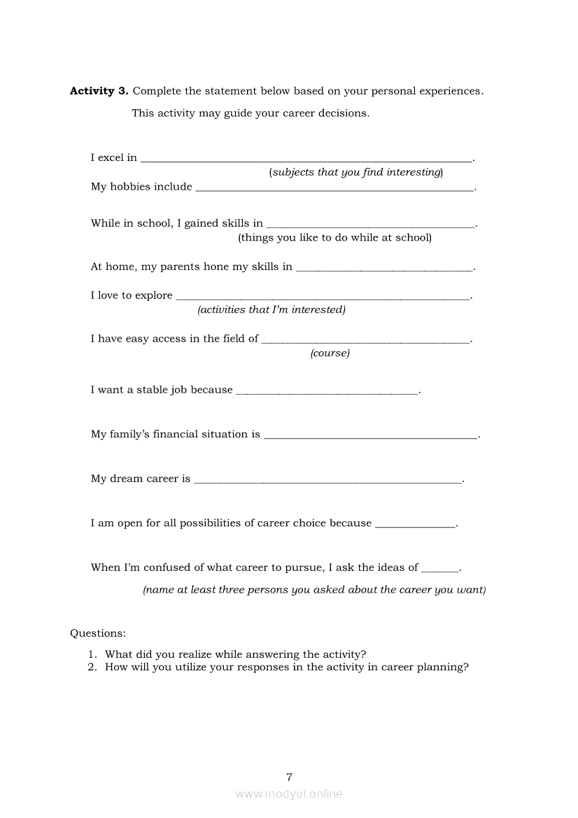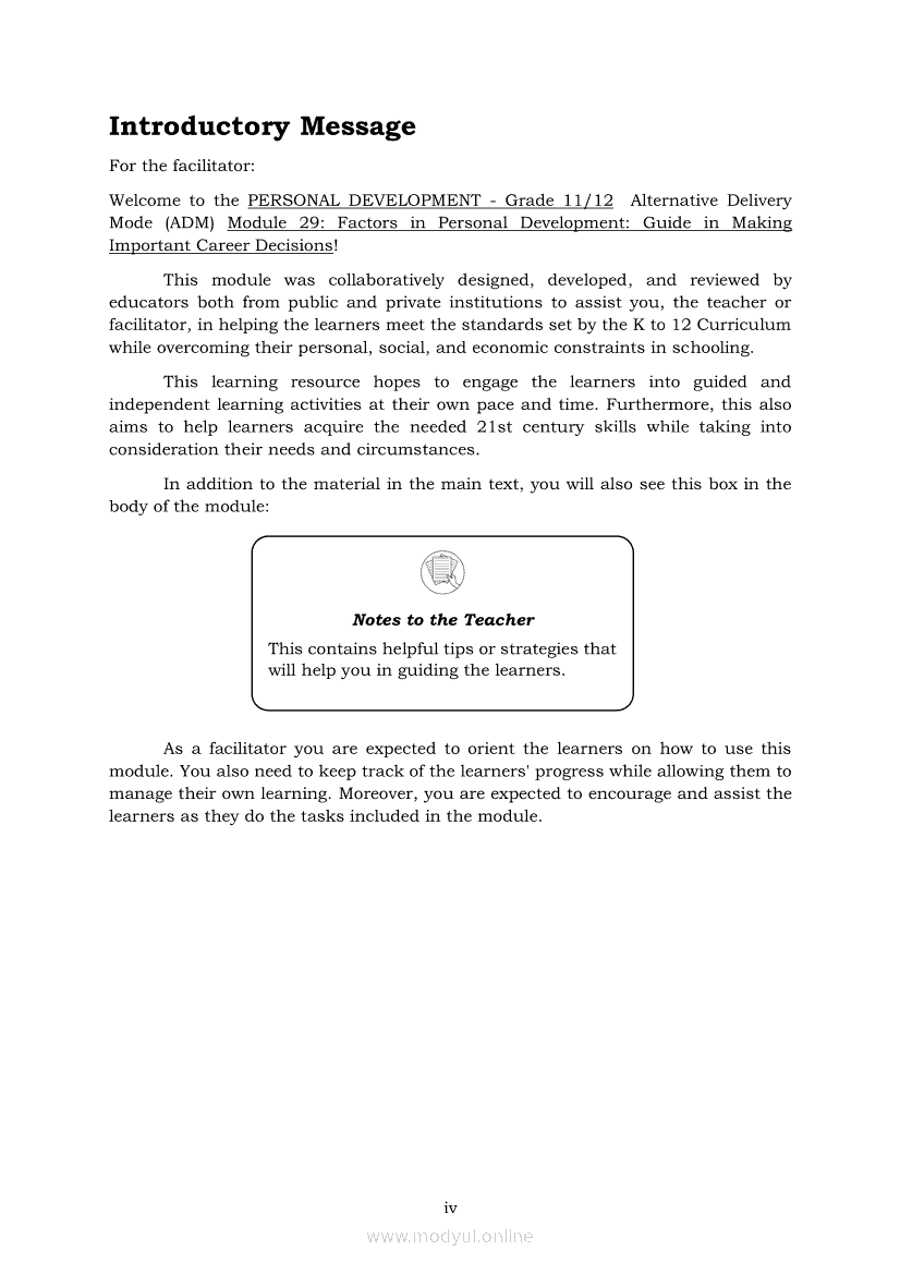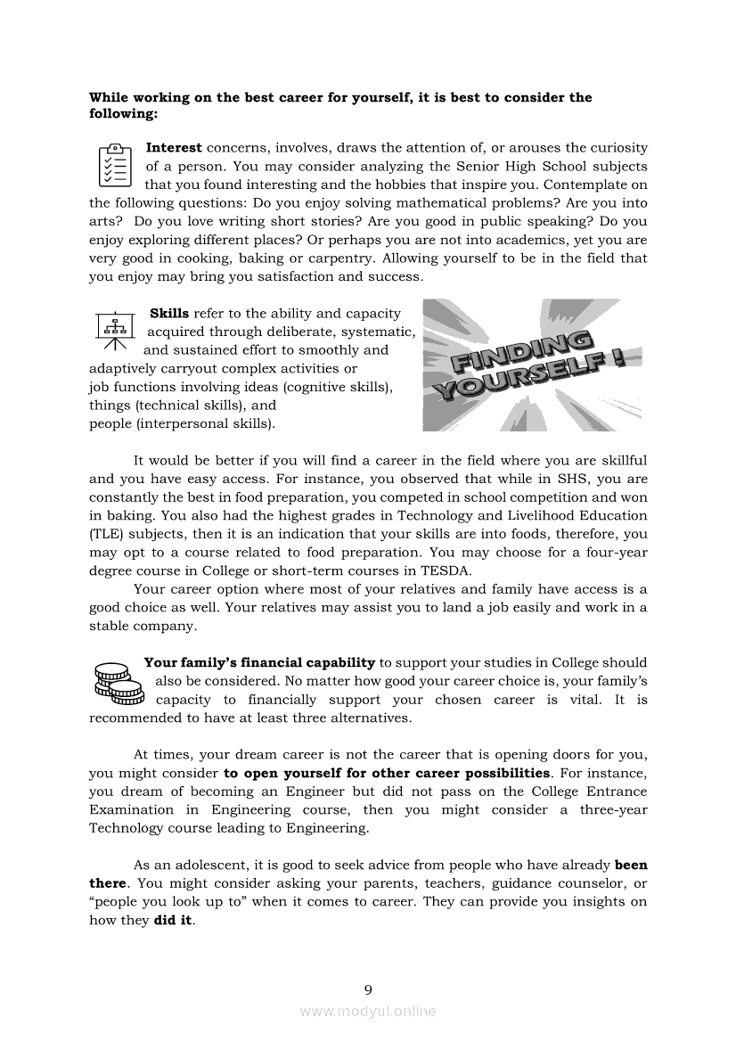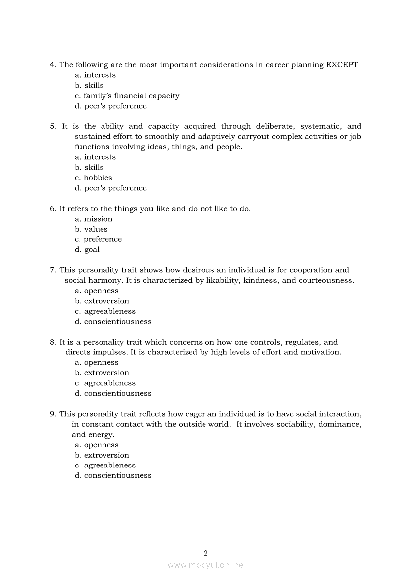 Personal Development Quarter 2 – Module 29: Factors in Personal Development: Guide in Making Important Career DecisionsApr 22, 2021 SHSGrab your copy of Collegio Advance - ULTIMATE Updated College Entrance Exam Reviewer and pass with flying colors 🎉. Personal DevelopmentRelatedPersonal Development (PIVOT)Personal Development Quarter 2 – Module 17: Teen-age Relationships Including the Acceptable and Unacceptable Expressions of AttractionsPersonal Development Quarter 2 – Module 24: Make a Genogram and Trace Certain Physical, Personality, or Behavioral Attributes through GenerationsPersonal Development Quarter 2 – Module 22: Conduct a Mini-survey on Filipino Relationships (family, school, and community)Personal Development Quarter 2 – Module 18: Personal Relationship – Attraction, Love, and Commitment