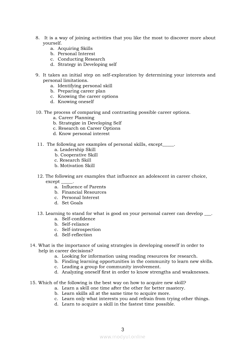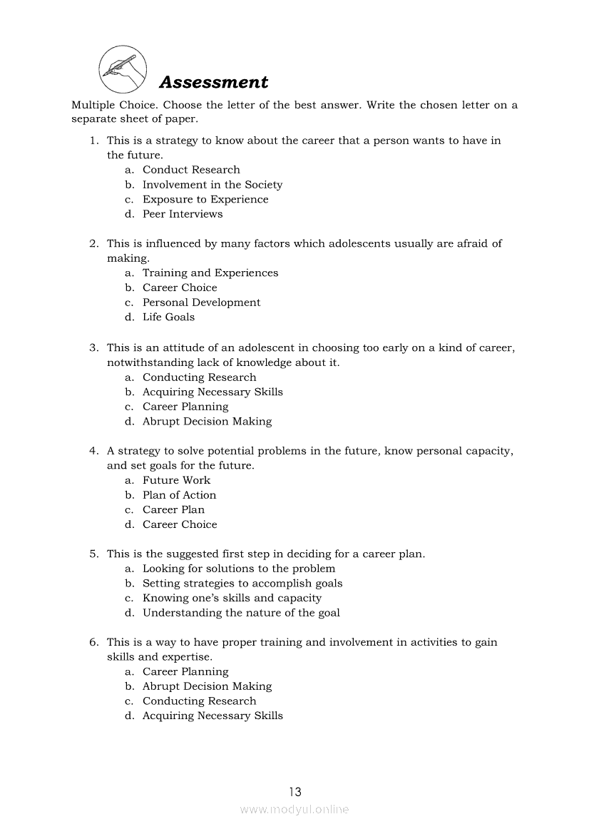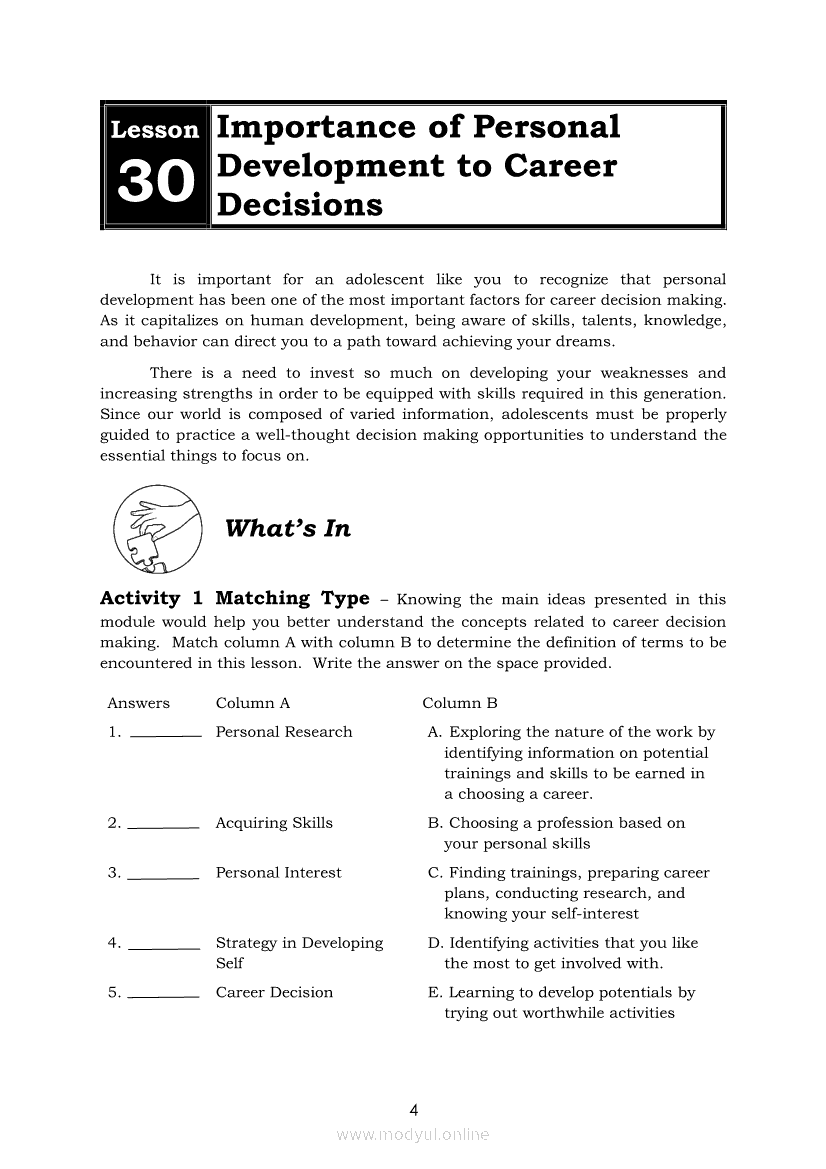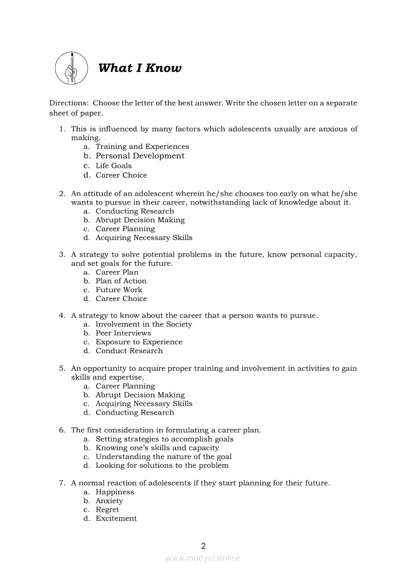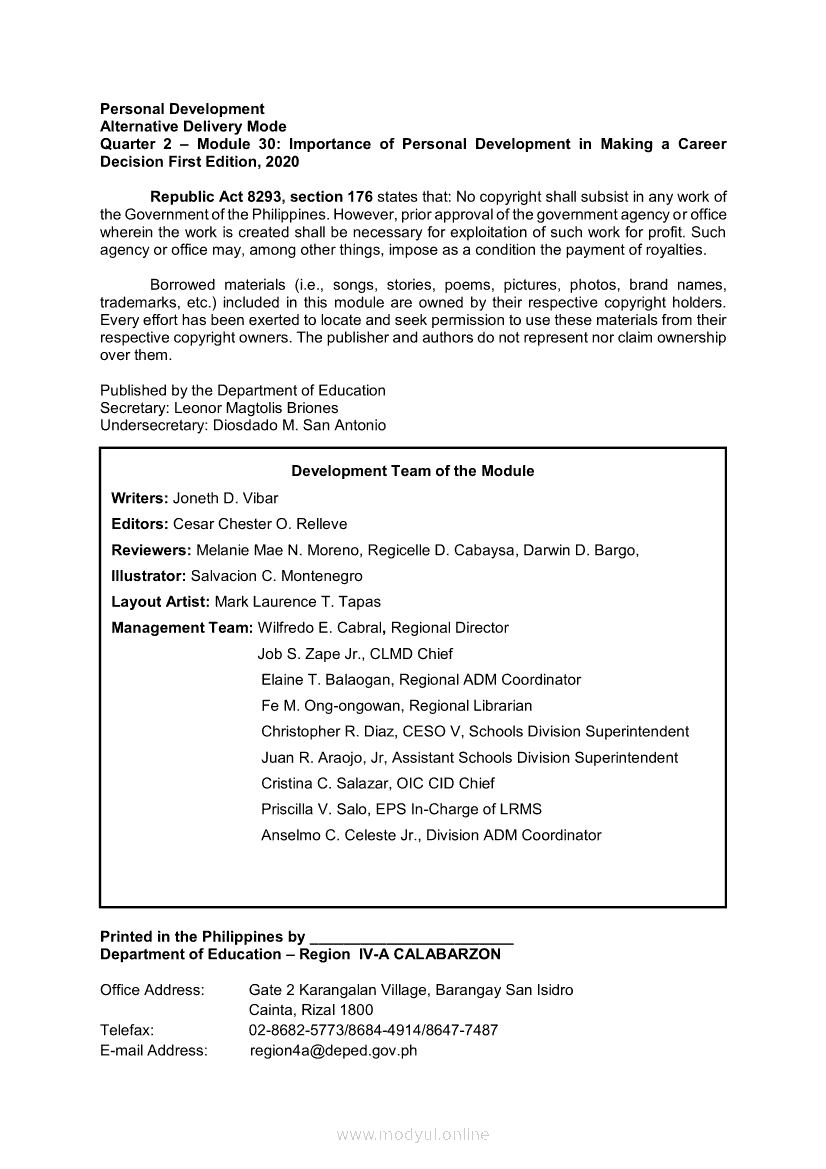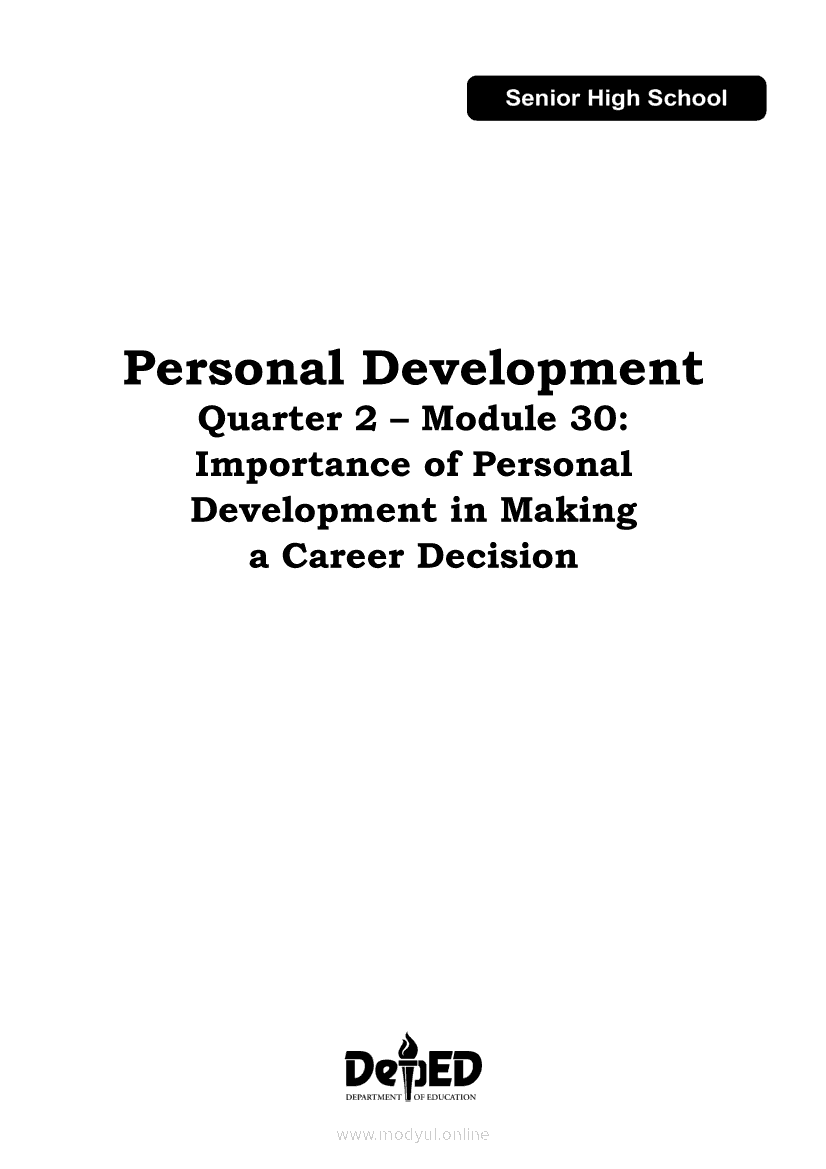 Personal Development Quarter 2 β Module 30: Importance of Personal Development in Making a Career DecisionApr 22, 2021 SHSGrab your copy of Collegio Advance - ULTIMATE Updated College Entrance Exam Reviewer and pass with flying colors π. Personal DevelopmentRelatedPersonal Development Quarter 2 β Module 21: Social InfluencePersonal Development (PIVOT)Personal Development Module 25: Plan on How to Make the Family Members Firmer and Gentler with Each OtherPersonal Development Quarter 2 β Module 28: Identifying Career Option Leading to Attaining Oneβs Personal GoalPersonal Development Quarter 2 β Module 29: Factors in Personal Development: Guide in Making Important Career Decisions