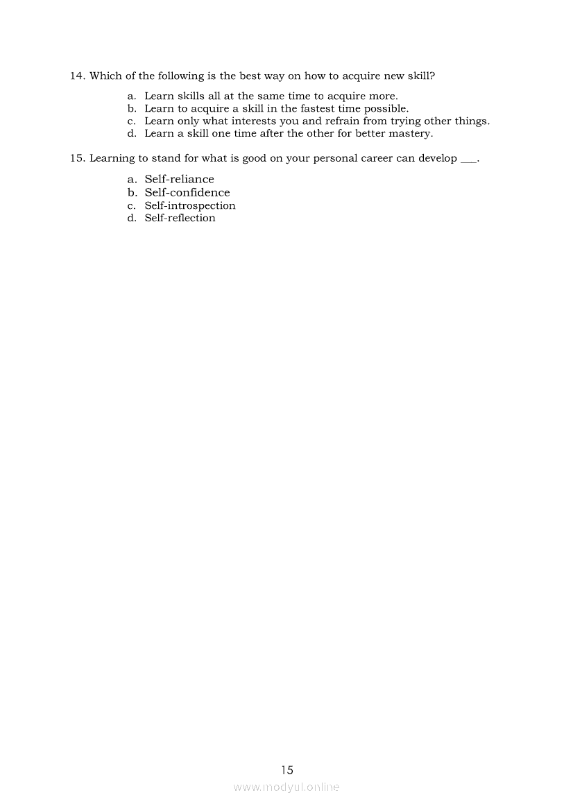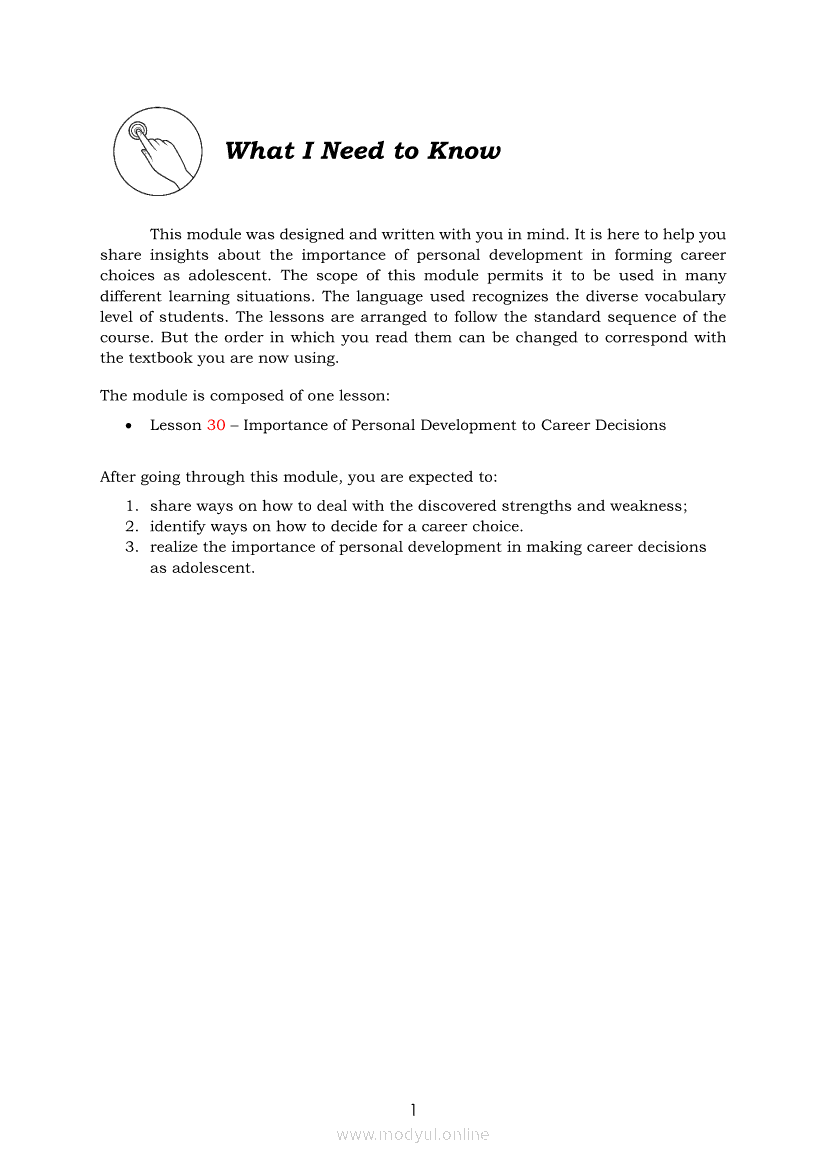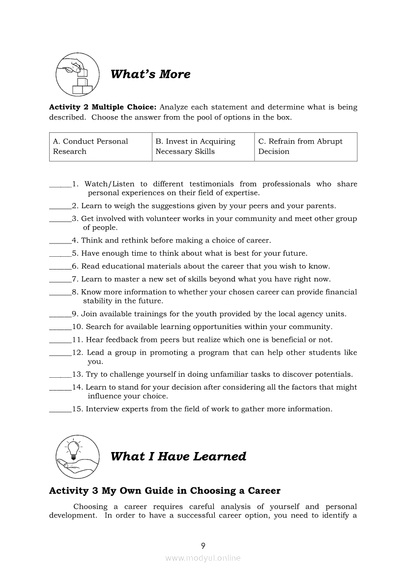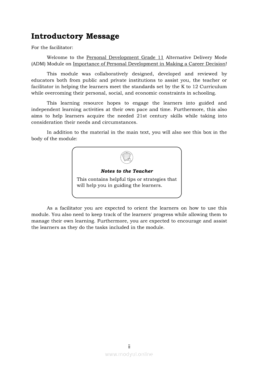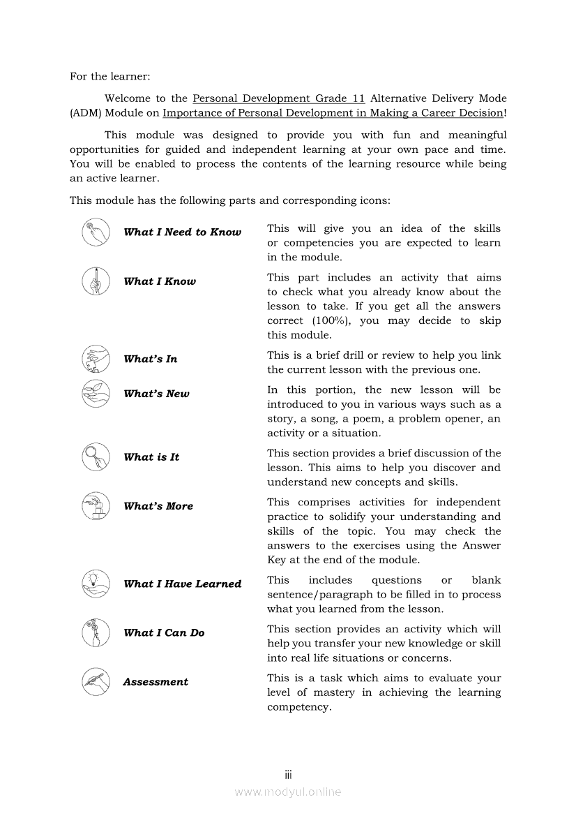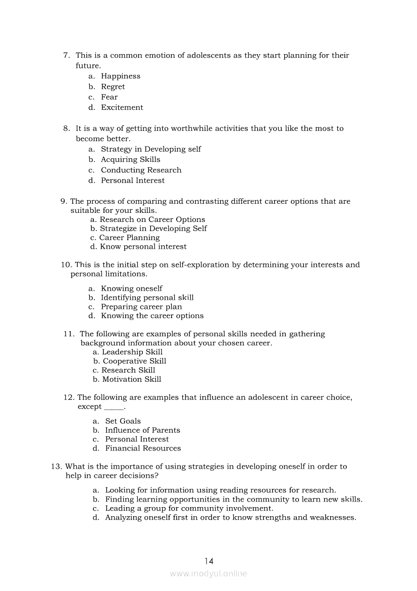 Personal Development Quarter 2 β Module 30: Importance of Personal Development in Making a Career DecisionApr 22, 2021 SHSGrab your copy of Collegio Advance - ULTIMATE Updated College Entrance Exam Reviewer and pass with flying colors π. Personal DevelopmentRelatedPersonal Development Quarter 2 β Module 21: Social InfluencePersonal Development (PIVOT)Personal Development Module 25: Plan on How to Make the Family Members Firmer and Gentler with Each OtherPersonal Development Quarter 2 β Module 28: Identifying Career Option Leading to Attaining Oneβs Personal GoalPersonal Development Quarter 2 β Module 29: Factors in Personal Development: Guide in Making Important Career Decisions