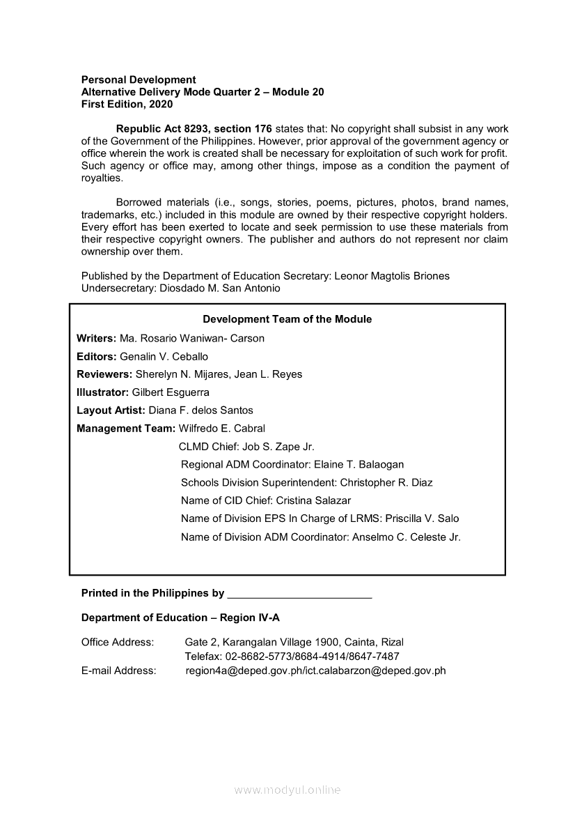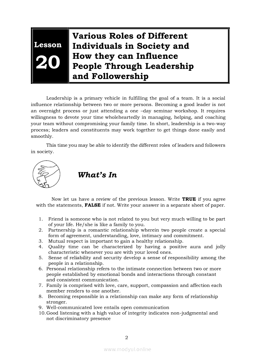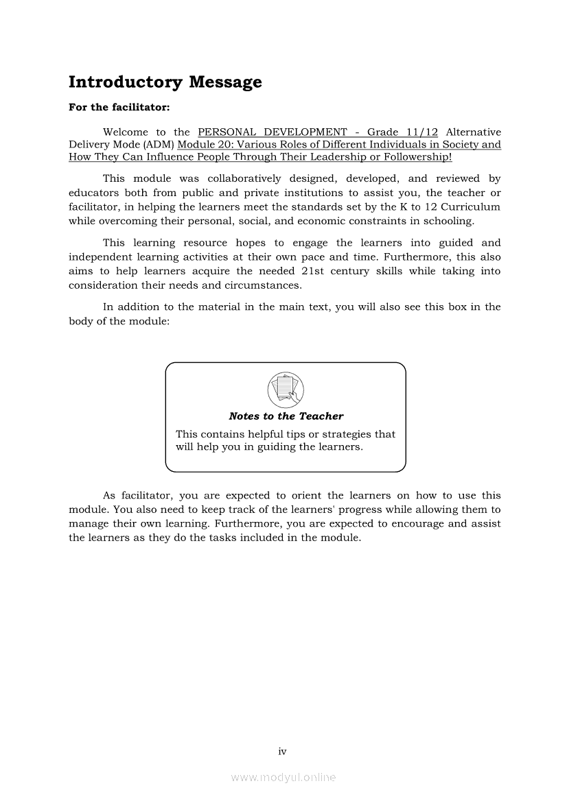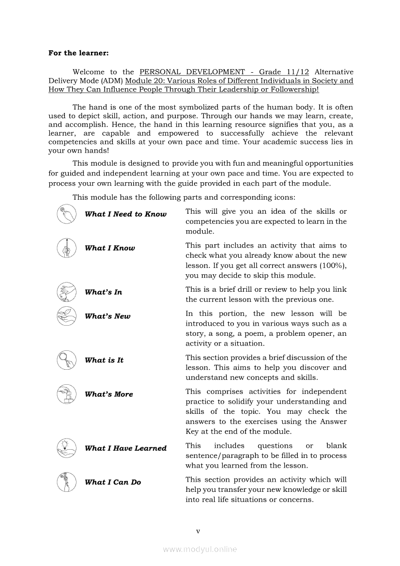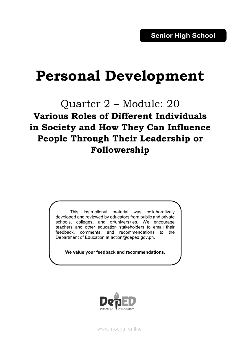 Personal Development Quarter 2 – Module:20 Various Roles of Different Individuals in Society and How They Can Influence People Through their Leadership or FollowershipApr 22, 2021 SHSGrab your copy of Collegio Advance - ULTIMATE Updated College Entrance Exam Reviewer and pass with flying colors 🎉. Personal DevelopmentRelatedPersonal Development Quarter 2 – Module 22: Conduct a Mini-survey on Filipino Relationships (family, school, and community)Personal Development Quarter 2 – Module 30: Importance of Personal Development in Making a Career DecisionPersonal Development Quarter 2 – Module 19: Becoming Responsible in Personal RelationshipsPersonal Development Quarter 2 – Module 27: Career Options Based on Career Development Concepts and Personal Life GoalsPersonal Development (PIVOT)