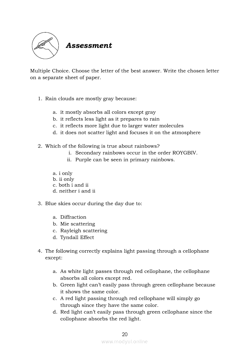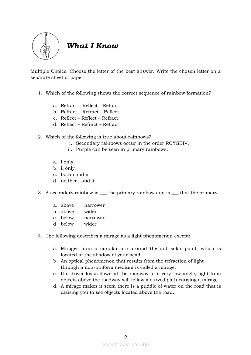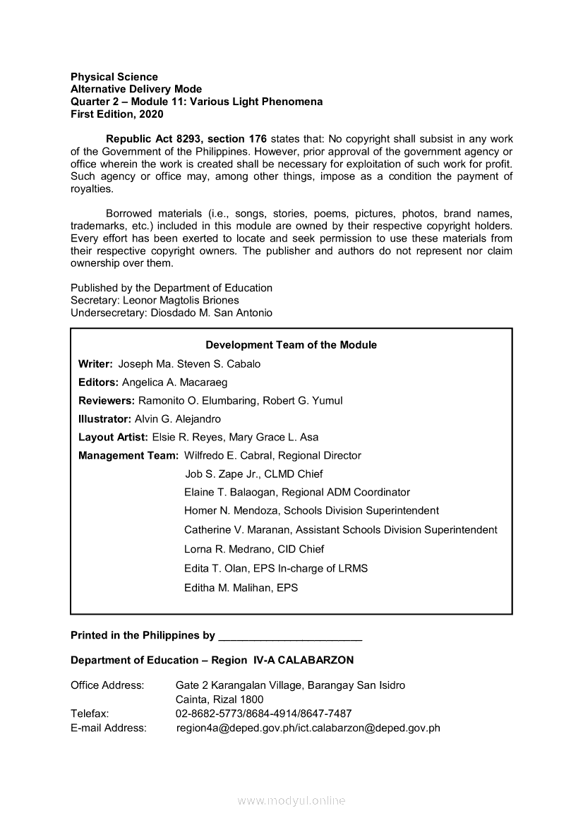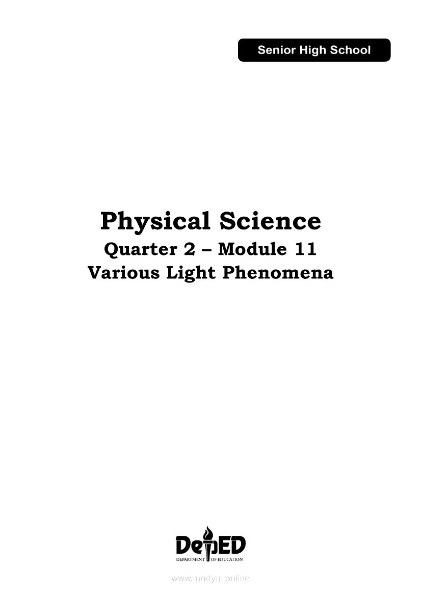 Physical Science Quarter 2 – Module 11 Various Light PhenomenaApr 22, 2021 SHSGrab your copy of Collegio Advance - ULTIMATE Updated College Entrance Exam Reviewer and pass with flying colors 🎉. Physical ScienceRelatedPhysical Science Module 13: Use of the Other Ingredients in Cleaning AgentsPhysical Science Quarter 2 – Module 10 The Wave Nature of LightPhysical Science Quarter 2 – Module 17:How We Know That We Live In An Expanding UniversePhysical Science Module 3: Polarity of MoleculesPhysical Science Quarter 2 – Module 8: Photon Concept and Its Practical Application