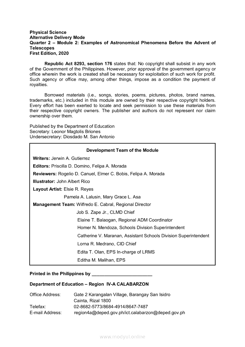 Physical Science Quarter 2 – Module 2: Examples of Astronomical Phenomena Before the Advent of TelescopesApr 22, 2021 SHSGrab your copy of Collegio Advance - ULTIMATE Updated College Entrance Exam Reviewer and pass with flying colors 🎉. Physical ScienceRelatedPhysical Science Module 7: Biological MacromoleculesPhysical Science Quarter 2 – Module 14: The Consequences of the Postulates of Special Relativity TheoryPhysical Science Quarter 2 – Module 12 Radio WavesPhysical Science Module 8: Collision Theory and Chemical Reaction RatePhysical Science Quarter 2 – Module 10 The Wave Nature of Light