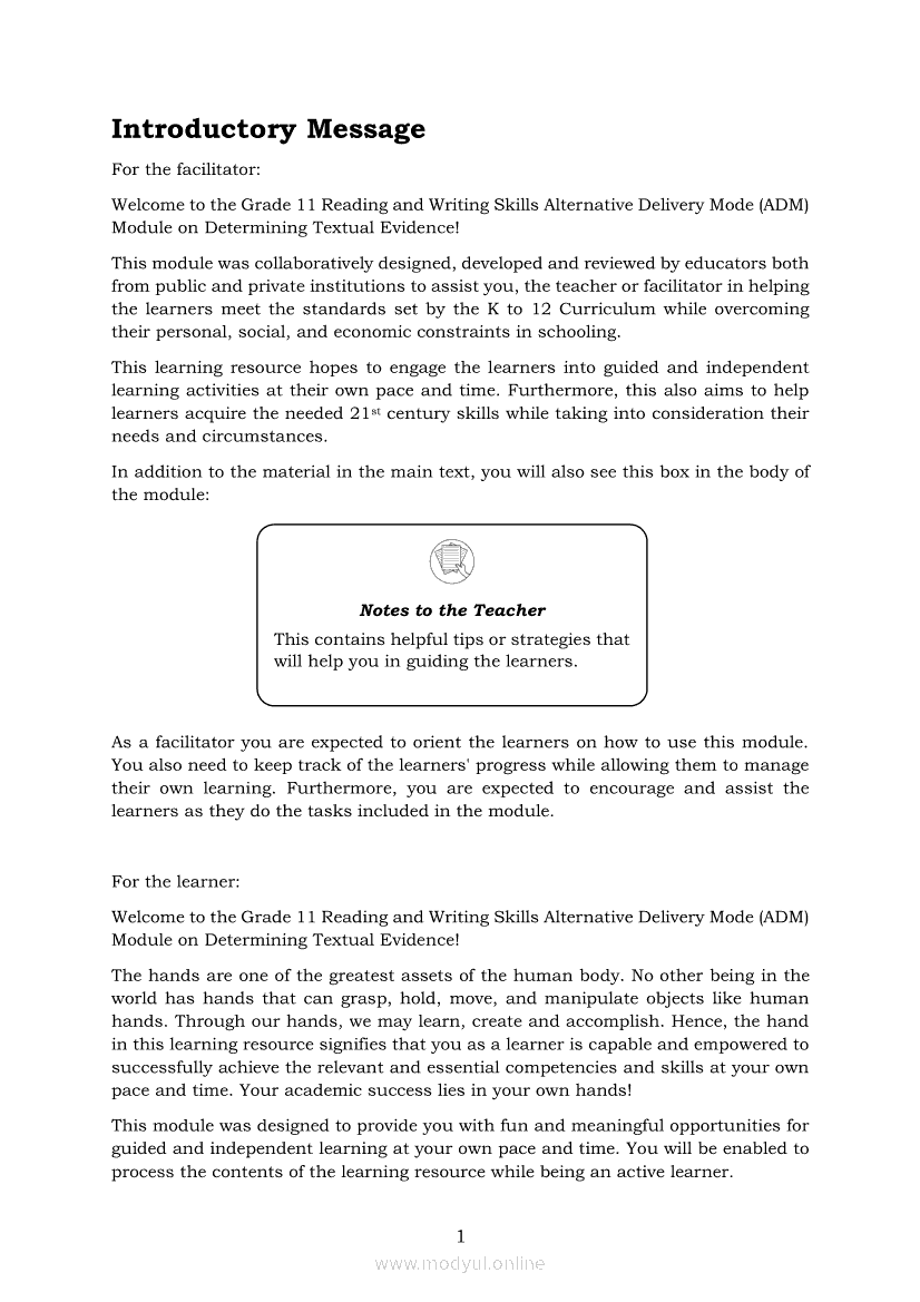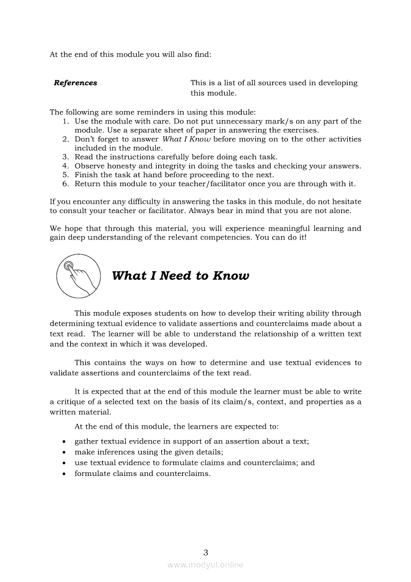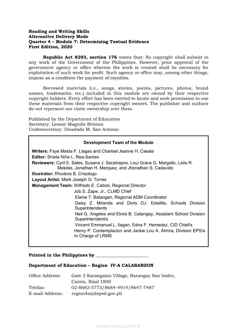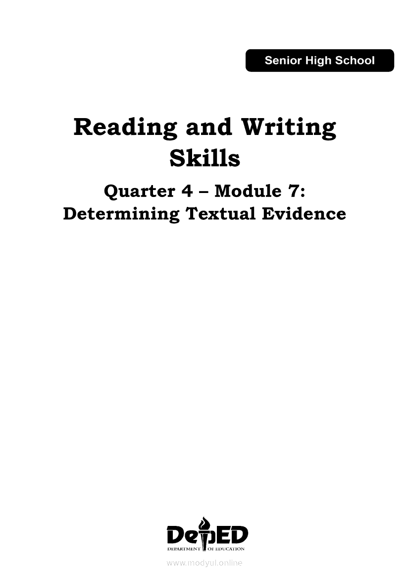 Reading and Writing Skills Quarter 4 – Module 7: Determining Textual EvidenceApr 22, 2021 SHSGrab your copy of Collegio Advance - ULTIMATE Updated College Entrance Exam Reviewer and pass with flying colors 🎉. Reading and Writing SkillsRelatedReading and Writing Skills PIVOT-ModuleReading and Writing Skills Quarter 4 – Module 4: Hypertext and IntertextReading and Writing Skills Quarter 4 – Module 5: Critical Reading as ReasoningReading and Writing Skills Quarter 4 – Module 8: Composing Academic WritingReading and Writing Skills Quarter 4 – Module 9: Composing Professional Correspondence