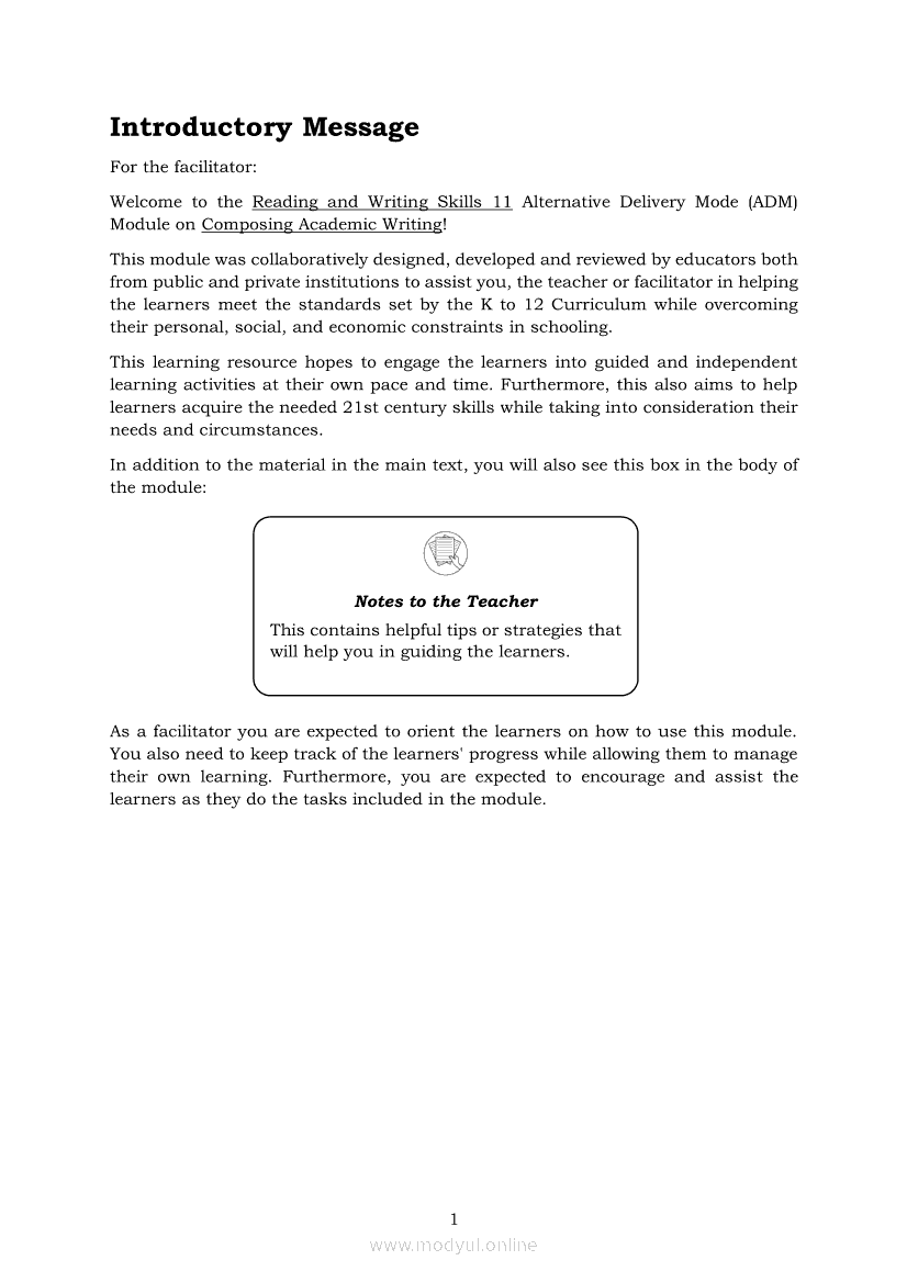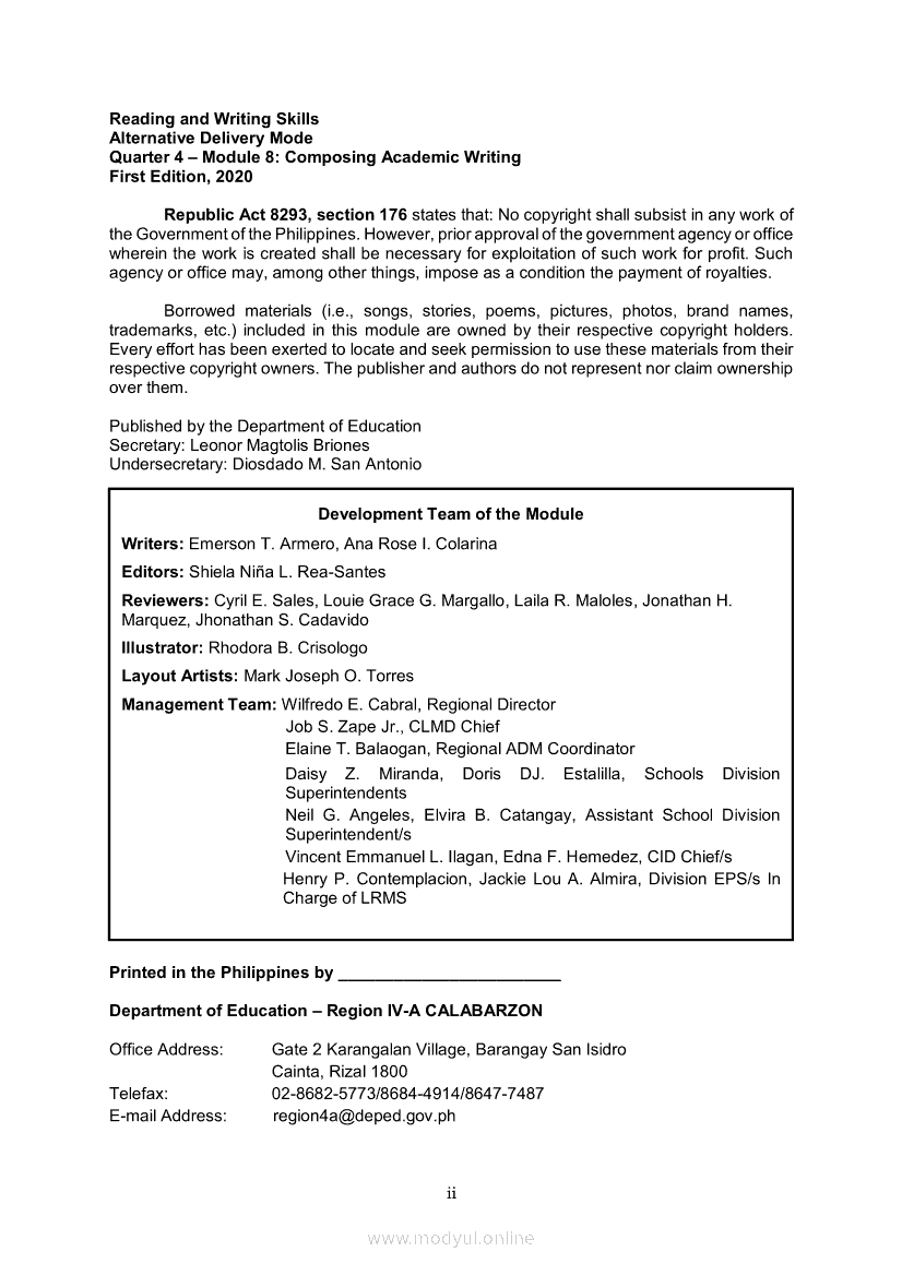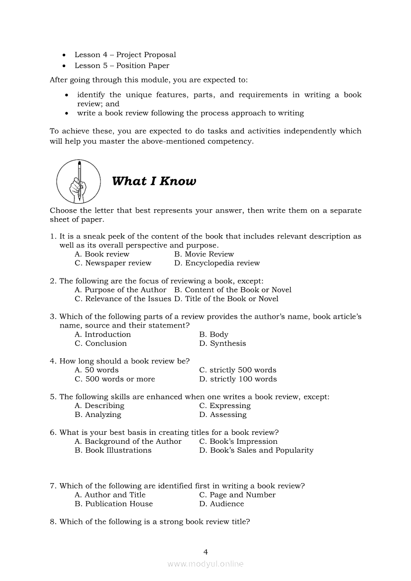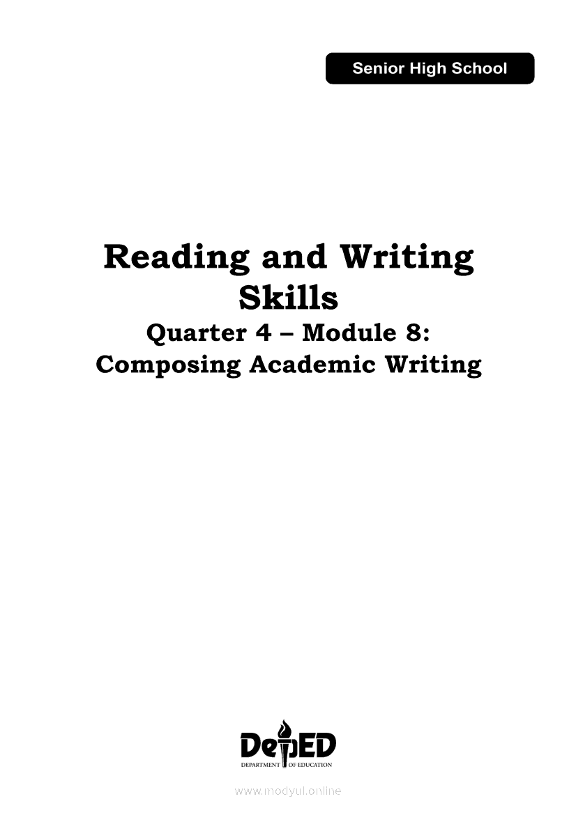Reading and Writing Skills Quarter 4 – Module 8: Composing Academic WritingApr 22, 2021 SHSGrab your copy of Collegio Advance - ULTIMATE Updated College Entrance Exam Reviewer and pass with flying colors 🎉. Reading and Writing SkillsRelatedReading and Writing Skills Quarter 4 – Module 4: Hypertext and IntertextReading and Writing Skills Quarter 4 – Module 5: Critical Reading as ReasoningReading and Writing Skills Quarter 4 – Module 7: Determining Textual EvidenceReading and Writing Skills Quarter 4 – Module 6: Formulating Evaluative StatementsReading and Writing Skills Quarter 4 – Module 9: Composing Professional Correspondence