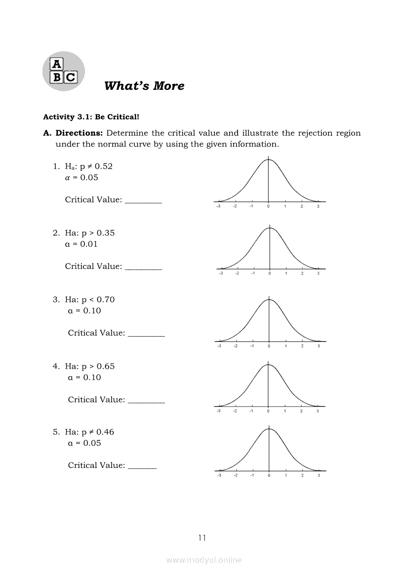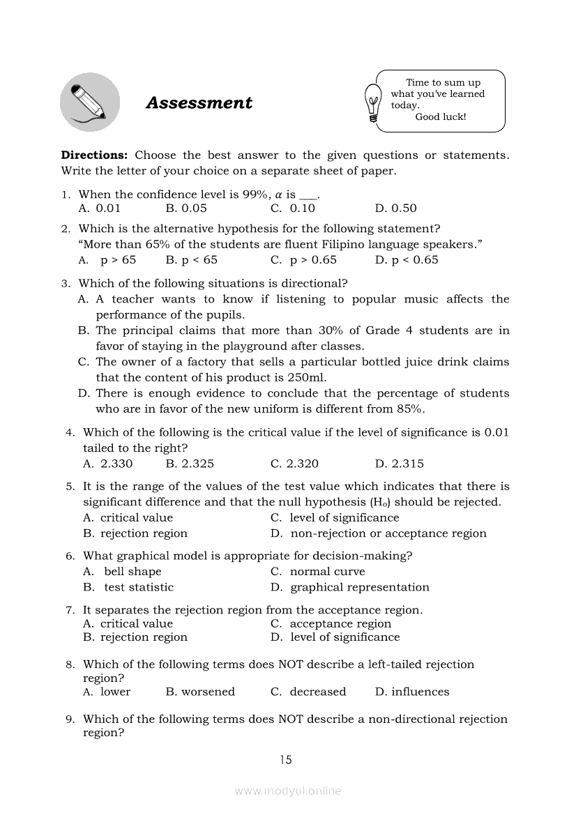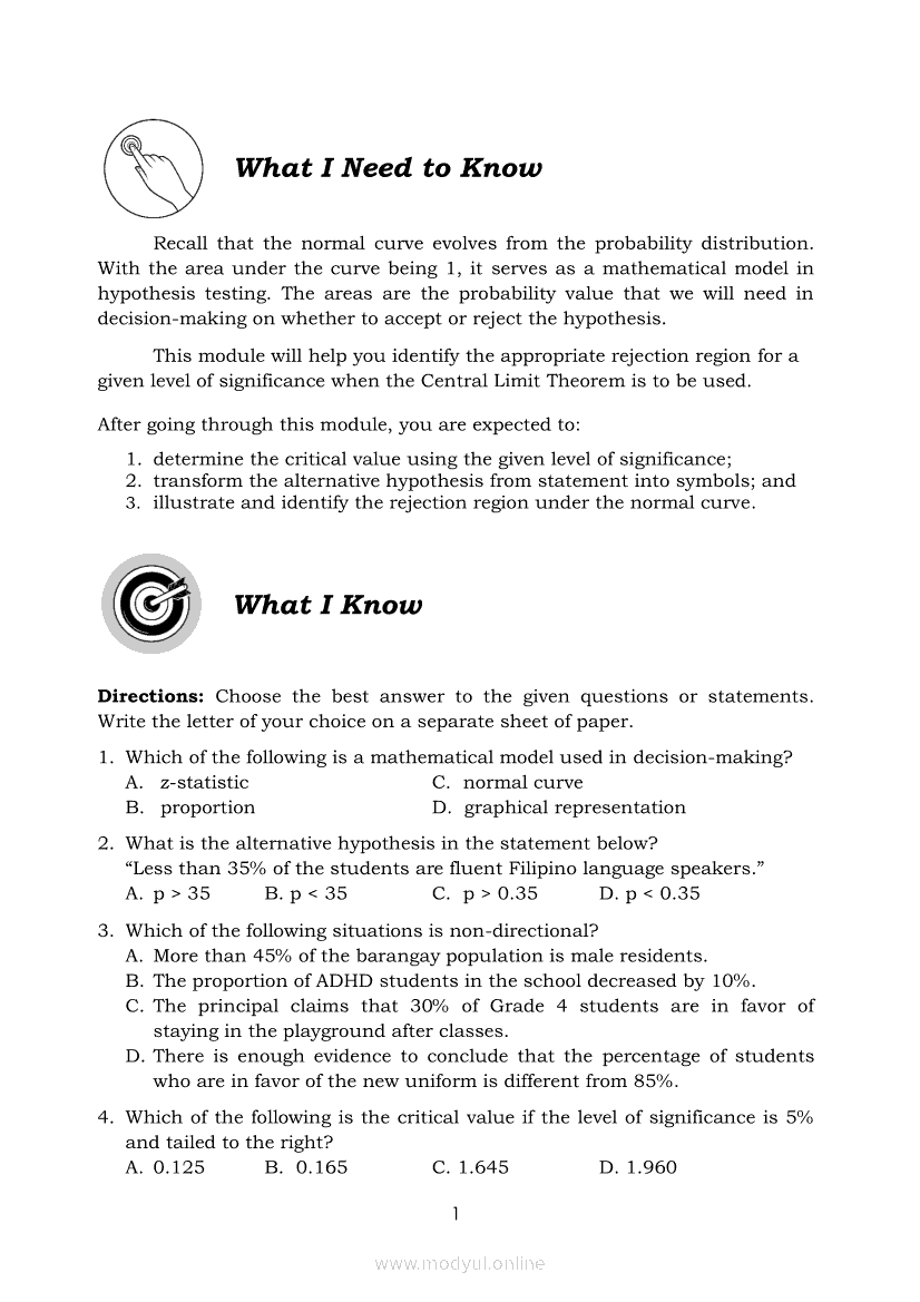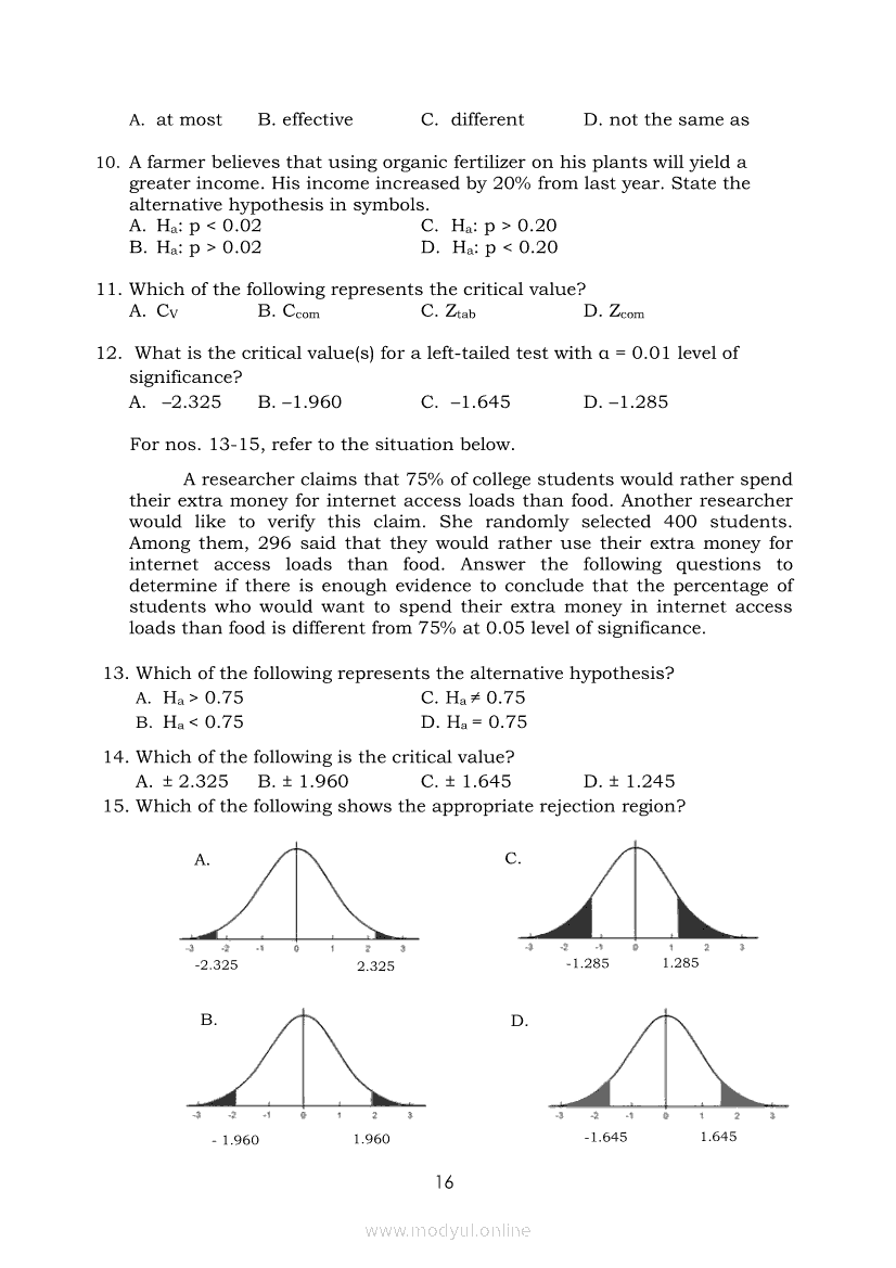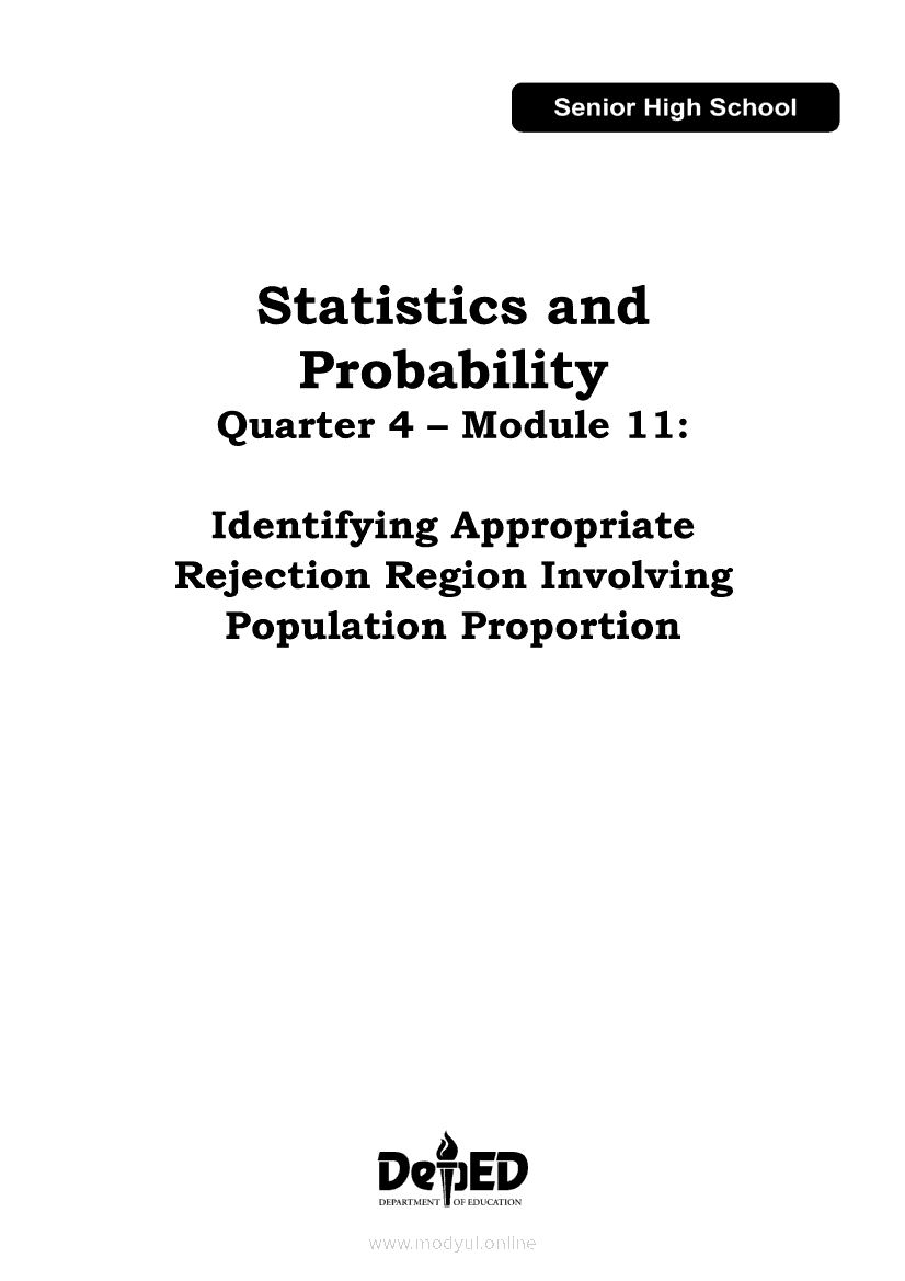Statistics and Probability Module 10: Identifying Appropriate Test Statistic Involving Population ProportionApr 22, 2021 SHSGrab your copy of Collegio Advance - ULTIMATE Updated College Entrance Exam Reviewer and pass with flying colors 🎉. Statistics and ProbabilityRelatedStatistics and Probability Module 12: Computing Test Statistic Value Involving Population ProportionStatistics and Probability Module 8: Solving Problems Involving Test of Hypothesis on Population MeanStatistics and Probability Module 11: Identifying Appropriate Rejection Region Involving Population ProportionStatistics and Probability Module 14: Solving Problems Involving Test of Hypothesis on Population ProportionStatistics and Probability Module 2: Identifying Parameters for Testing in Given Real-Life Problems