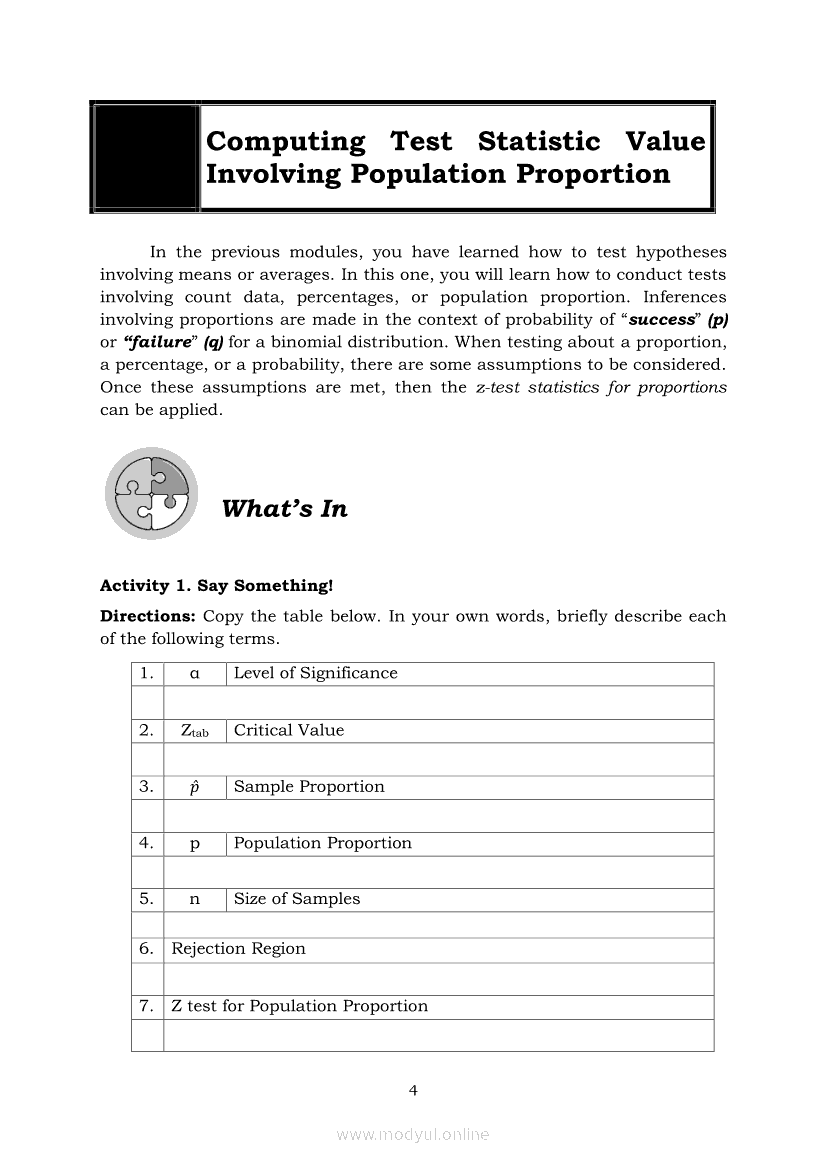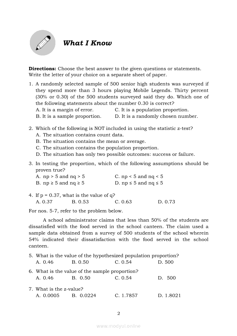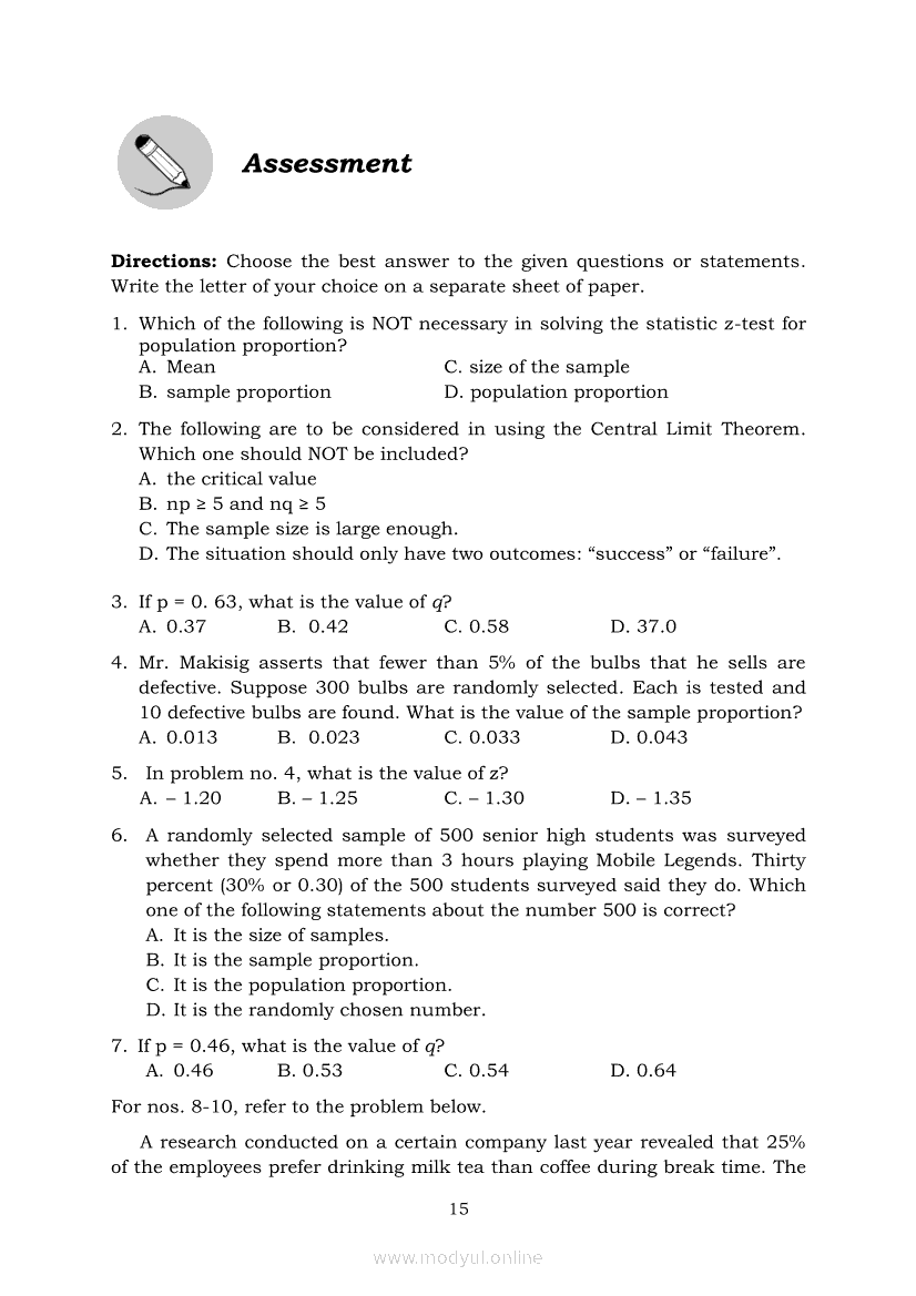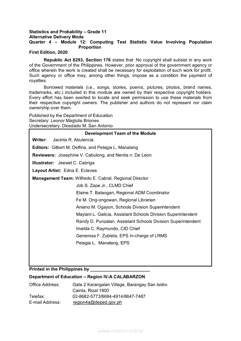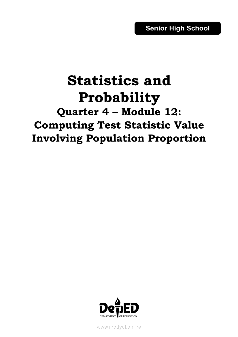Statistics and Probability Module 13: Drawing Conclusions About Population Proportion Based on Test Statistic Value and Rejection RegionApr 22, 2021 SHSGrab your copy of Collegio Advance - ULTIMATE Updated College Entrance Exam Reviewer and pass with flying colors 🎉. Statistics and ProbabilityRelatedStatistics and Probability Module 7: Drawing Conclusion About Population Mean Based on Test Statistic Value and Critical RegionStatistics and Probability Module 2: Identifying Parameters for Testing in Given Real-Life ProblemsStatistics and Probability Module 9: Formulating Appropriate Null and Alternative Hypotheses on a Population ProportionStatistics and Probability Module 14: Solving Problems Involving Test of Hypothesis on Population ProportionStatistics and Probability Module 15: Illustrating the Nature of Bivariate Data
