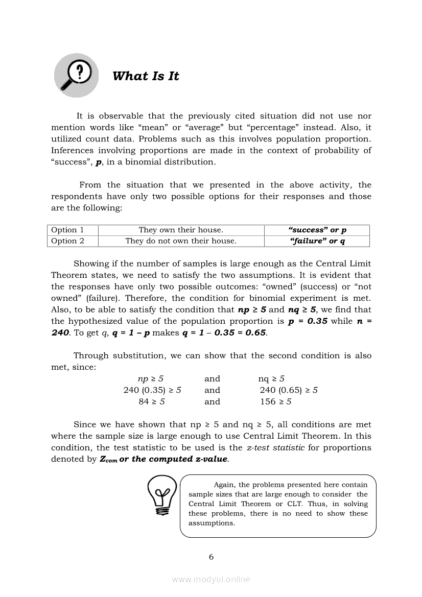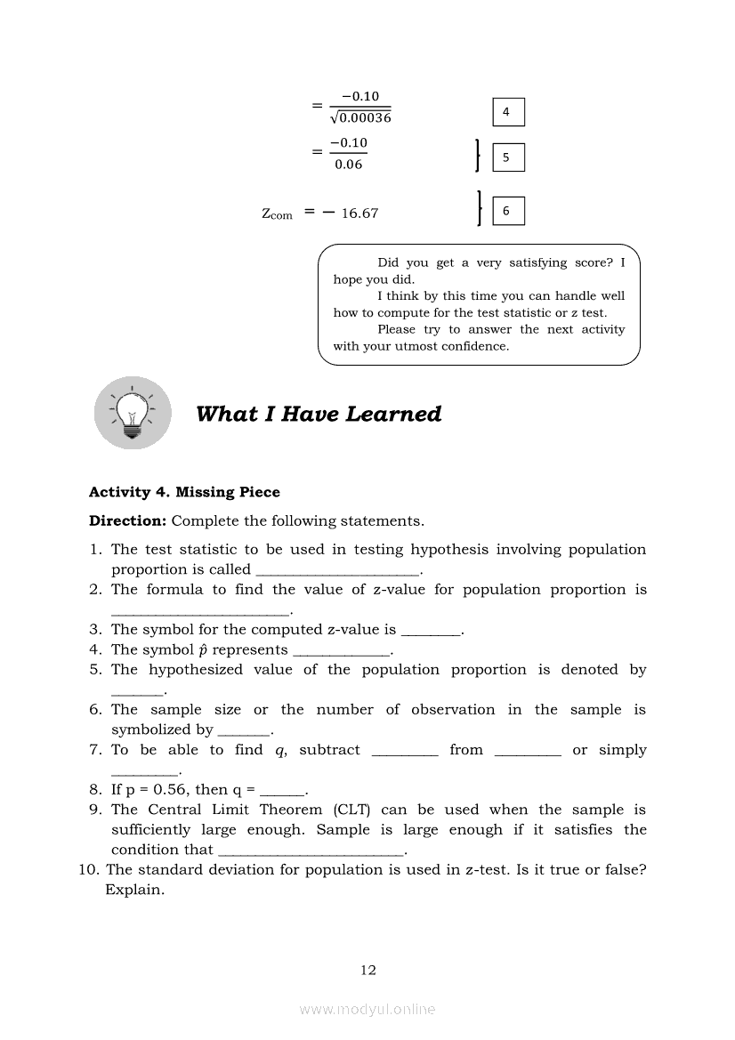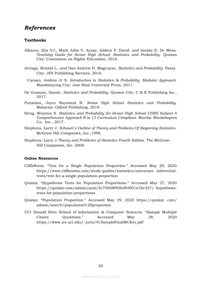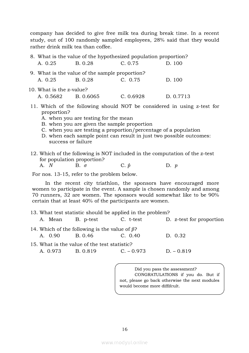 Statistics and Probability Module 13: Drawing Conclusions About Population Proportion Based on Test Statistic Value and Rejection RegionApr 22, 2021 SHSGrab your copy of Collegio Advance - ULTIMATE Updated College Entrance Exam Reviewer and pass with flying colors 🎉. Statistics and ProbabilityRelatedStatistics and Probability Module 7: Drawing Conclusion About Population Mean Based on Test Statistic Value and Critical RegionStatistics and Probability Module 2: Identifying Parameters for Testing in Given Real-Life ProblemsStatistics and Probability Module 9: Formulating Appropriate Null and Alternative Hypotheses on a Population ProportionStatistics and Probability Module 14: Solving Problems Involving Test of Hypothesis on Population ProportionStatistics and Probability Module 15: Illustrating the Nature of Bivariate Data