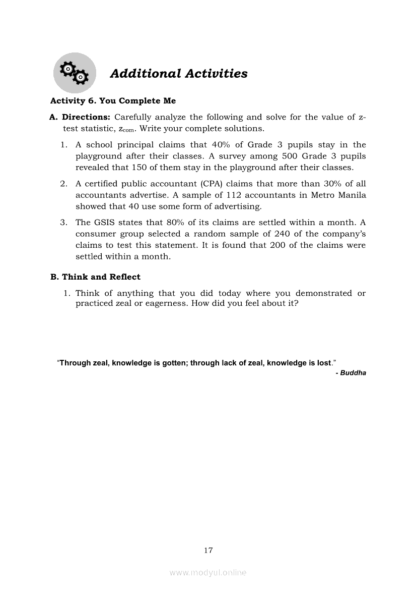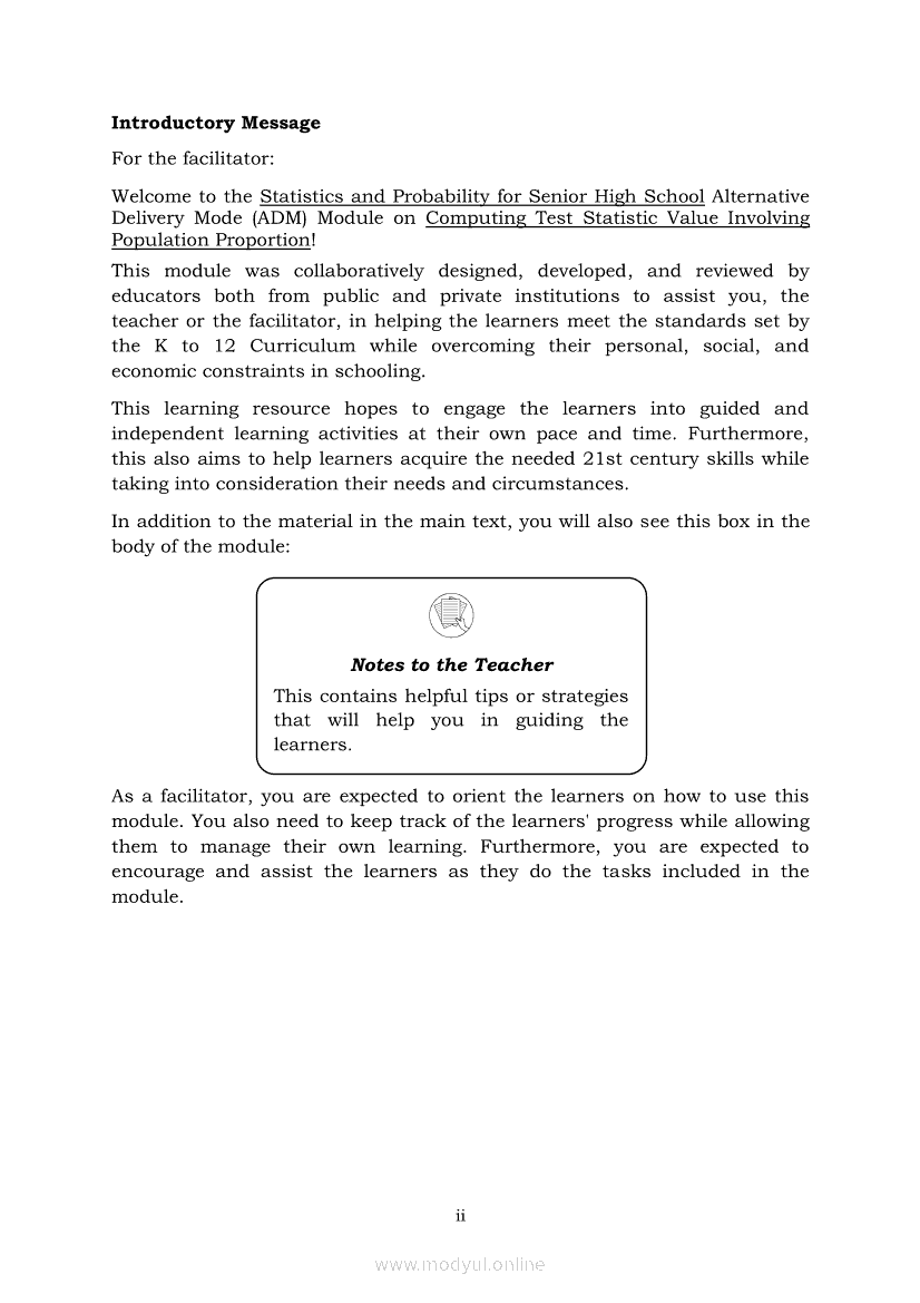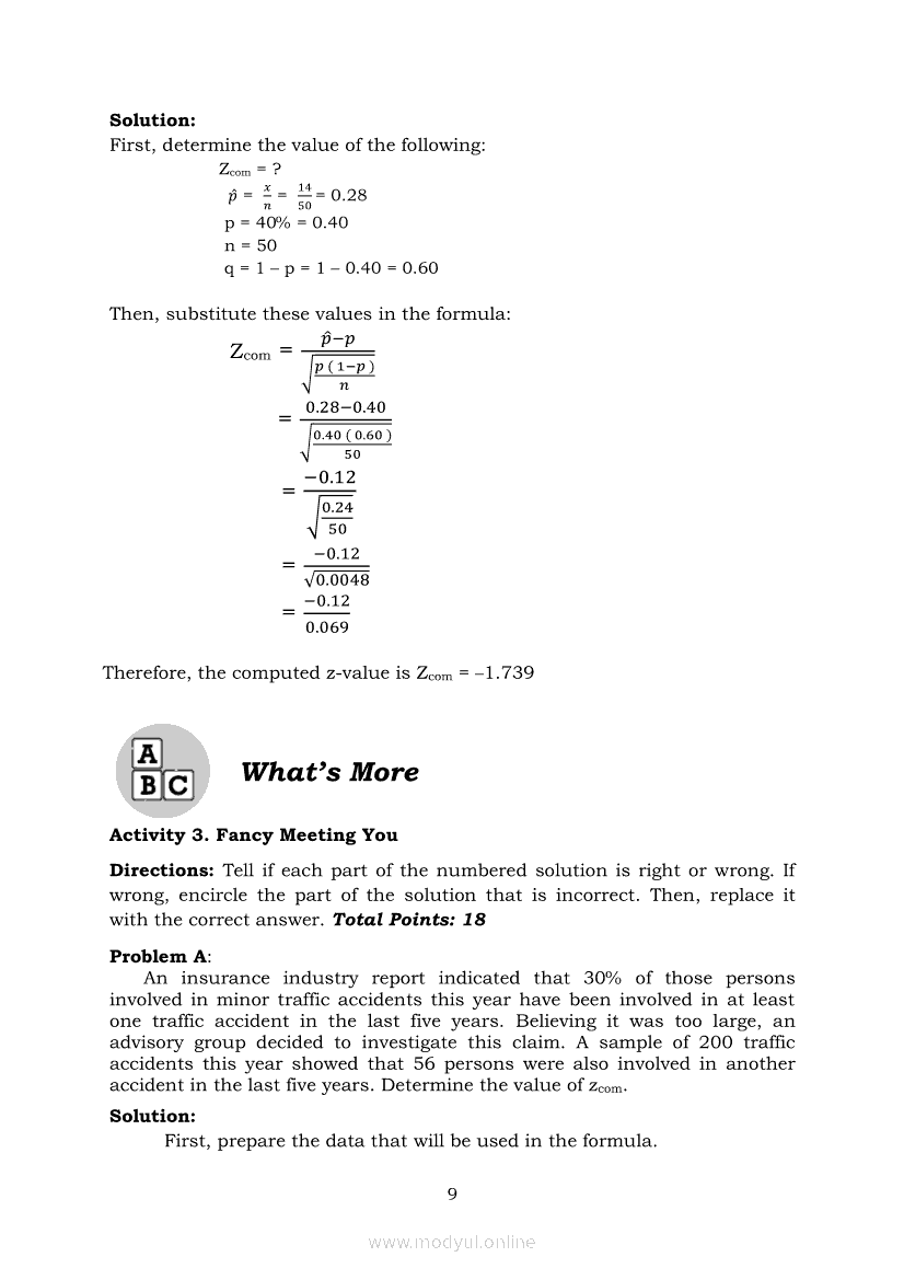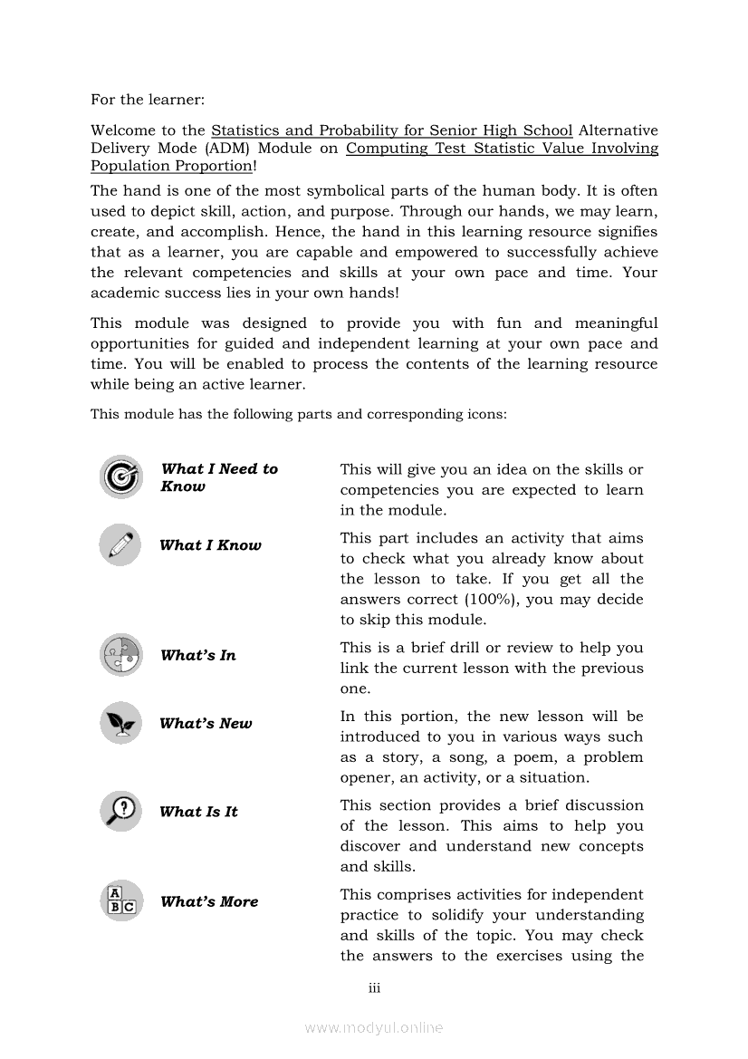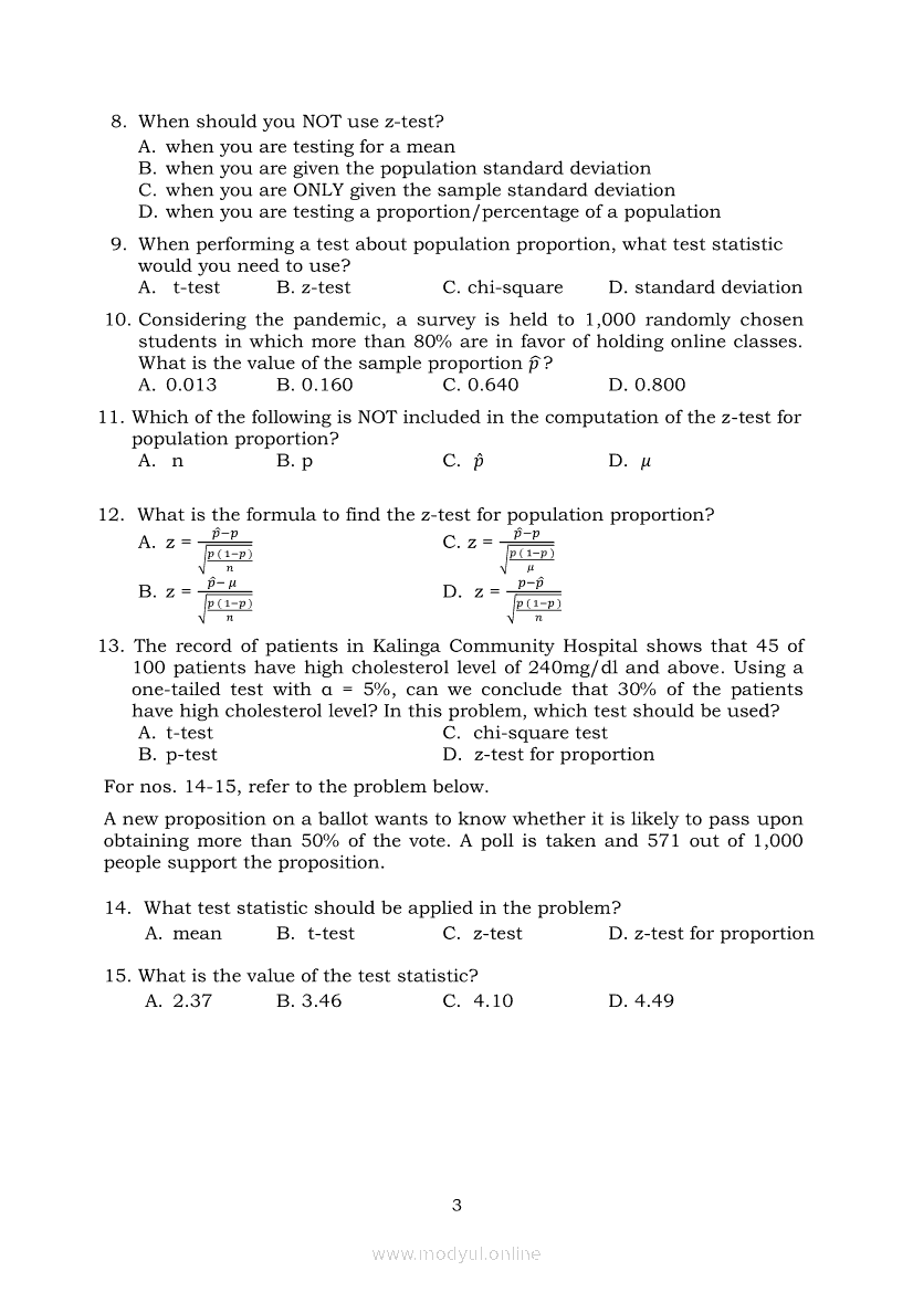 Statistics and Probability Module 13: Drawing Conclusions About Population Proportion Based on Test Statistic Value and Rejection RegionApr 22, 2021 SHSGrab your copy of Collegio Advance - ULTIMATE Updated College Entrance Exam Reviewer and pass with flying colors 🎉. Statistics and ProbabilityRelatedStatistics and Probability Module 7: Drawing Conclusion About Population Mean Based on Test Statistic Value and Critical RegionStatistics and Probability Module 2: Identifying Parameters for Testing in Given Real-Life ProblemsStatistics and Probability Module 9: Formulating Appropriate Null and Alternative Hypotheses on a Population ProportionStatistics and Probability Module 14: Solving Problems Involving Test of Hypothesis on Population ProportionStatistics and Probability Module 15: Illustrating the Nature of Bivariate Data
