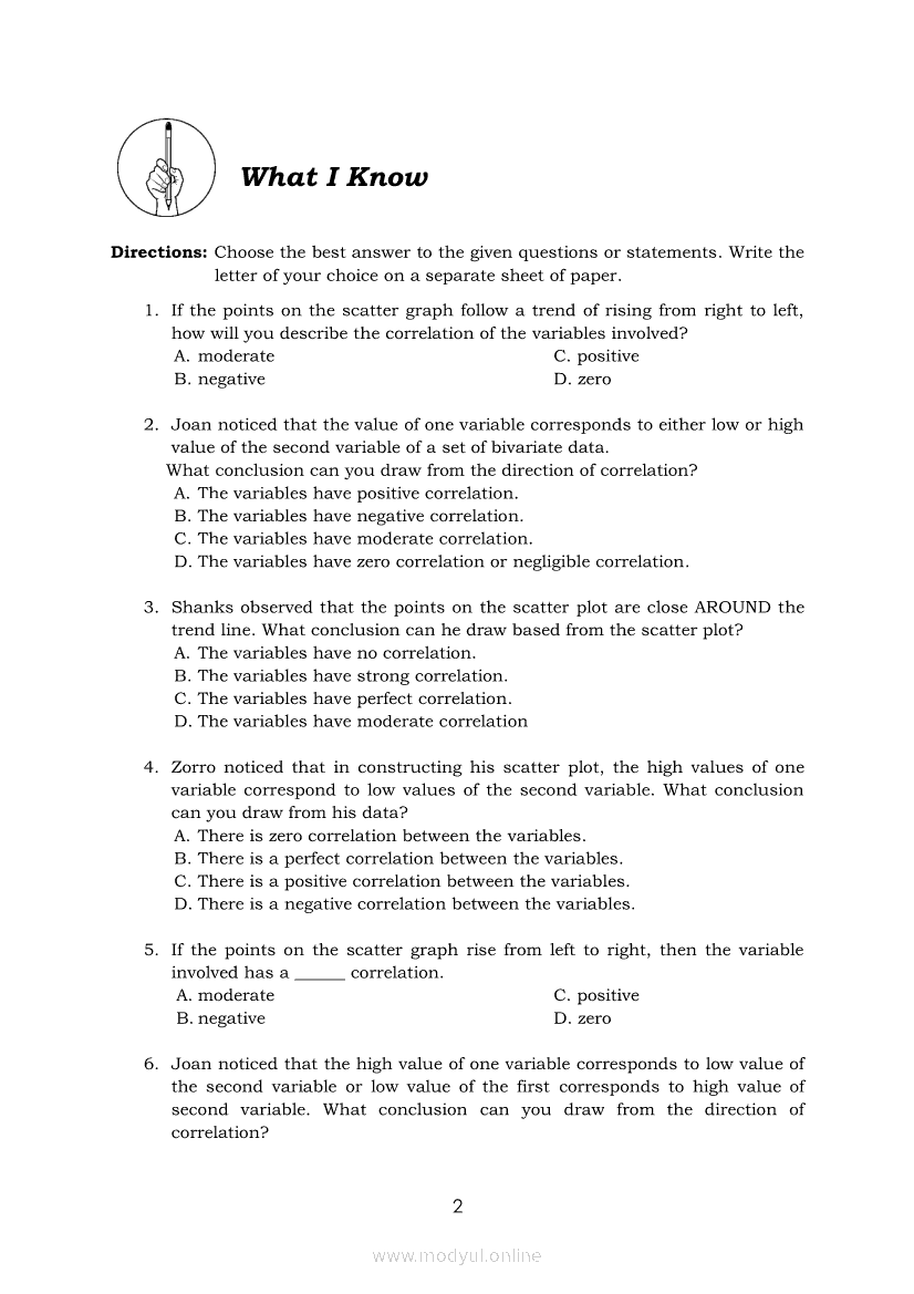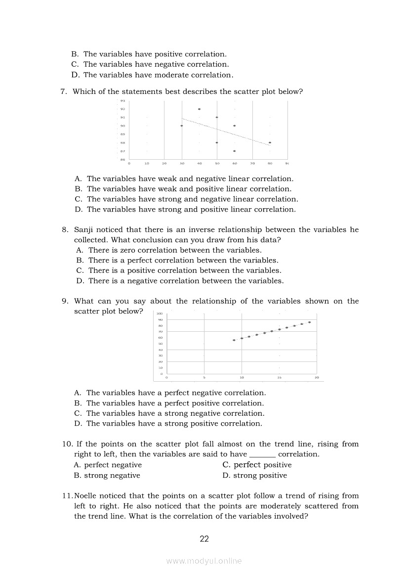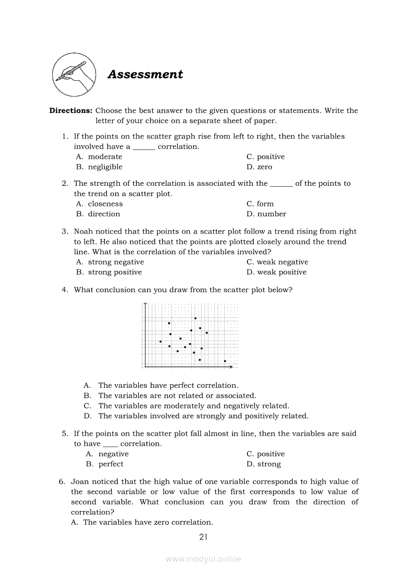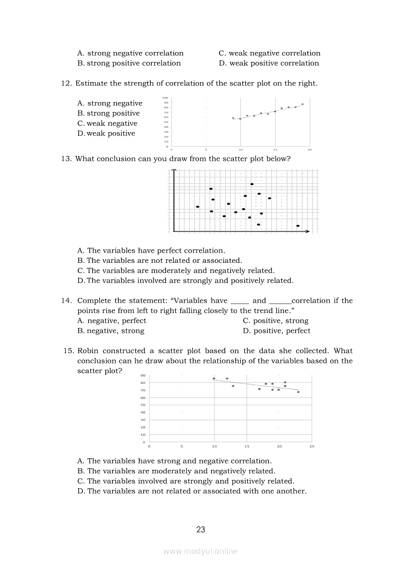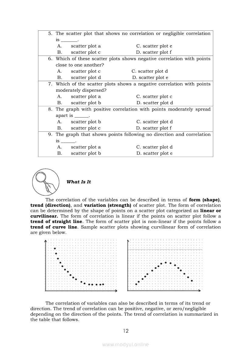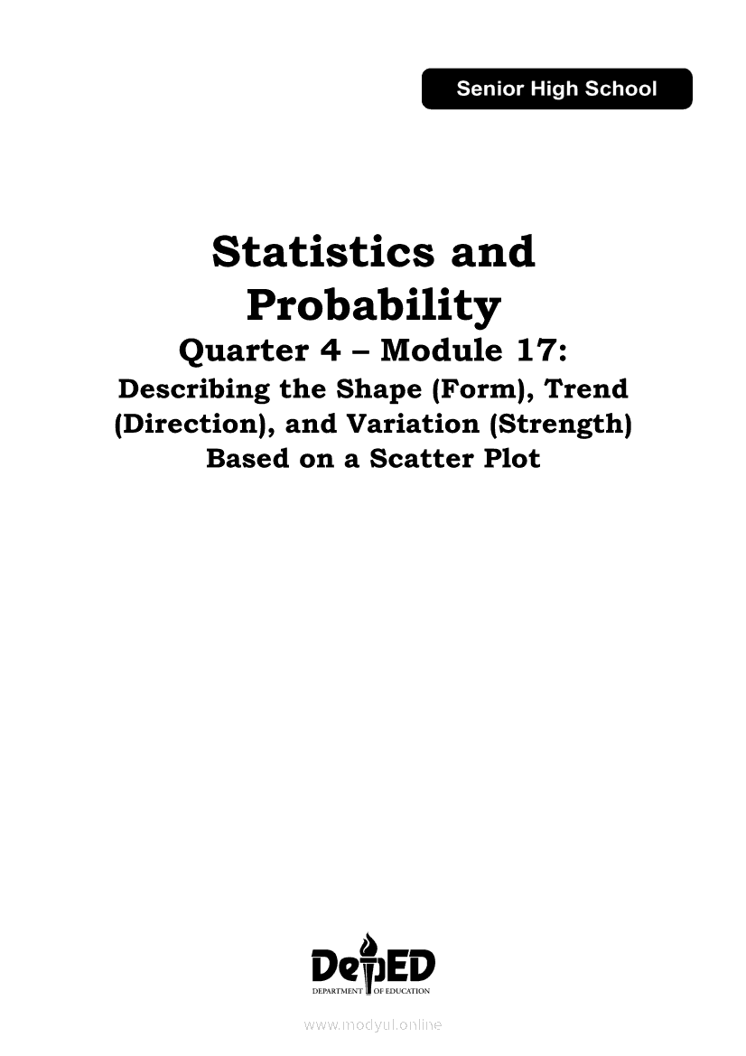 Statistics and Probability Module 17: Describing the Shape (Form), Trend (Direction), and Variation ( Strength) Based on a Scatter PlotApr 22, 2021 SHSGrab your copy of Collegio Advance - ULTIMATE Updated College Entrance Exam Reviewer and pass with flying colors 🎉. Statistics and ProbabilityRelatedStatistics and Probability Module 4: Identifying Appropriate Test Statistics Involving Population MeanStatistics and Probability Module 9: Formulating Appropriate Null and Alternative Hypotheses on a Population ProportionStatistics and Probability Module 7: Drawing Conclusion About Population Mean Based on Test Statistic Value and Critical RegionStatistics and Probability Module 1: Testing HypothesisStatistics and Probability Module 16: Constructing a Scatter Plot